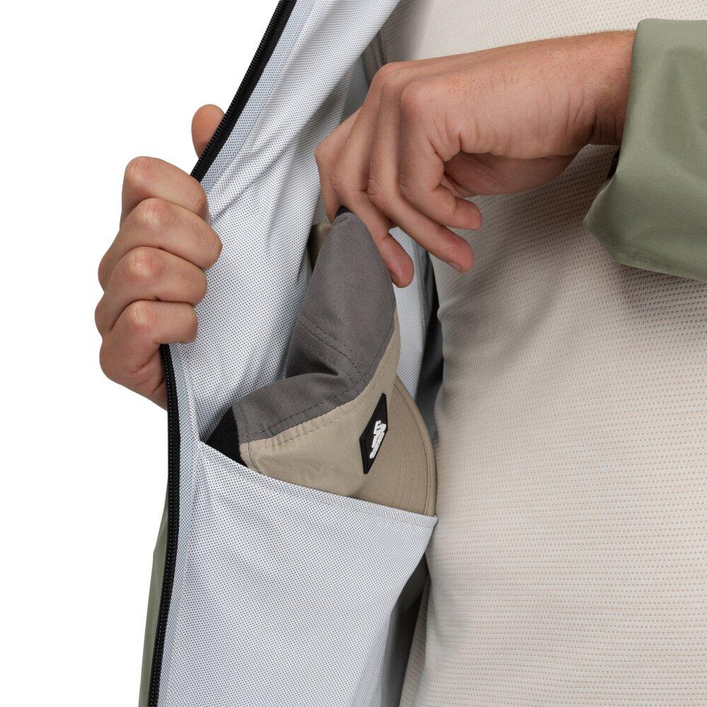 Ultralightweight hooded rain jacket for trekking and outdoor sports with 10K waterproof rating and 5K breathability. Sealed seams and waterproof main zipper. Compact and portable, features a self-stow
