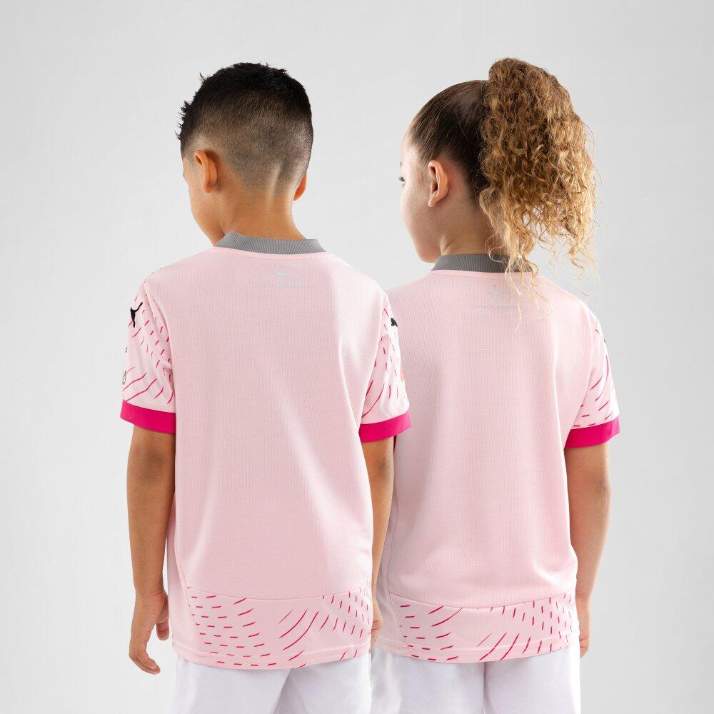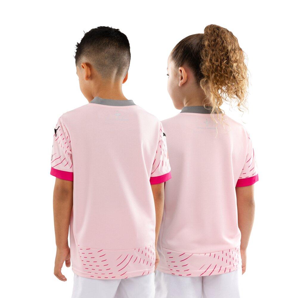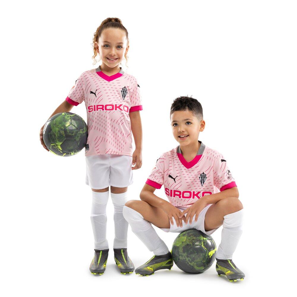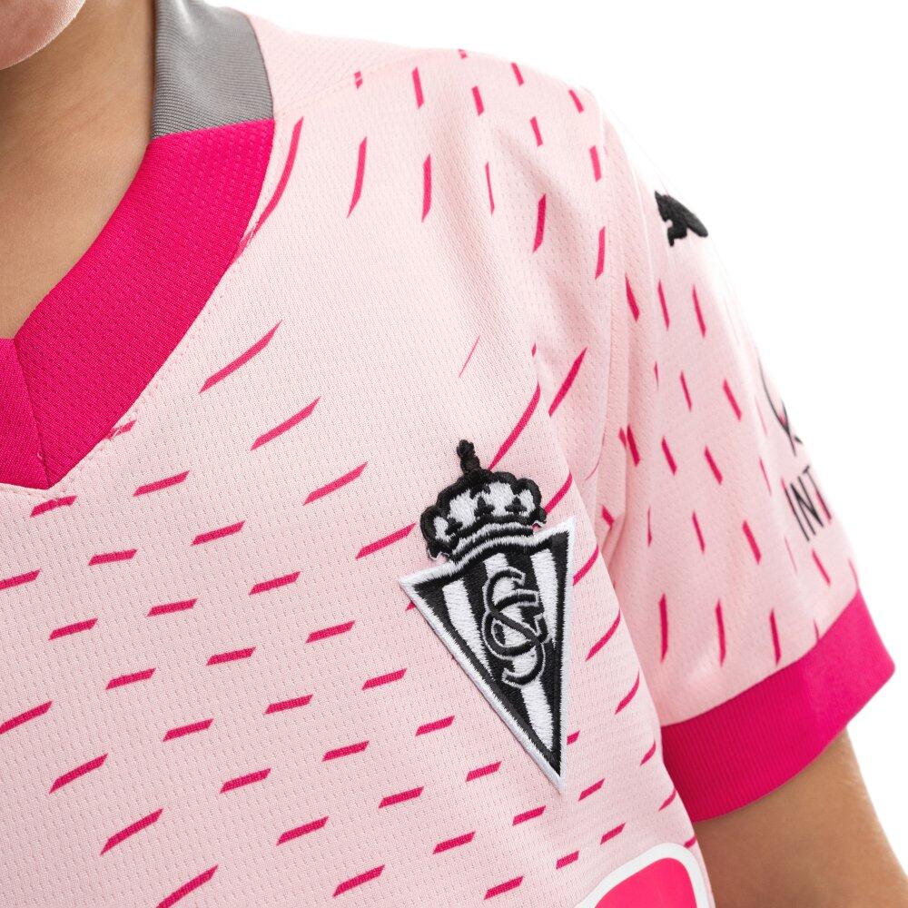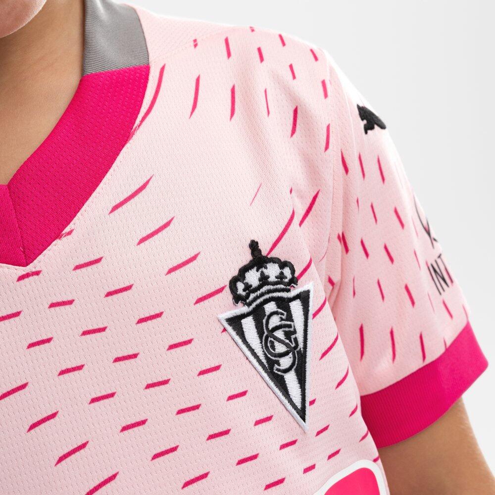 Puma football shirt for kids, part of the official Real Sporting de Gijón third kit for the 2024/2025 season. Innovative pink design. Comfortable and breathable, featuring a silver-tone crest and a V-