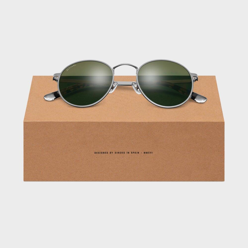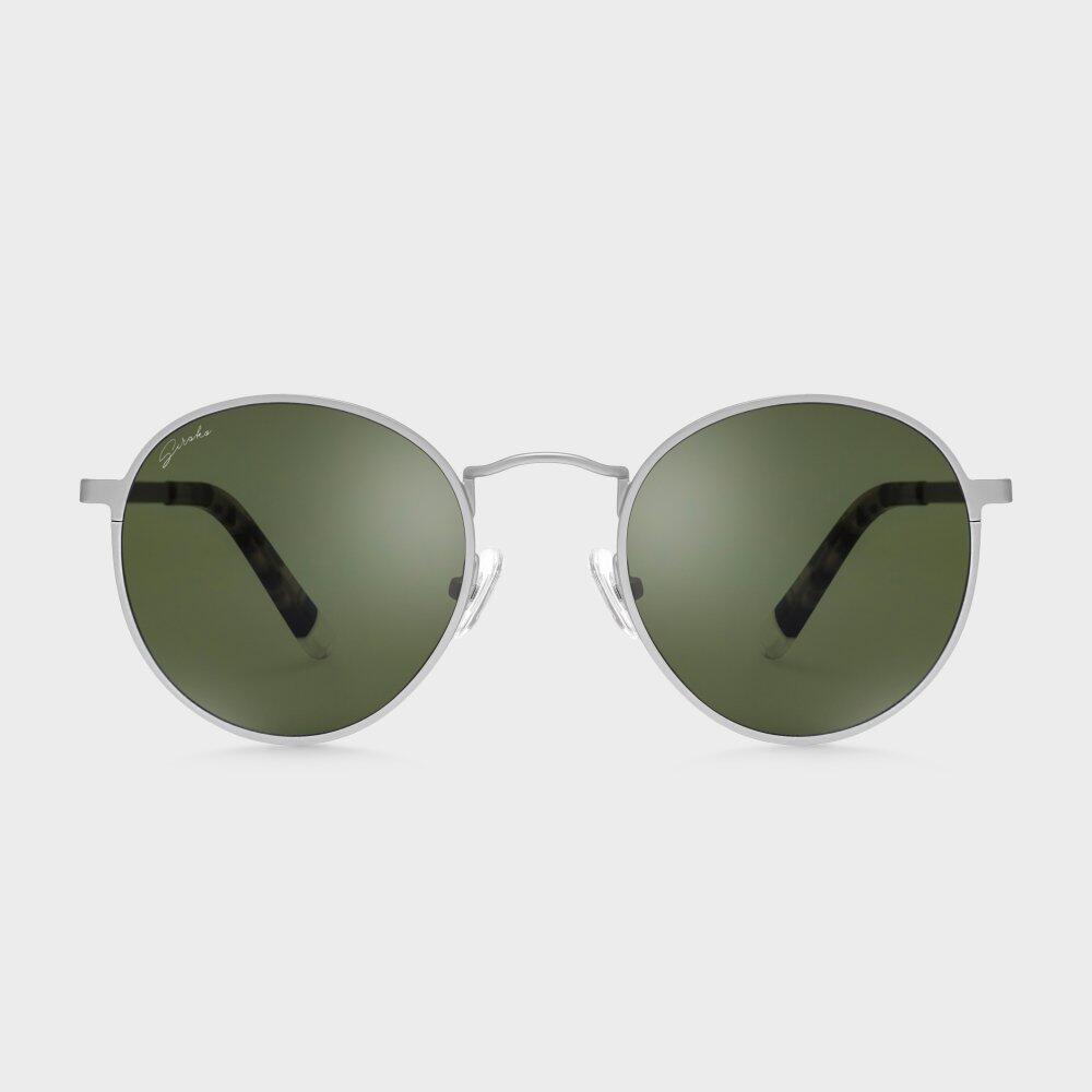 Unisex Hyde Park sunglasses with matte silver stainless steel frame, category 3 nylon lenses (UV400), acetate temples and microfiber pouch.