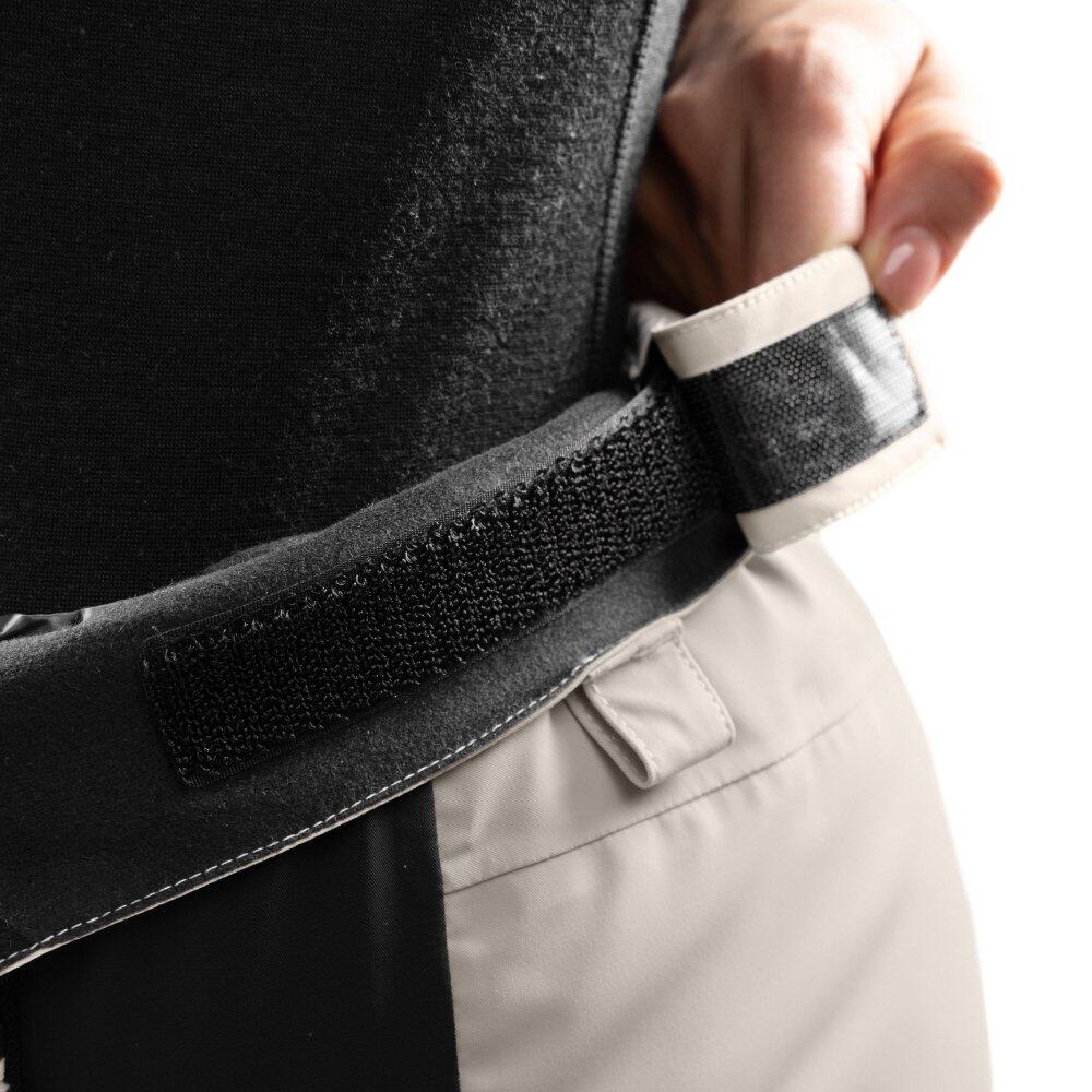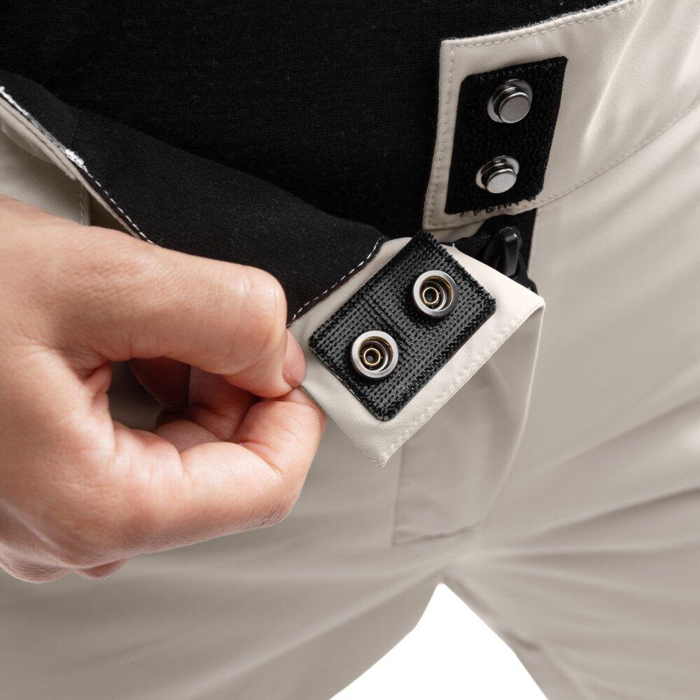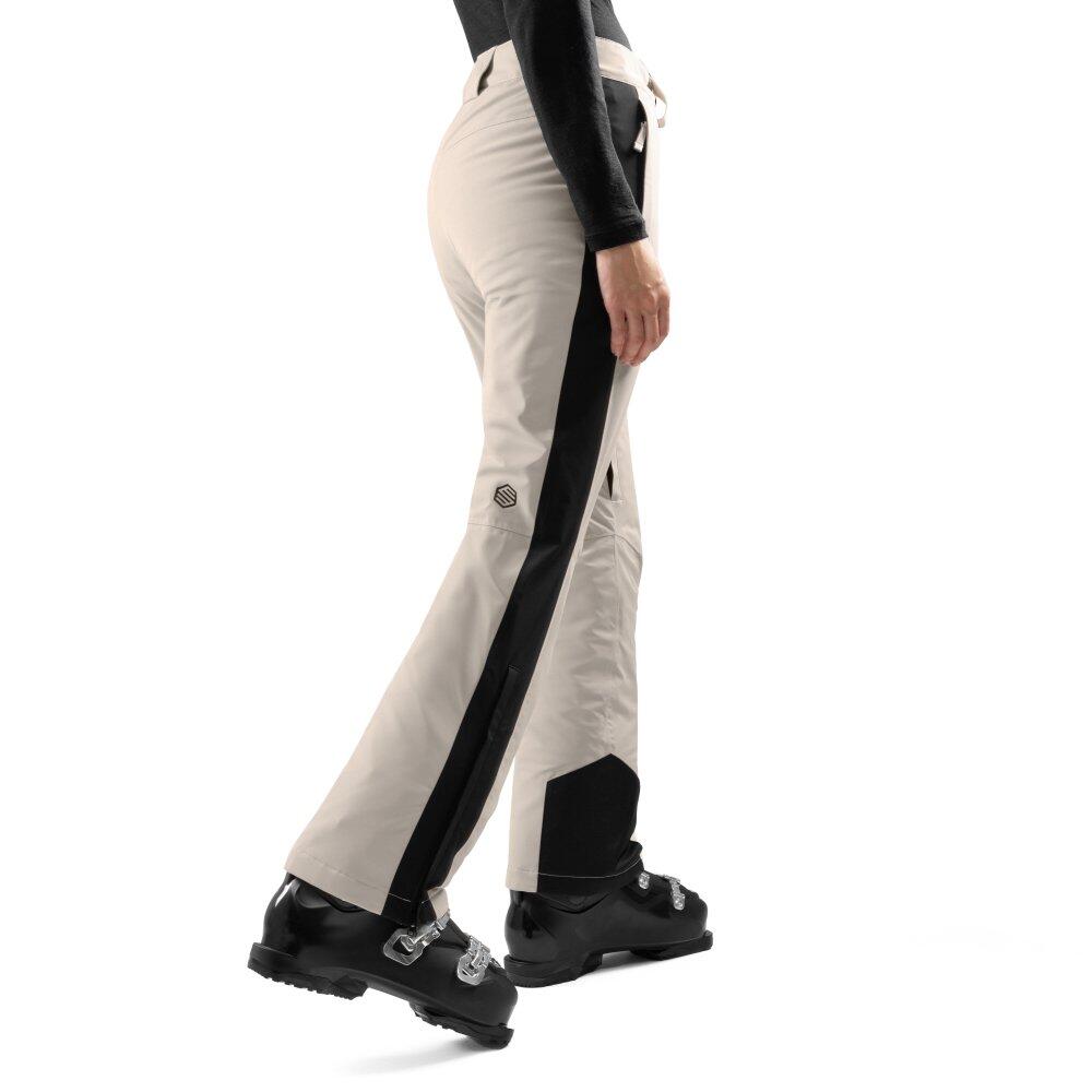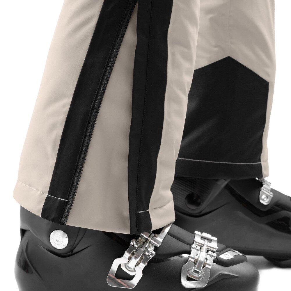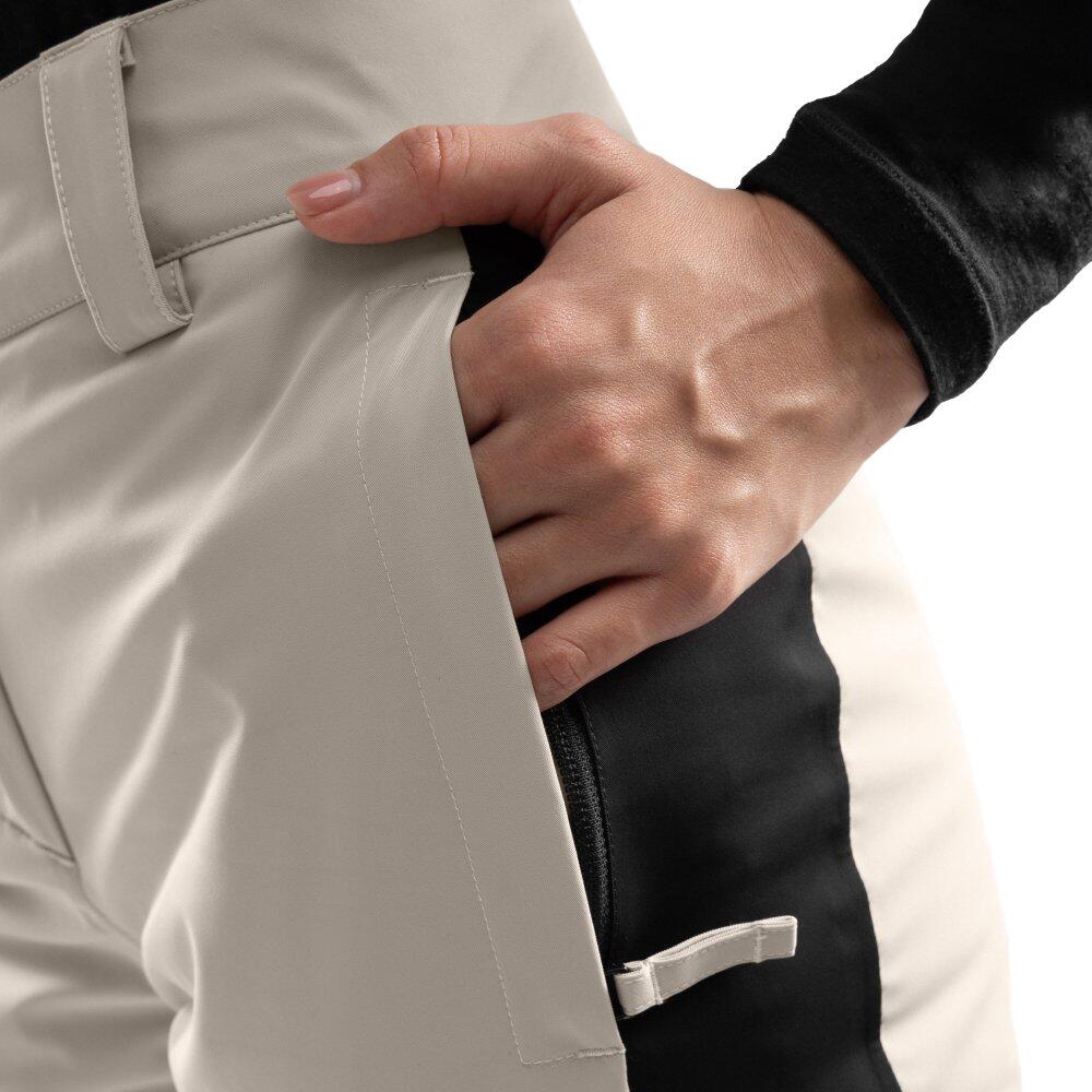 Beige women's waterproof and breathable ski trousers (15,000 mm / 15,000 g/m²) with Sorona® Aura insulation 80 g/m², pre-shaped knees and integrated gaiters for freestyle snowboarding.