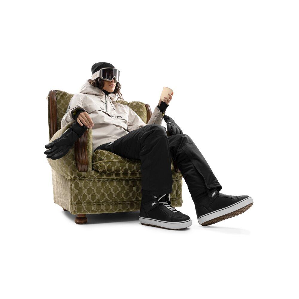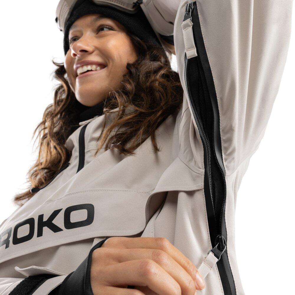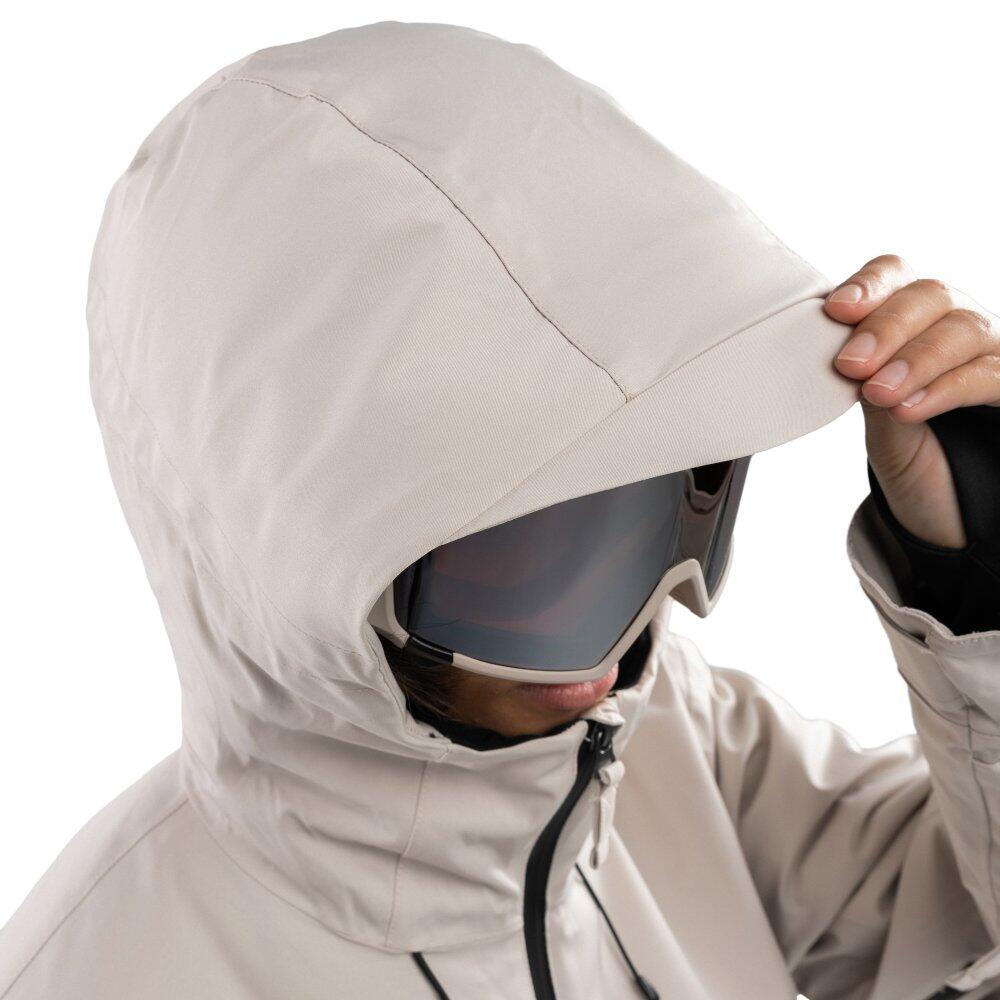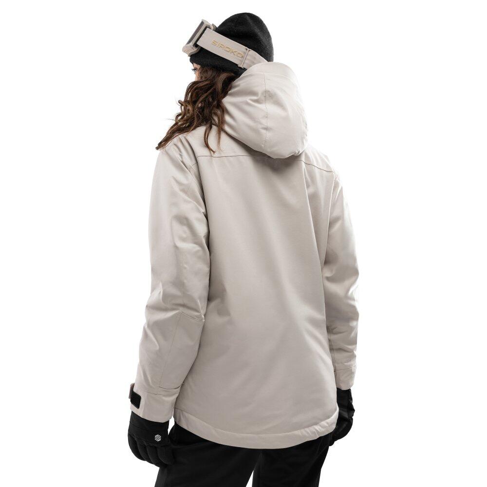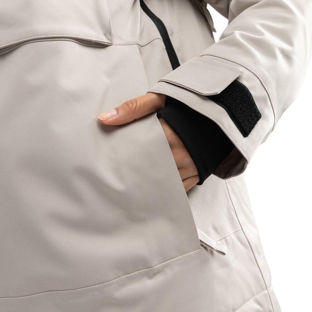 Women's beige snowboard jacket, waterproof 10,000 mm and breathable 10,000 g/m²/24h, Sorona® Aura insulation produced with responsible materials and numerous functional pockets.