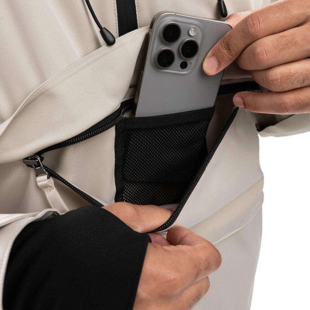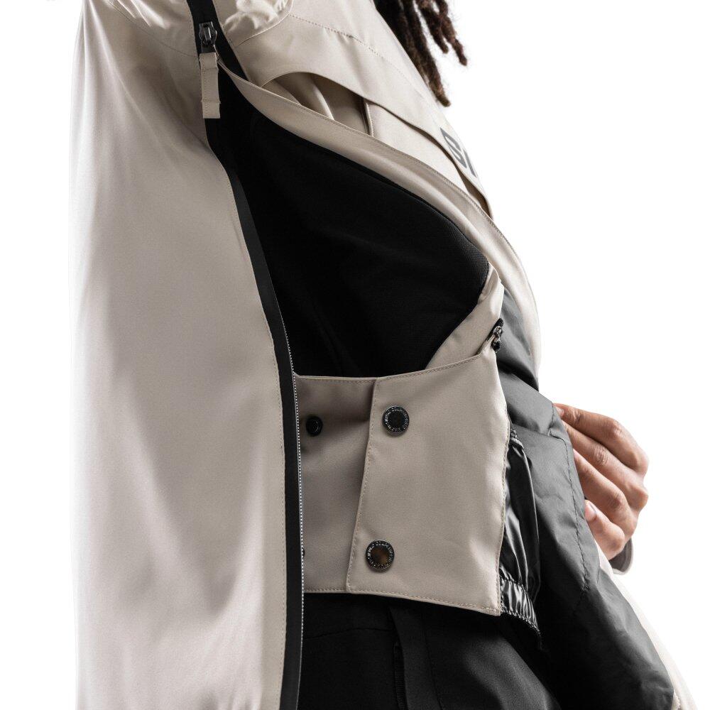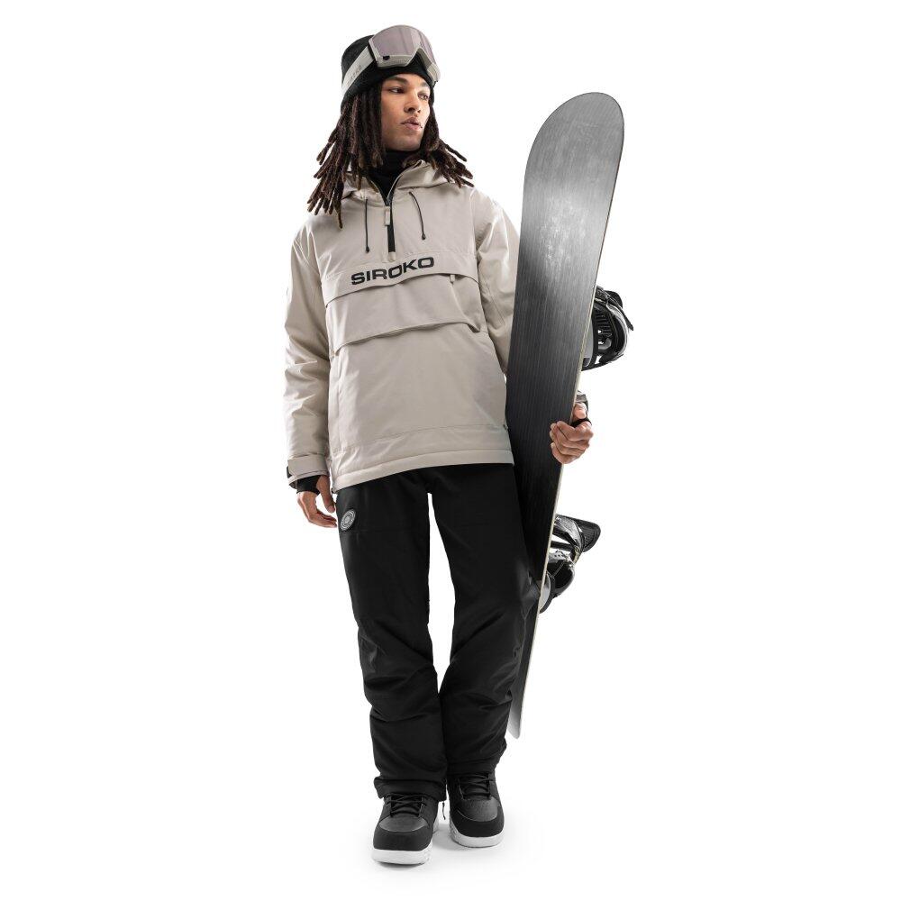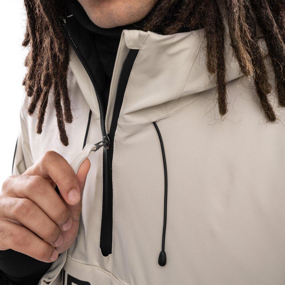 Beige men's snowboard jacket with Sorona® Aura insulation made from regenerative fibers, 10,000 mm waterproof and 10,000 g/m²/24h breathable; relaxed fit, adjustable hood and technical pockets.