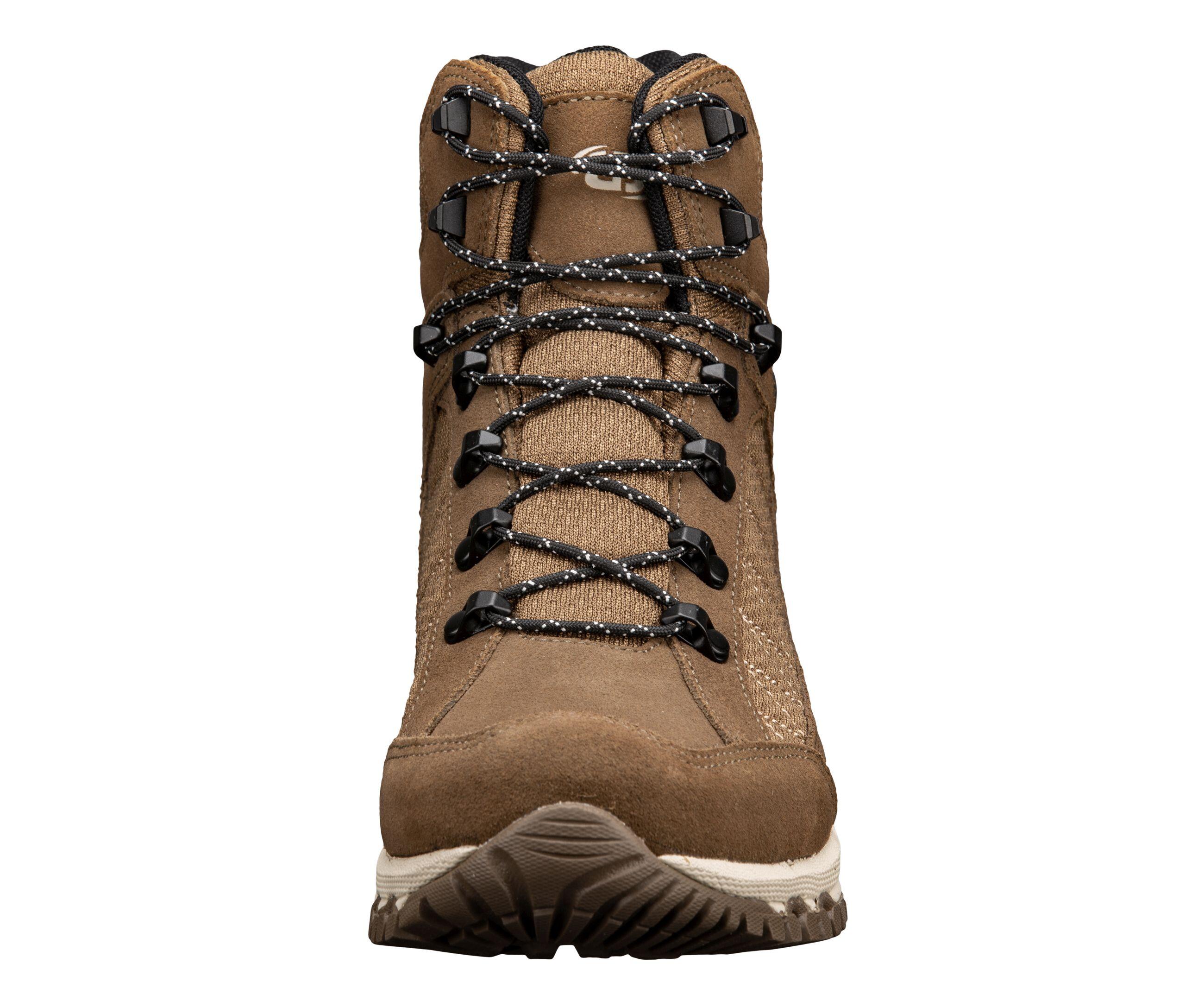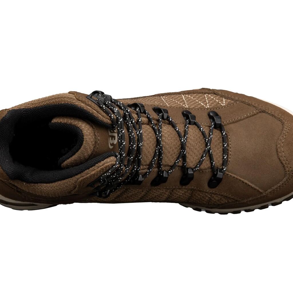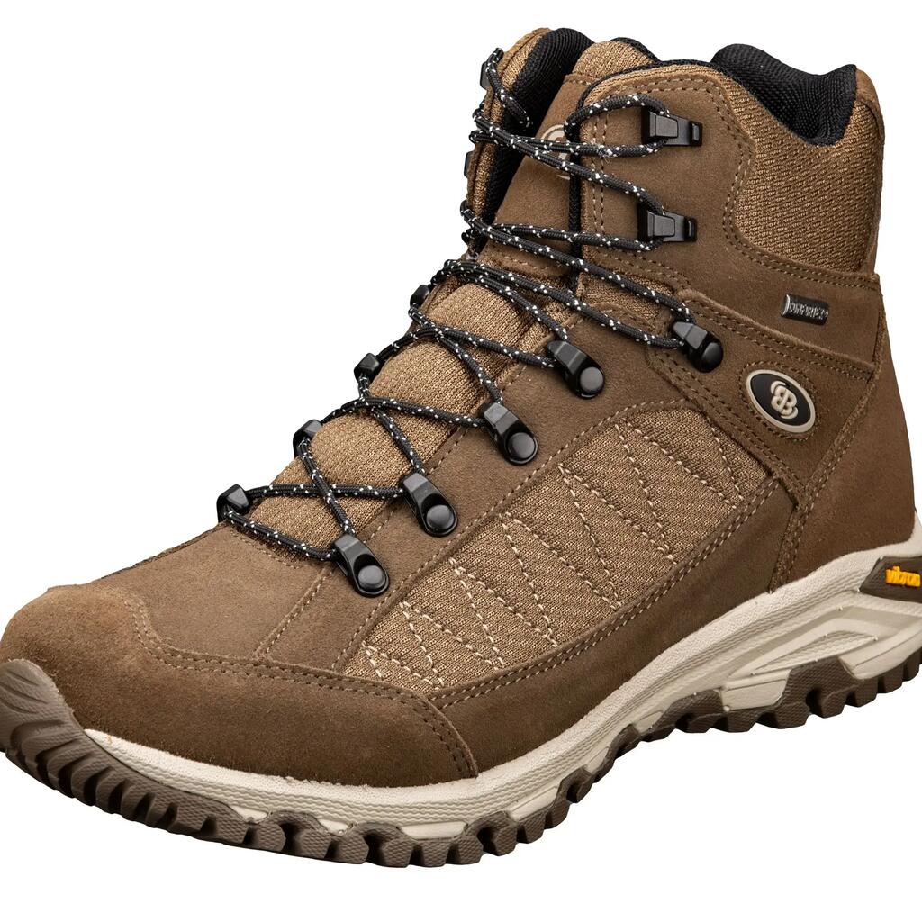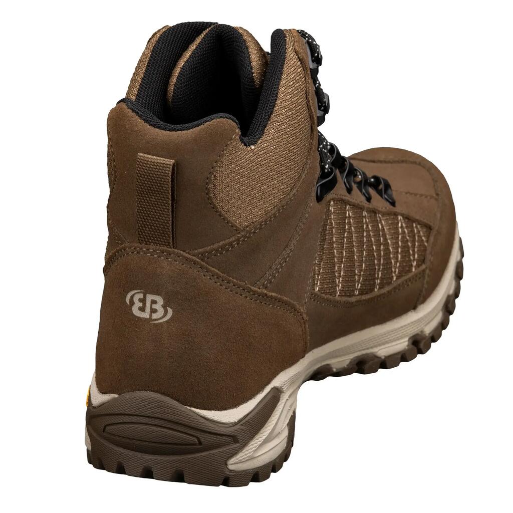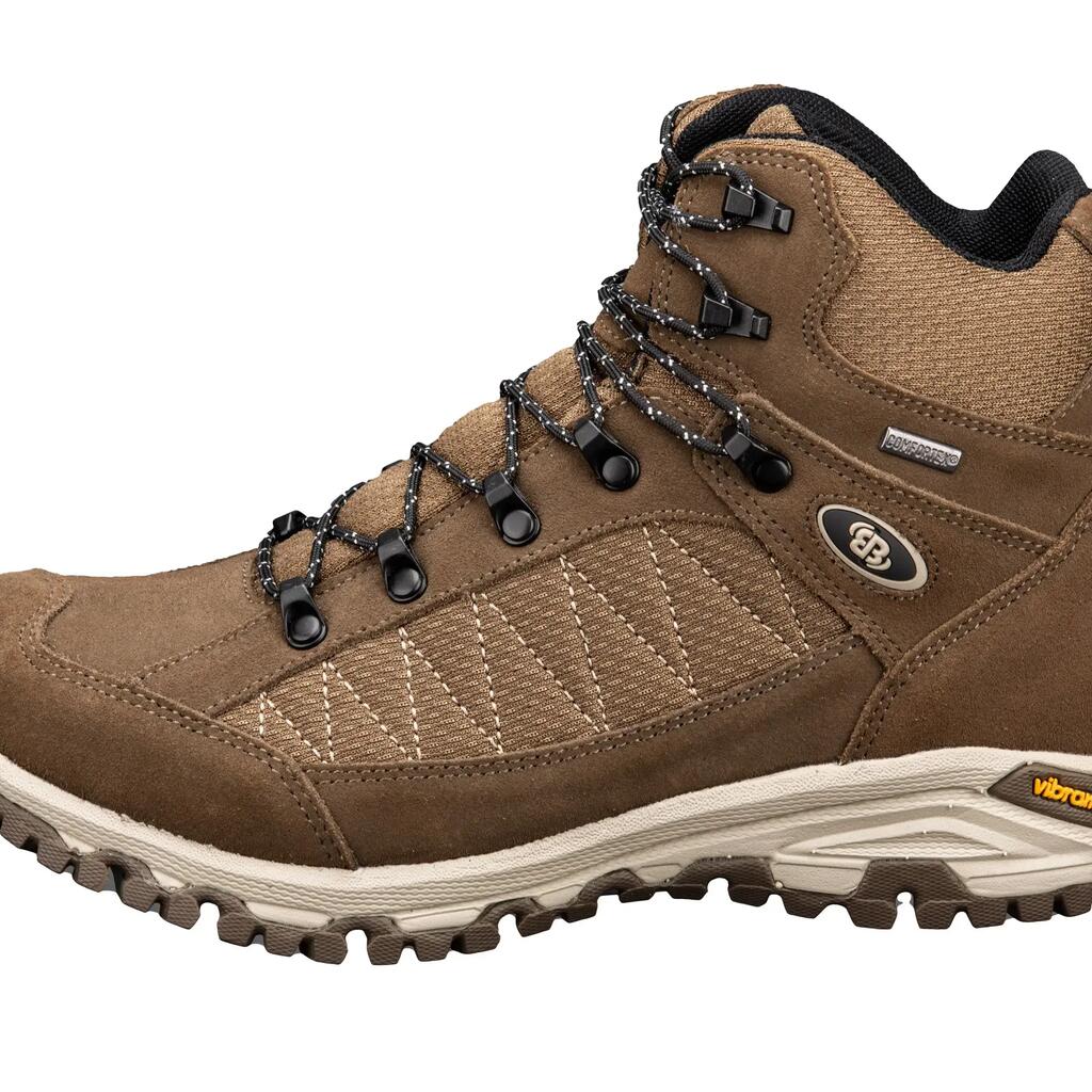 Brütting Mount Kandu High hiking boot in brown leather, waterproof Comfortex membrane, non-slip Vibram outsole and replaceable Ortholite insole for comfort and support.