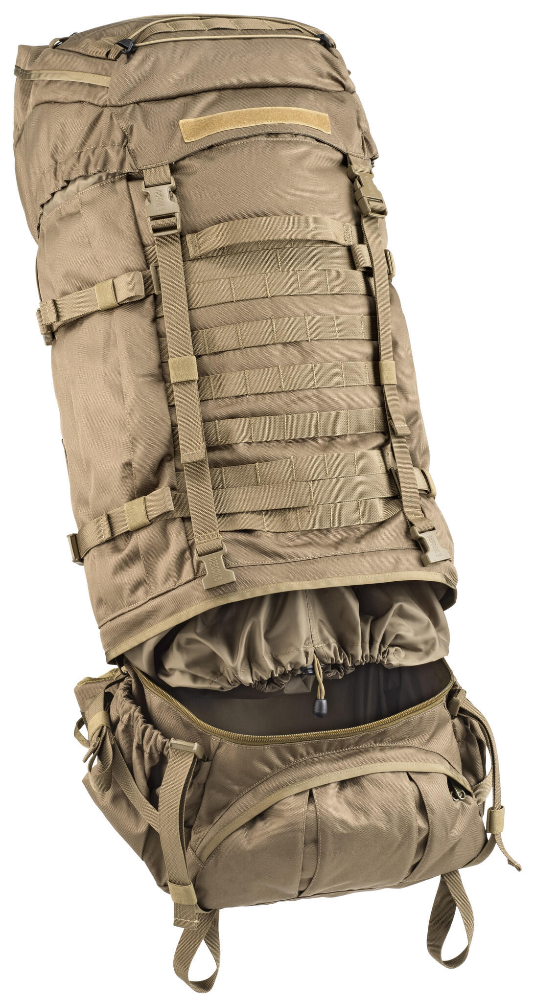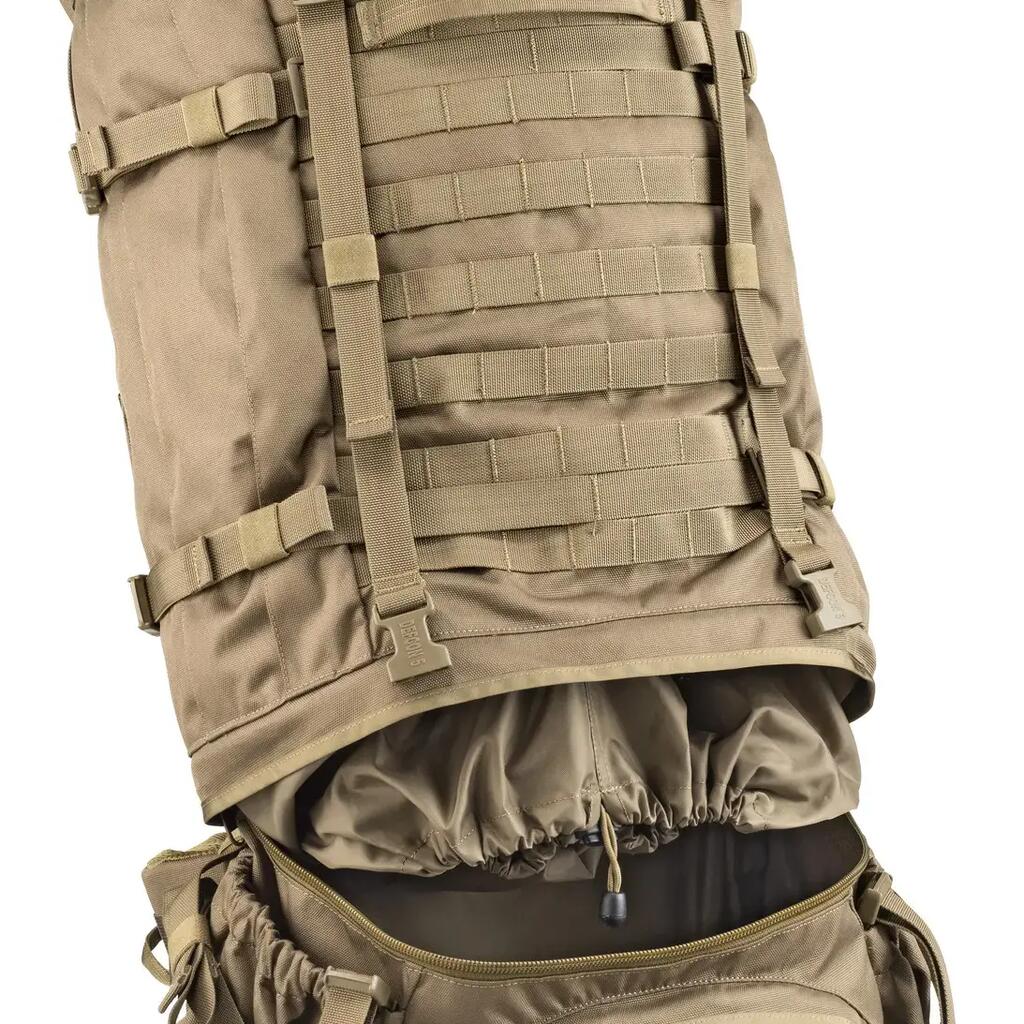A large backpack with a capacity of no less than 100 liters. A large main compartment and two 7-liter pockets provide extensive organization within the backpack.