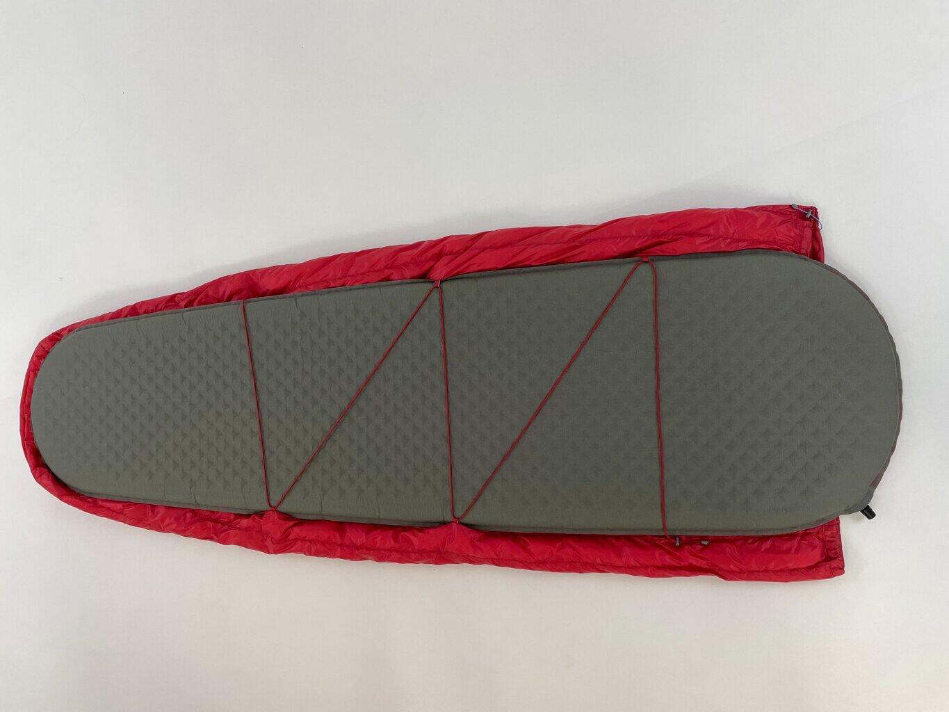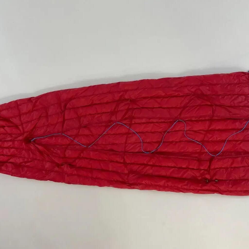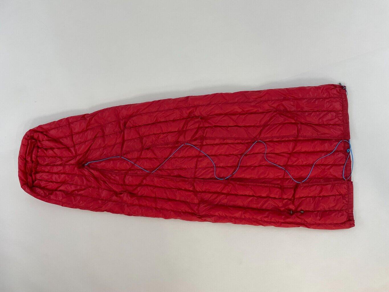 An ultralight summer sleeping bag of the 'blanket' type with no zipper and no bottom to save weight and bulk.