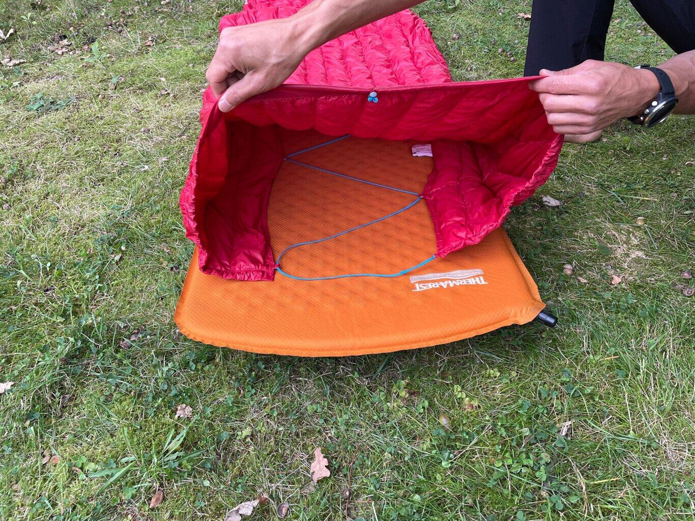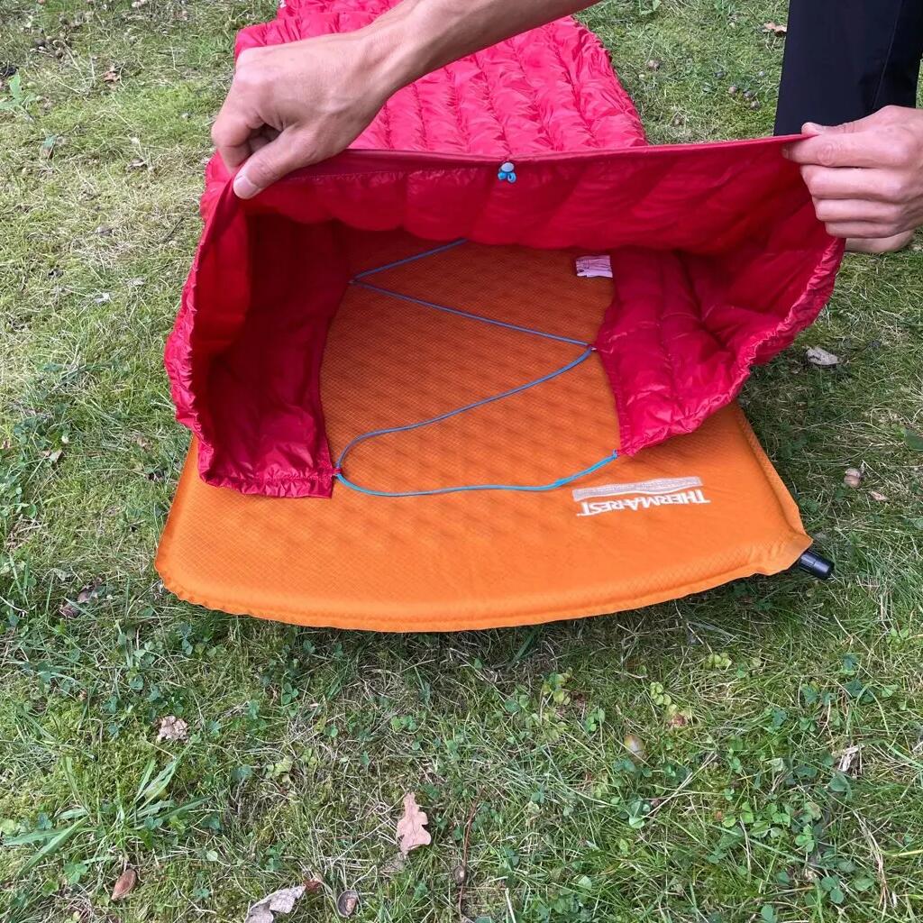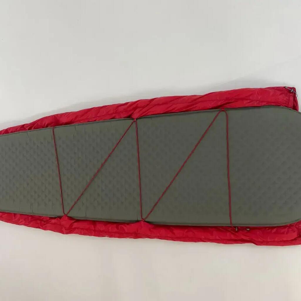 An ultralight summer sleeping bag of the 'blanket' type with no zipper and no bottom to save weight and bulk.