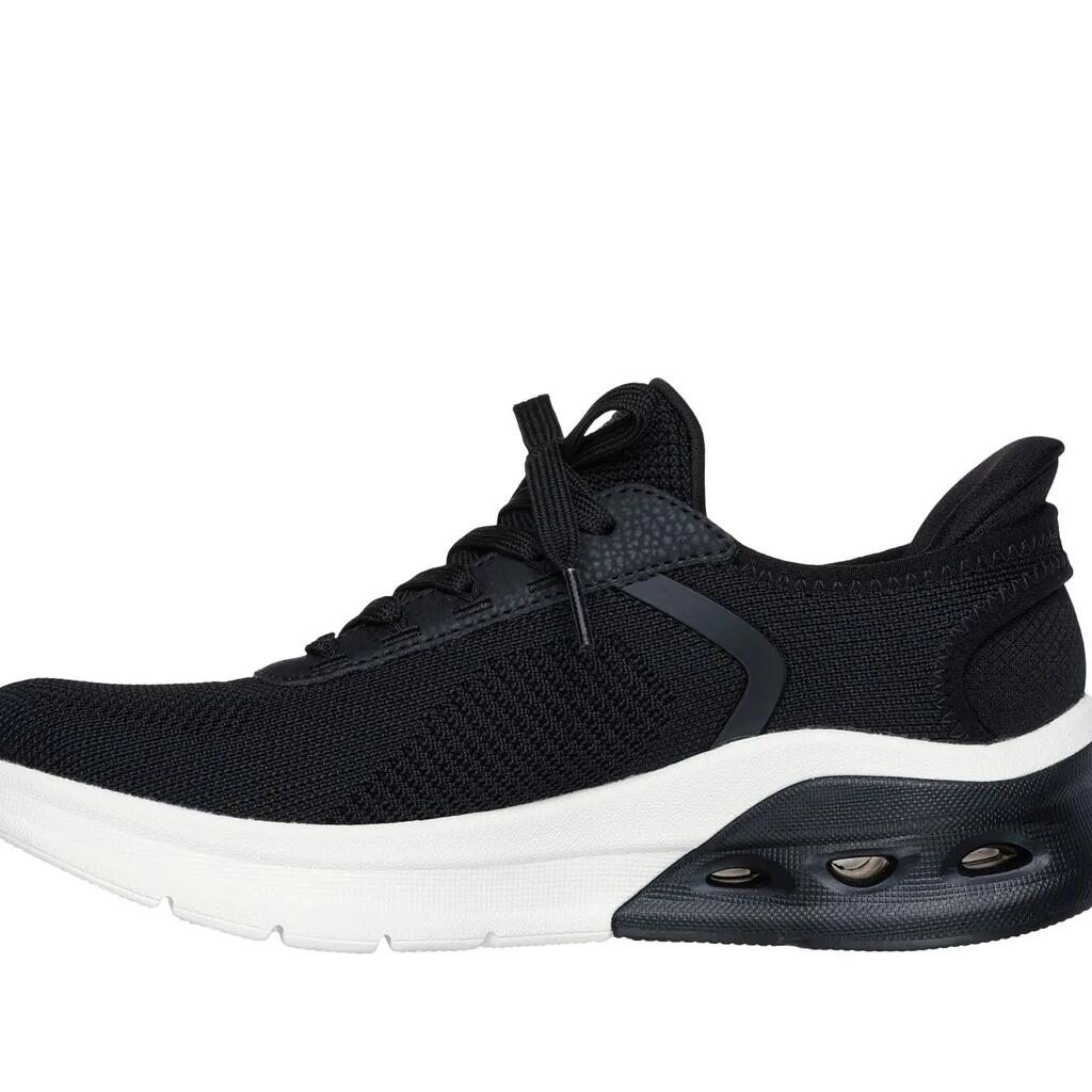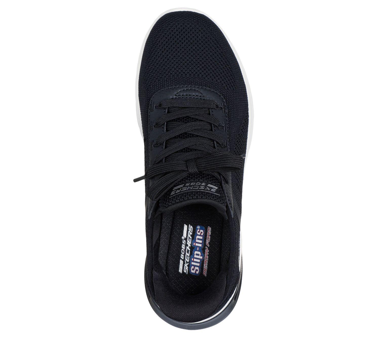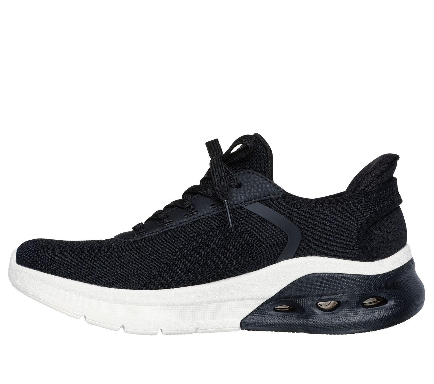 Ultimate comfort with the hands-free slip-ons: BOBS Sport Arc Waves 2.0 - Now It. With fixed laces, Skechers memory foam insole, and Glide-Step midsole.