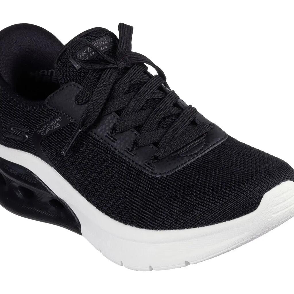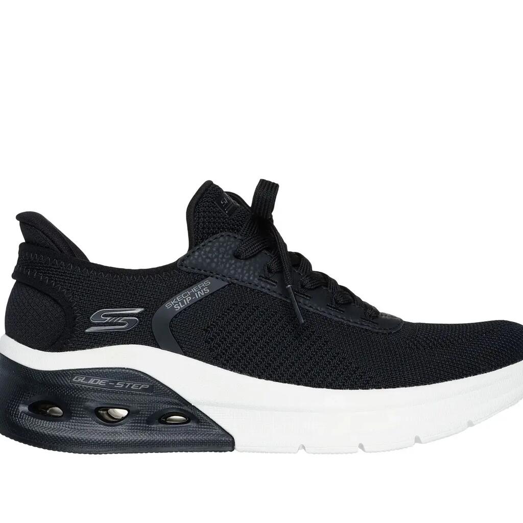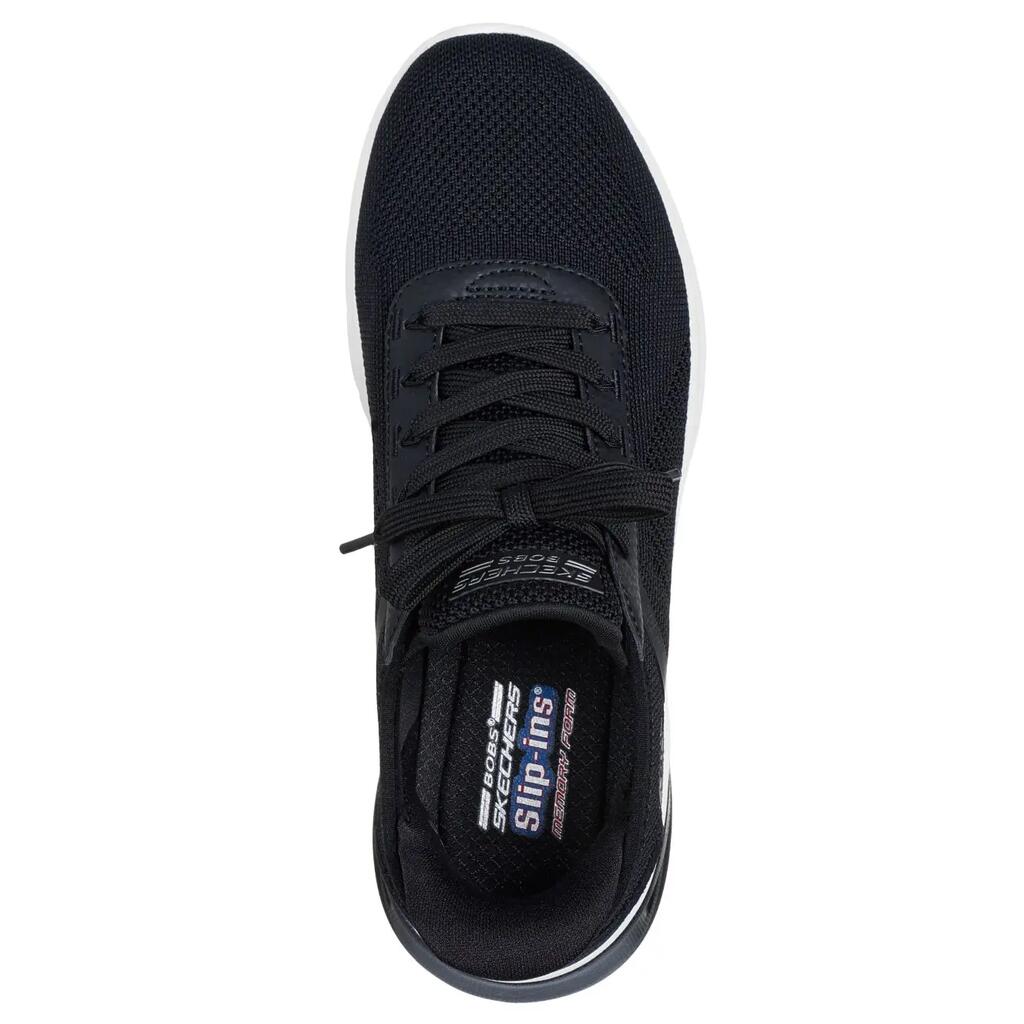 Ultimate comfort with the hands-free slip-ons: BOBS Sport Arc Waves 2.0 - Now It. With fixed laces, Skechers memory foam insole, and Glide-Step midsole.