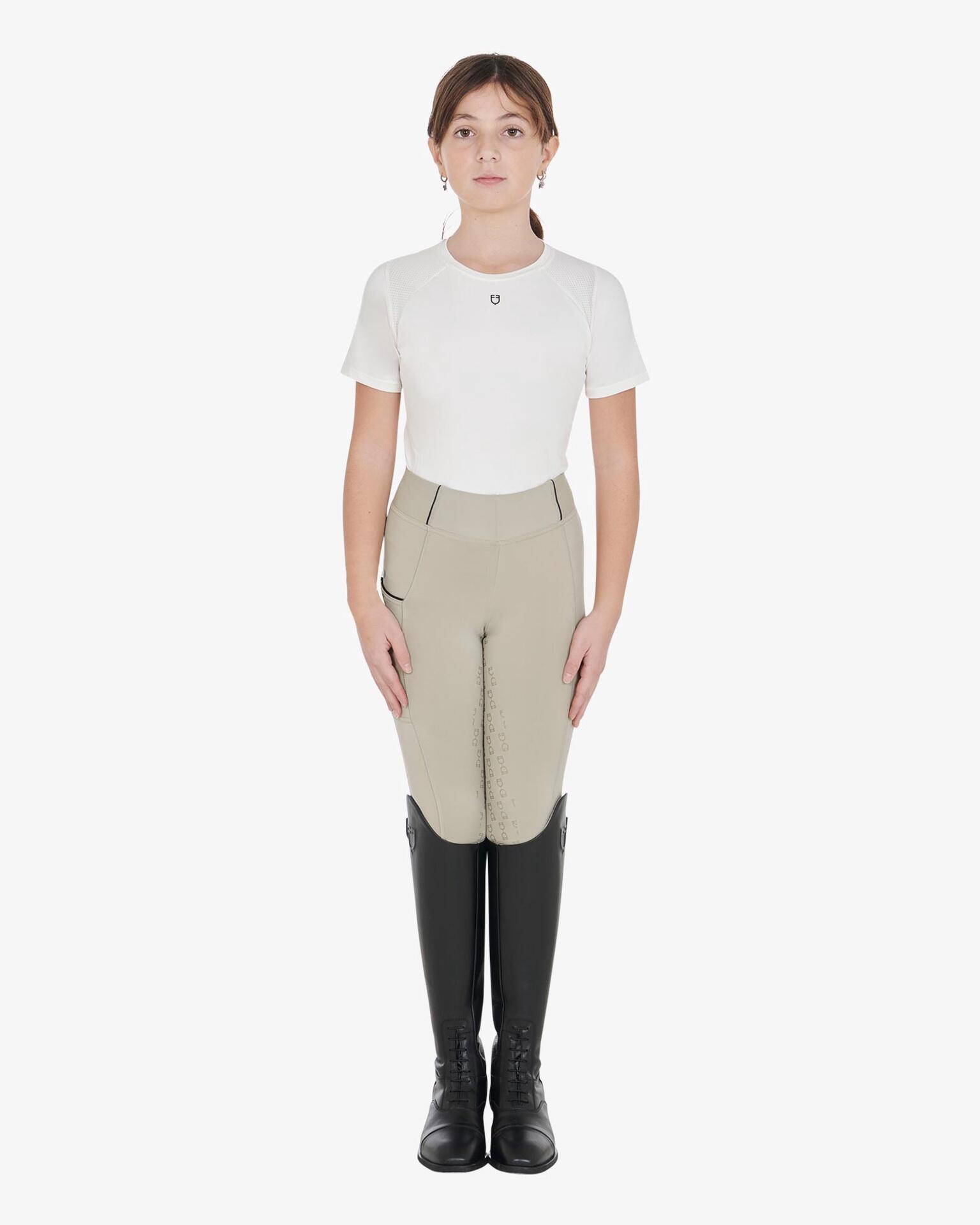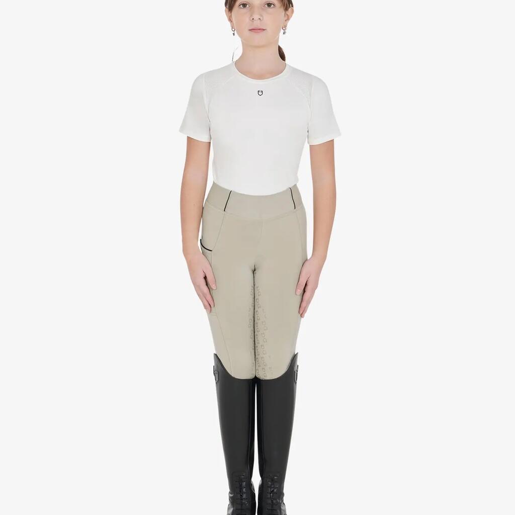 Slim fit girls' leggings ideal for horse riding, breathable and comfortable, with silicone grip and practical side pockets. Embroidered Equestro details for a distinctive, functional look.