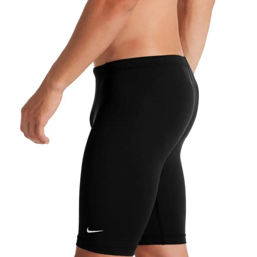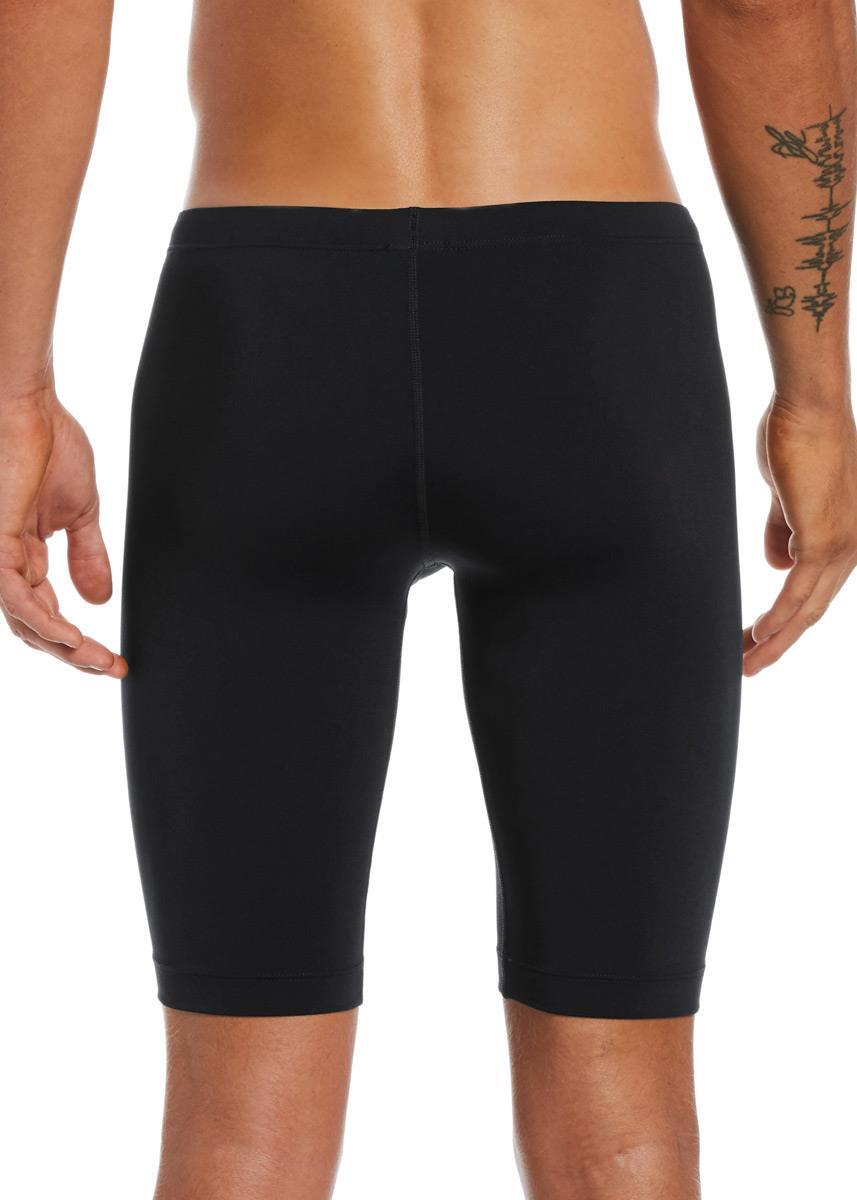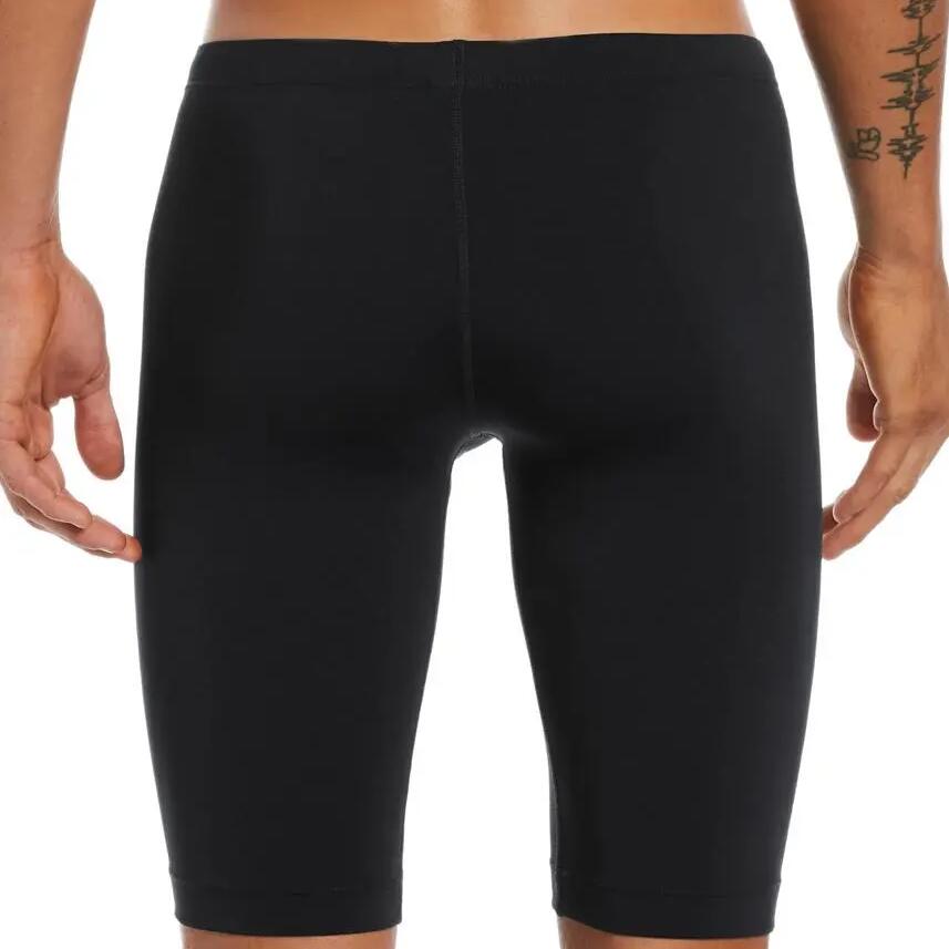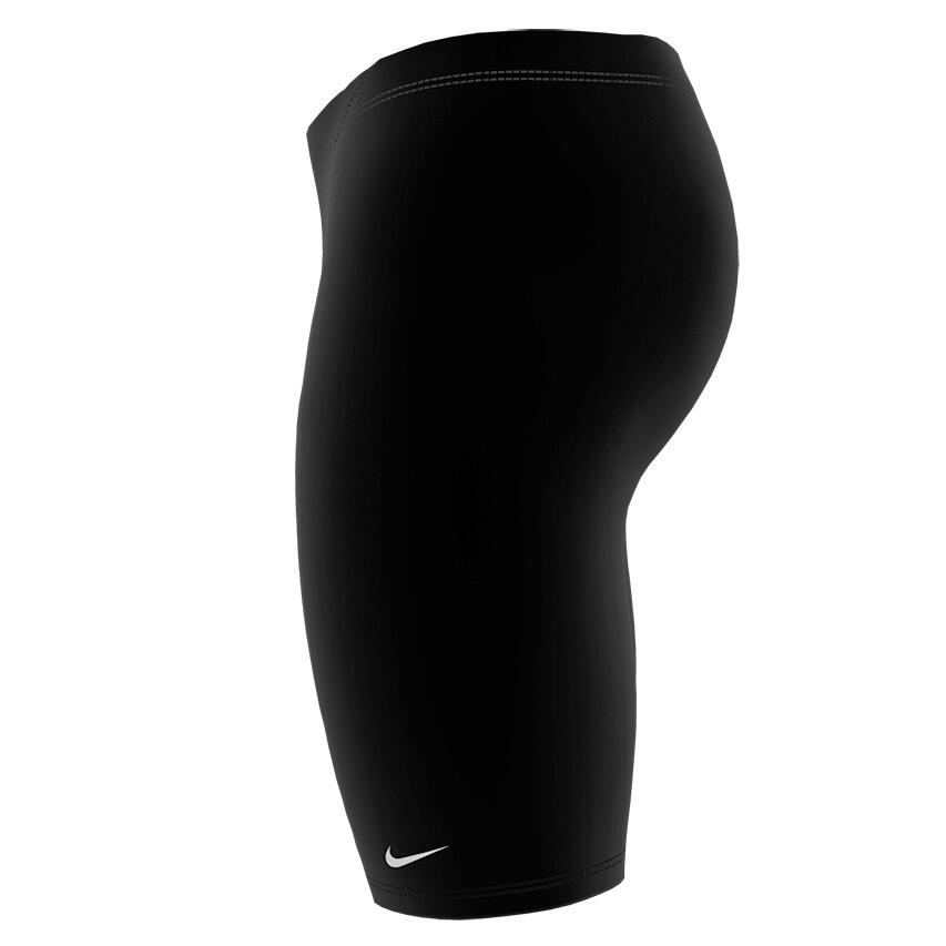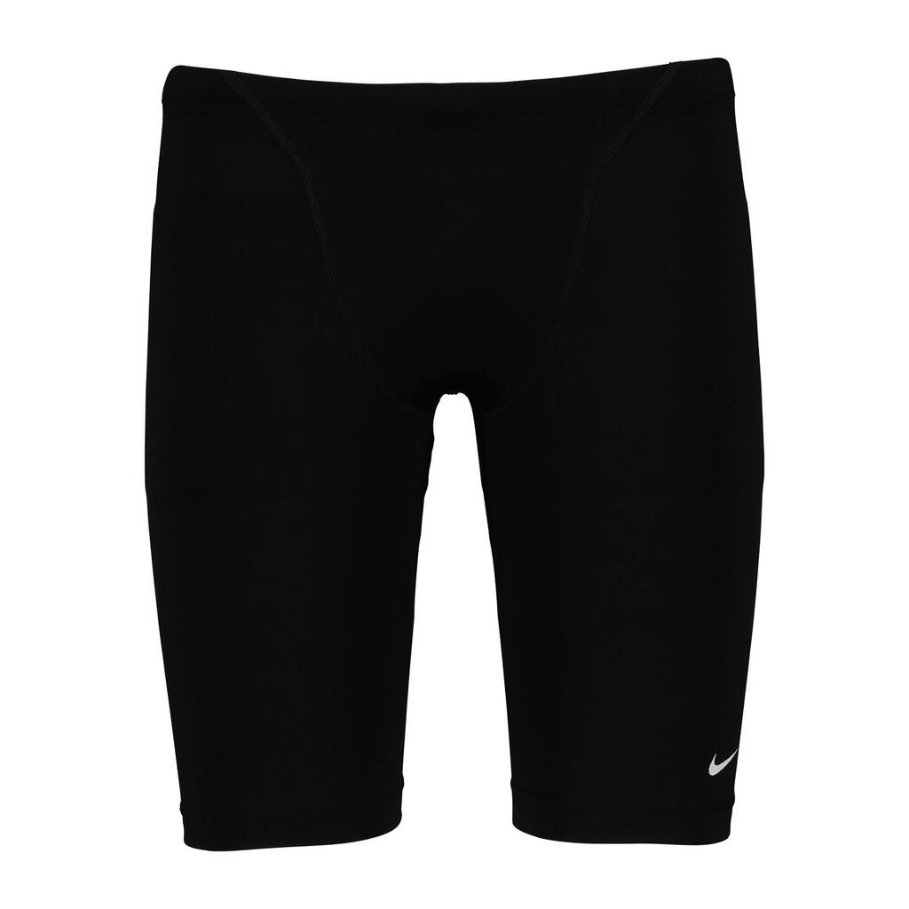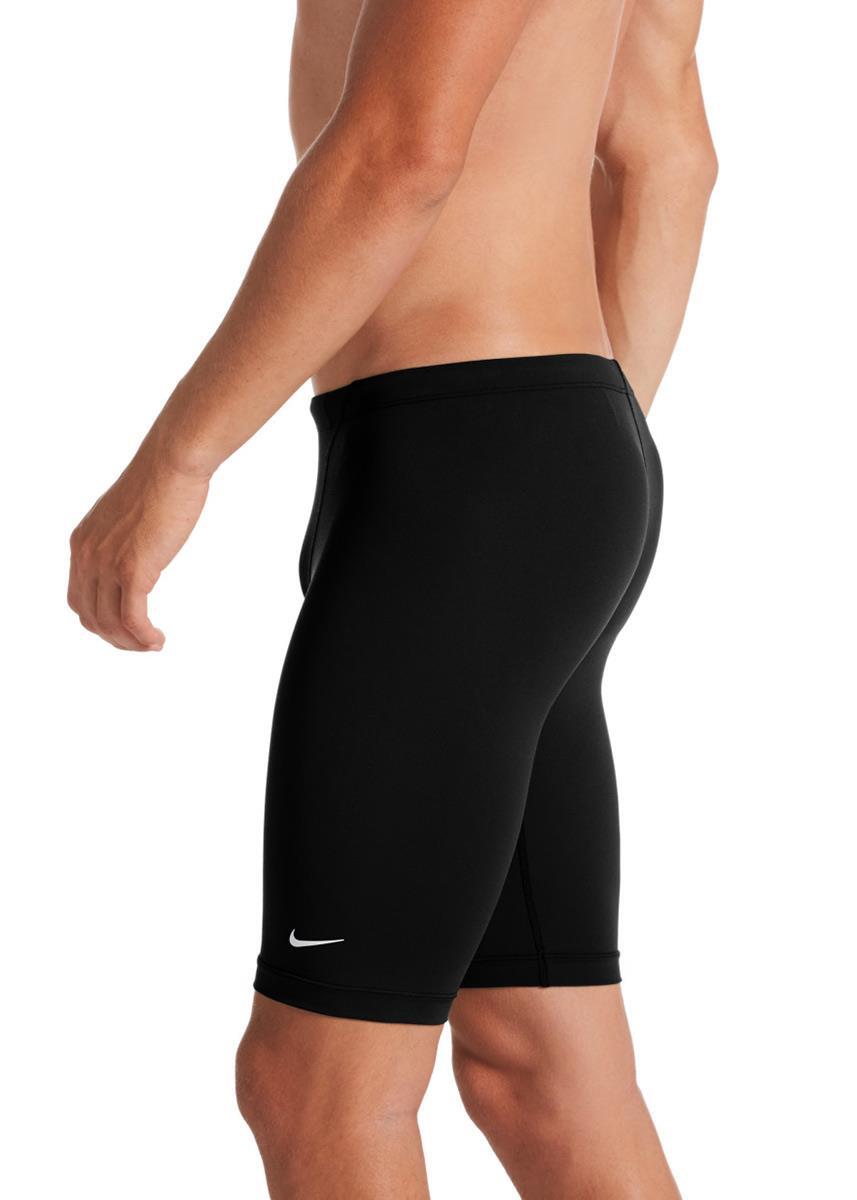 Chlorine-resistant NIKE boys' jammers in black with secure drawcord and quick-drying HydraStrong fabric.