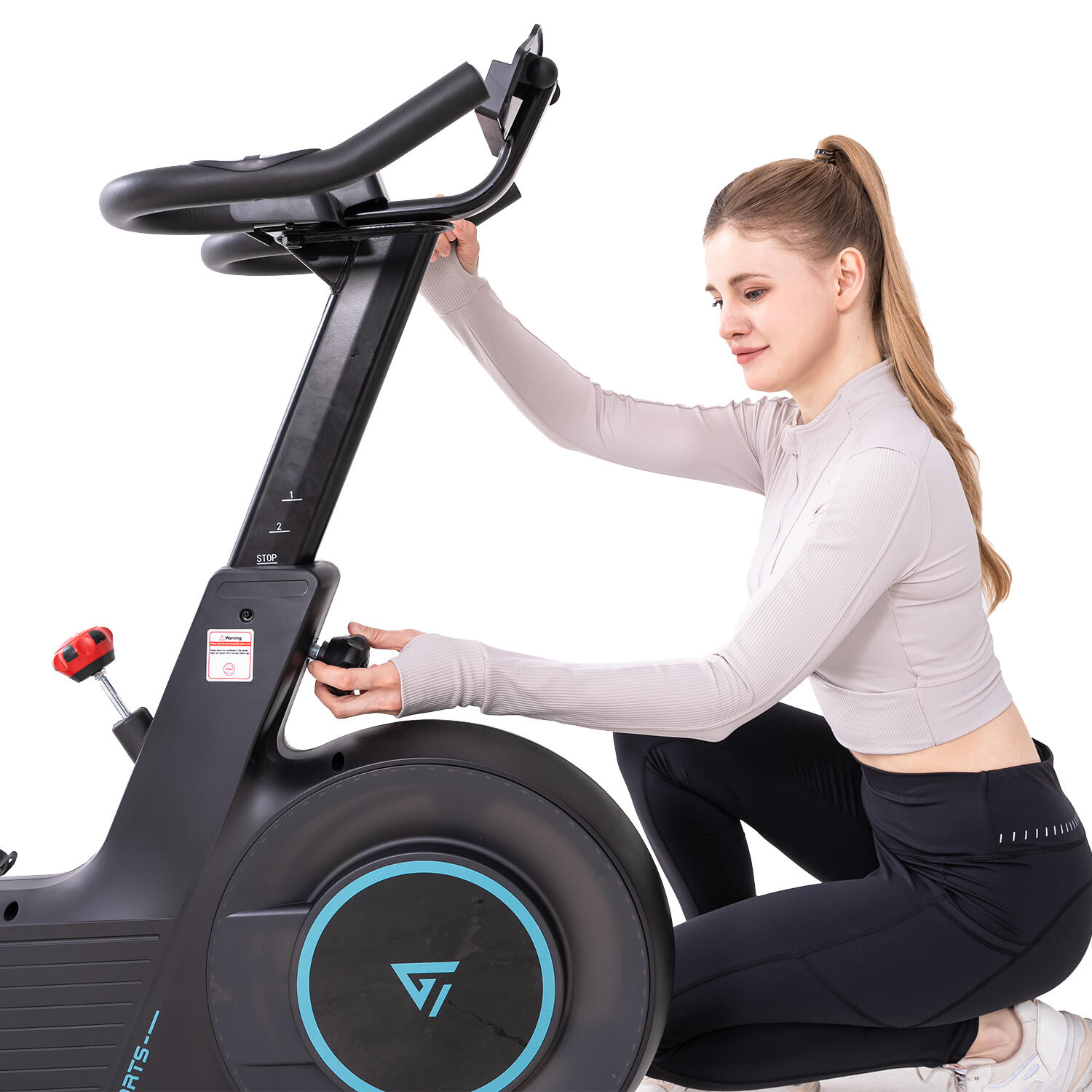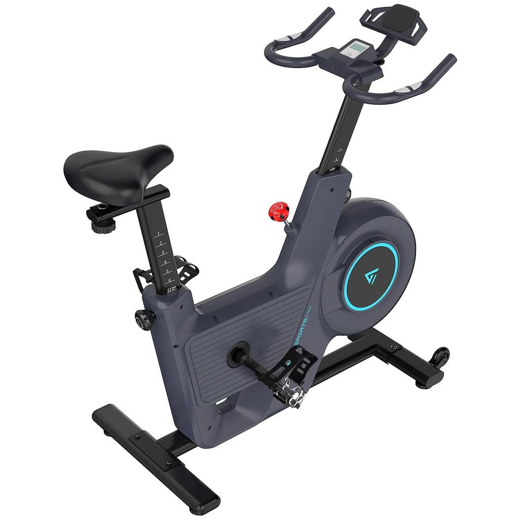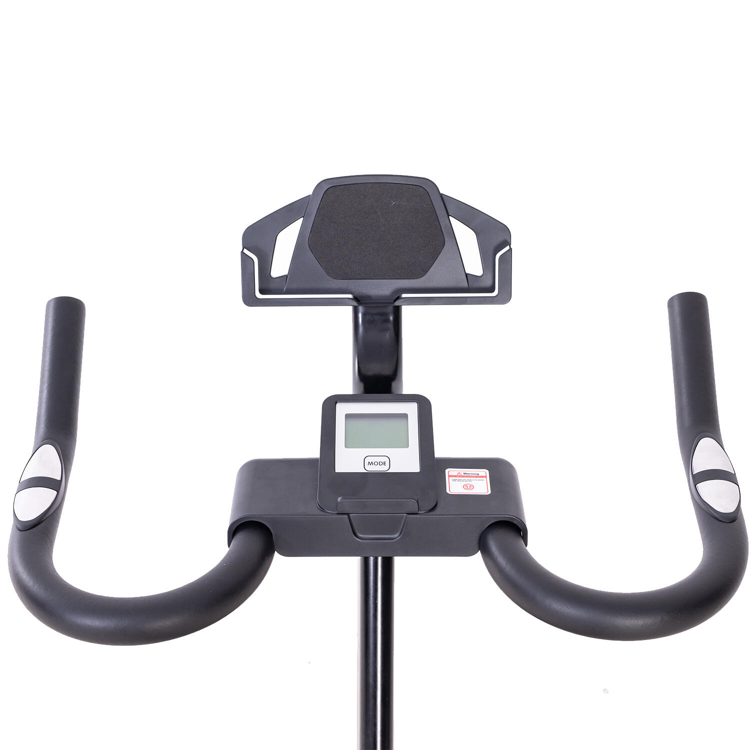 Silent belt drive stationary bike with LCD monitor, pulse sensor, and tablet holder. Compatible with Kinomap & Zwift. Sturdy steel frame supports up to 120kg.