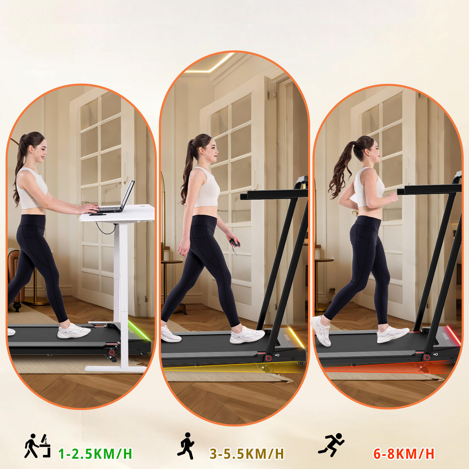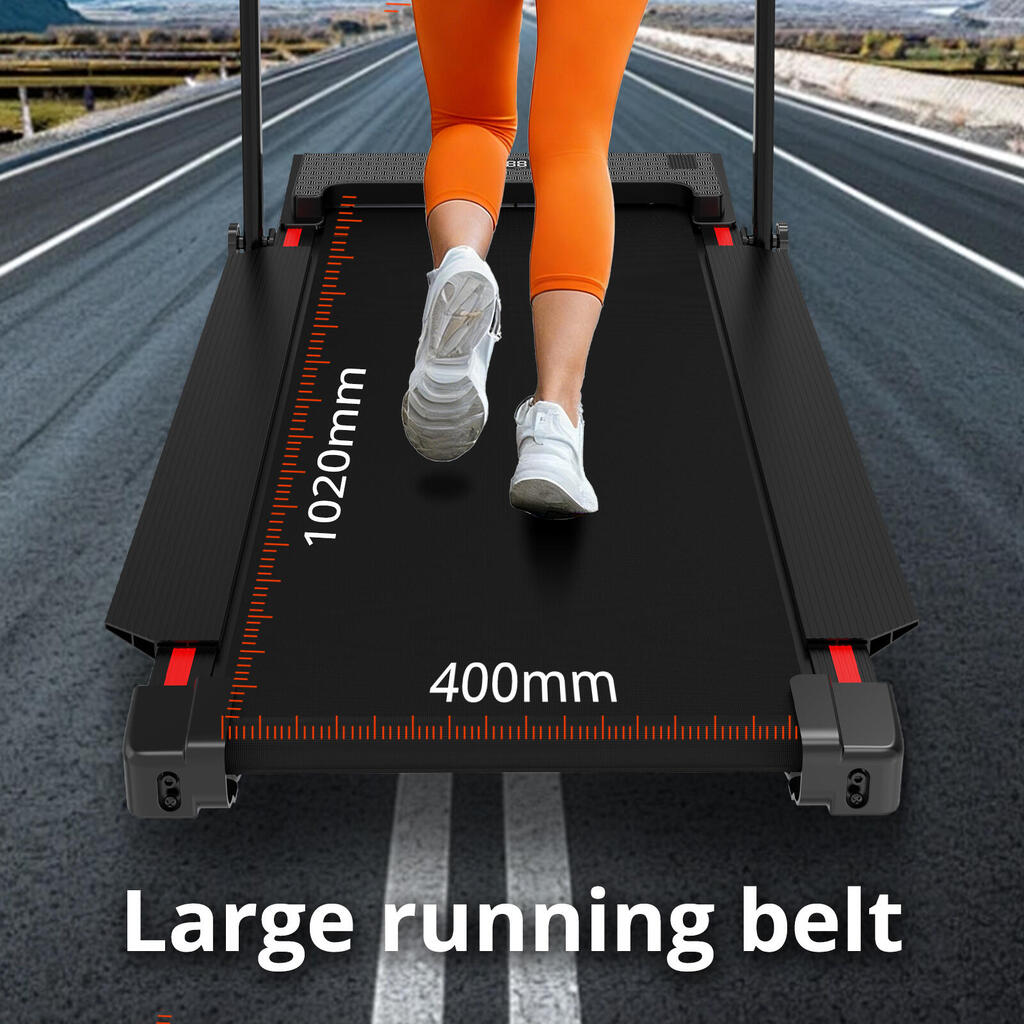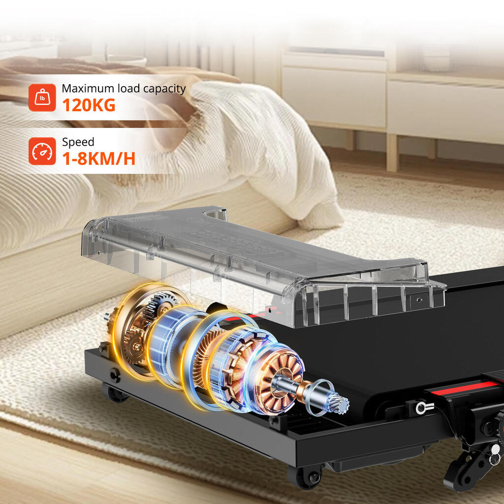 2-in-1 treadmill with 3 incline levels (up to 13.41%). 1400W motor, LED lighting, and safety rails. Speed 1-8 km/h. Compact design.