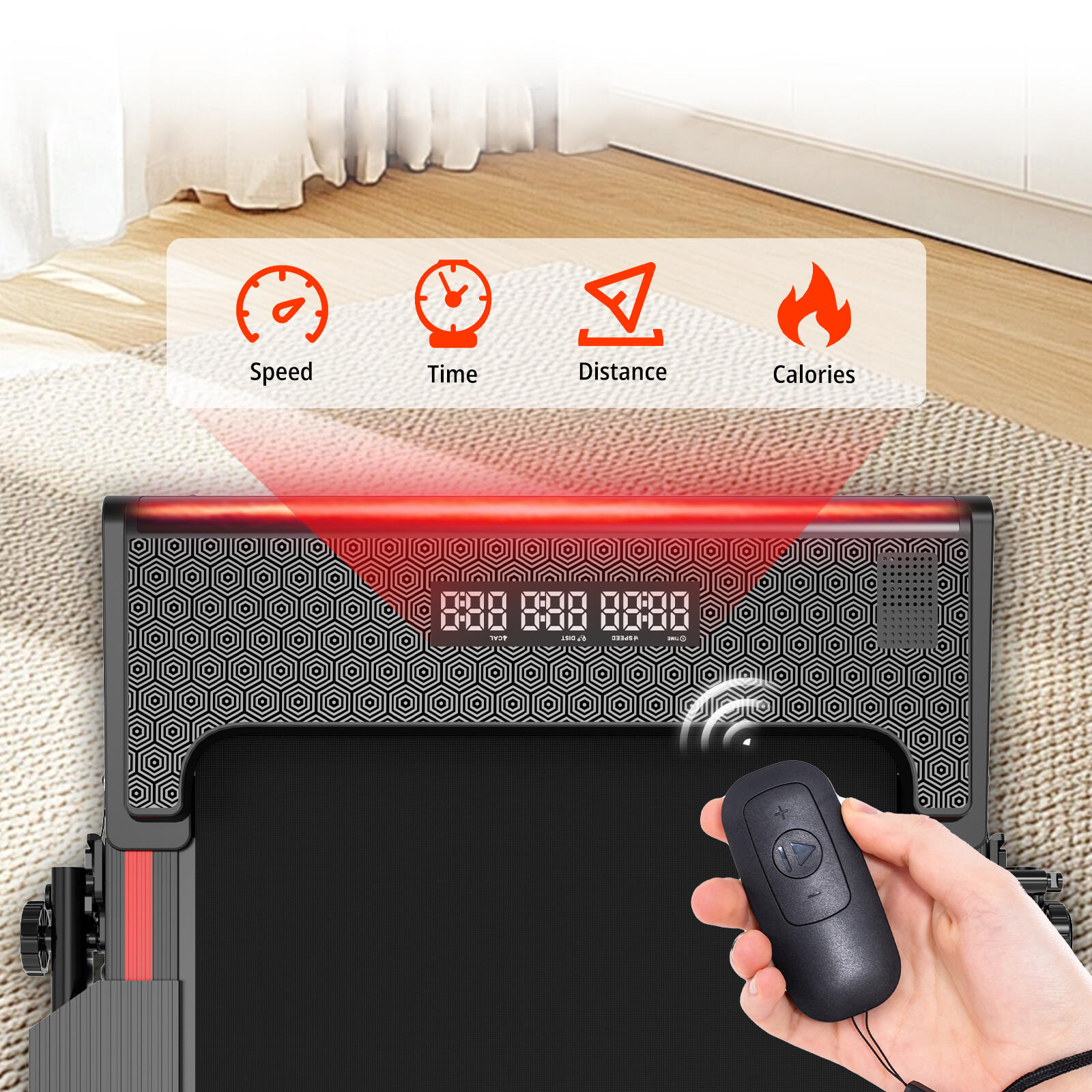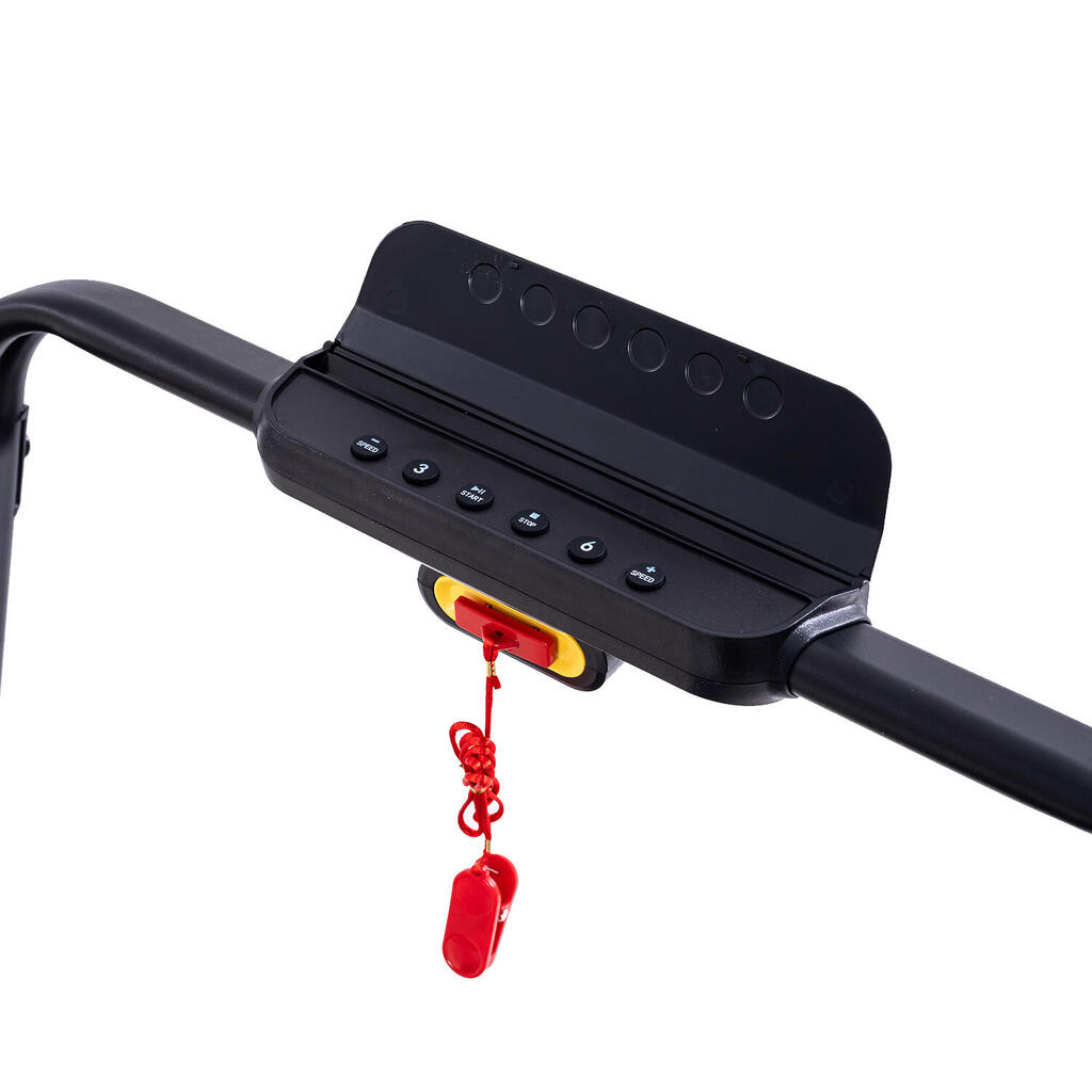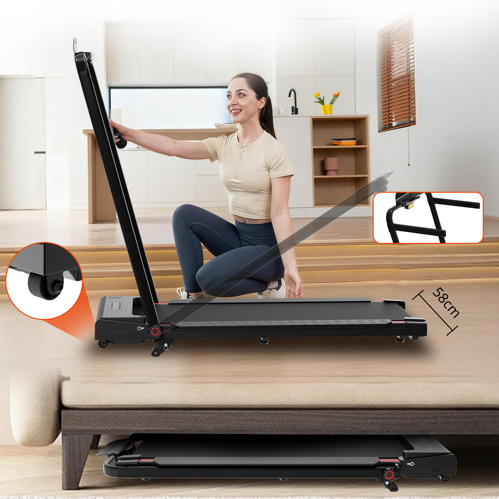 2-in-1 treadmill with 3 incline levels (up to 13.41%). 1400W motor, LED lighting, and safety rails. Speed 1-8 km/h. Compact design.