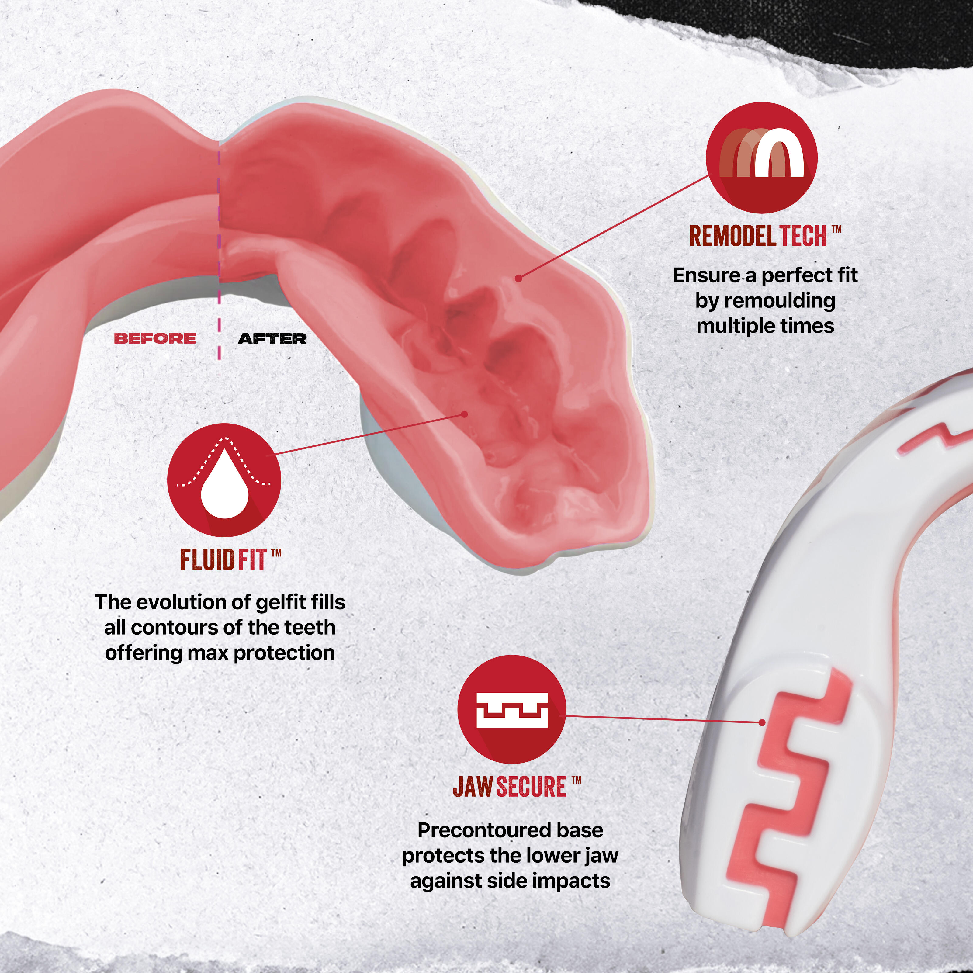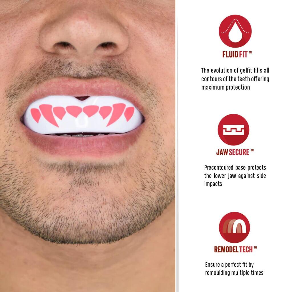 Fangz mouthguard delivers exceptional comfort and reinforced protection, allowing you to breathe, speak and drink easily while keeping a fierce, standout look in competition.