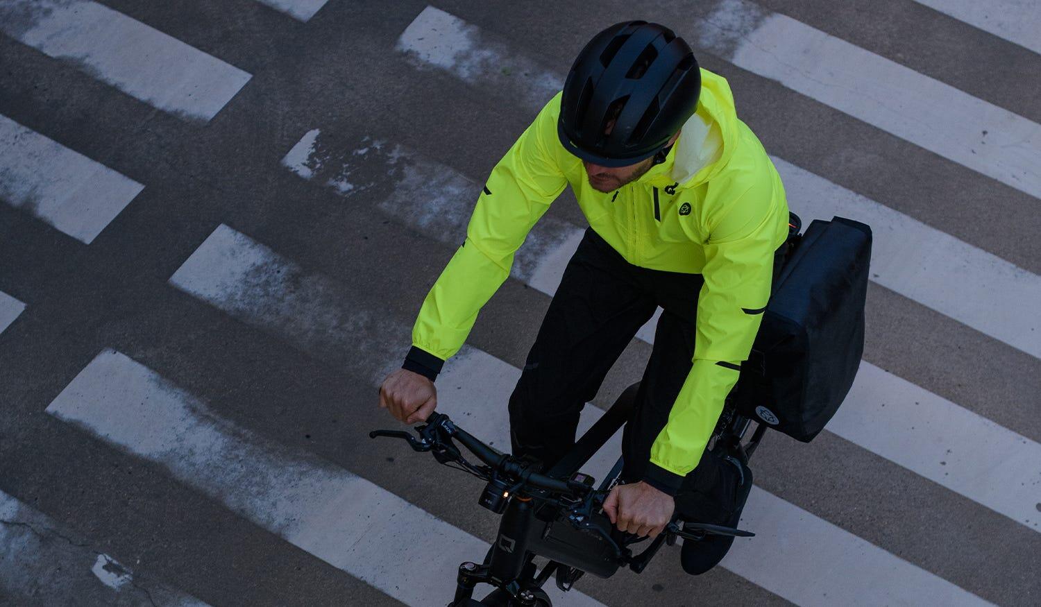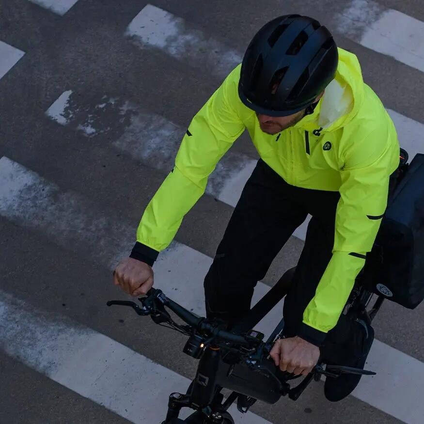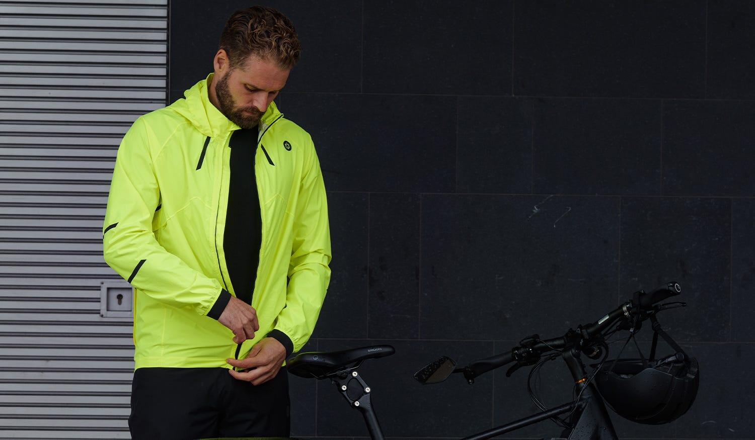 Material: 100% recycled Polyester ripstop, 2.5-layer, lightweight. Windproof, waterproof & breathable: Poray 10.000. EN 20471 Hi-vis Neon yellow fabric & reflective details.