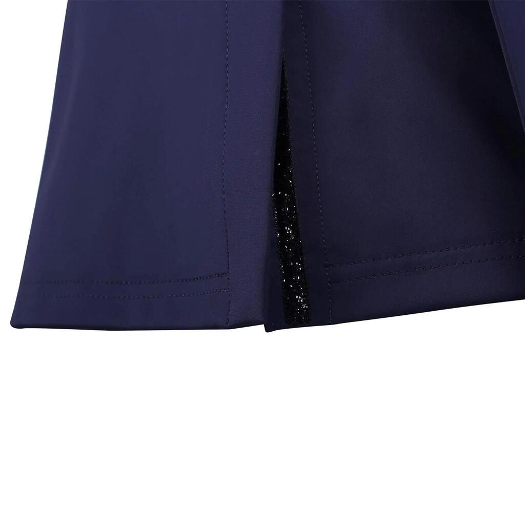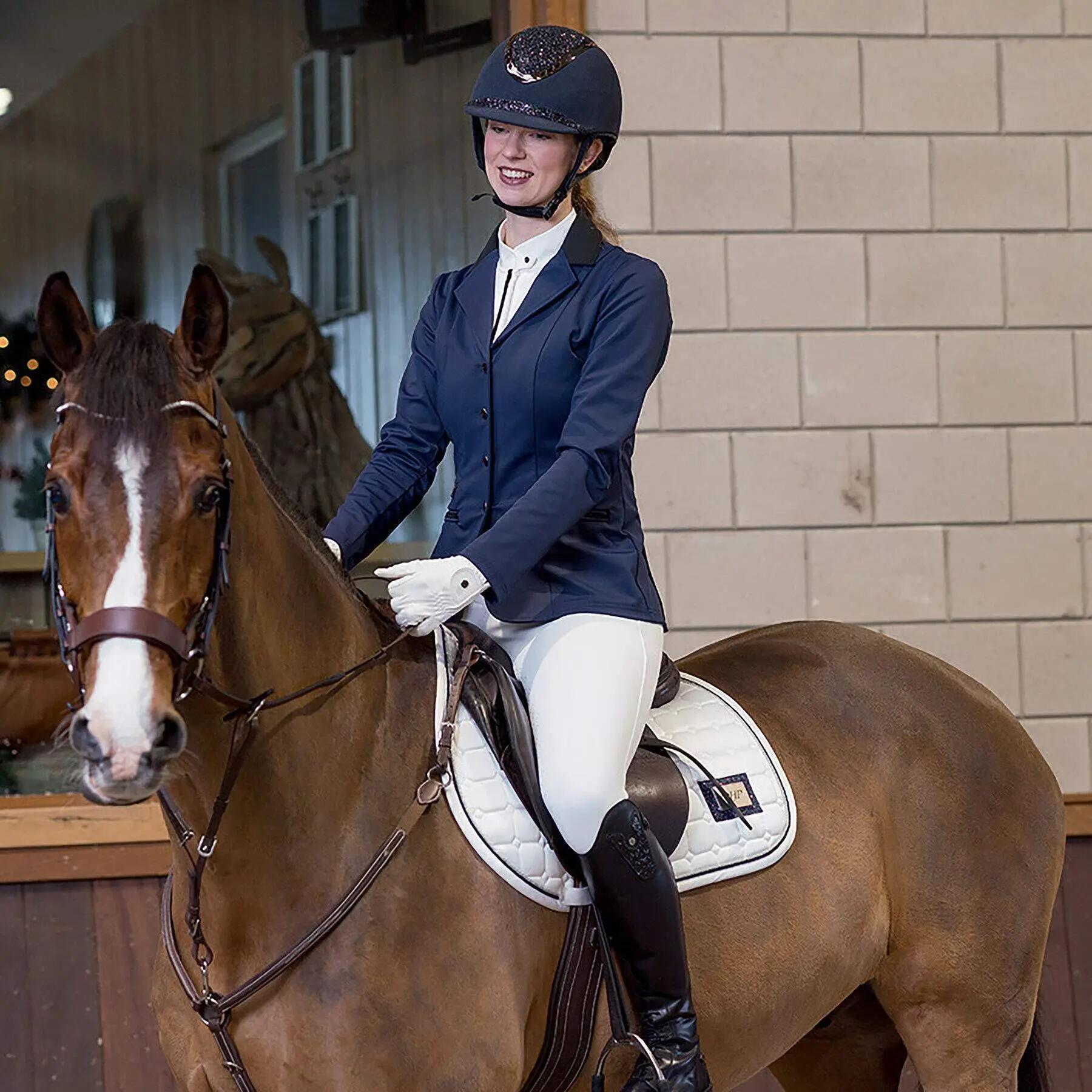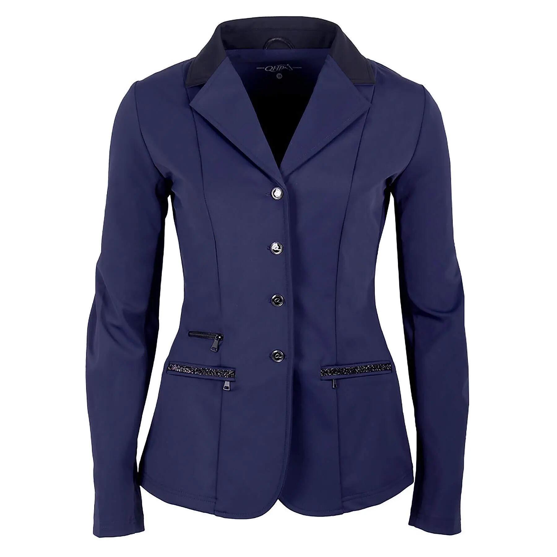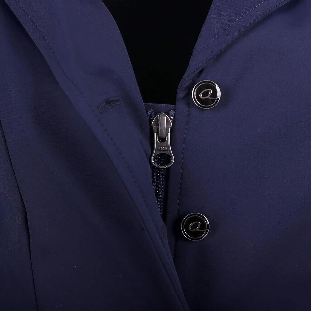Shine at your competitions with this elegant competition jacket. The jacket has a concealed zipper to reduce button pressure. The breathable stretch fabric ensures a comfortable ride. The ribbon on the zippered pockets and the black faux-zippered pocket finish off the jacket.