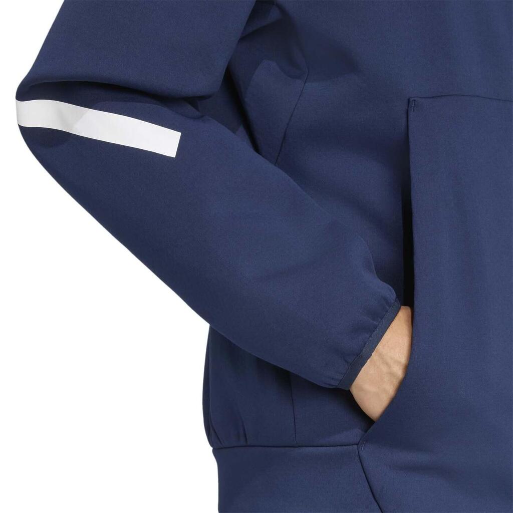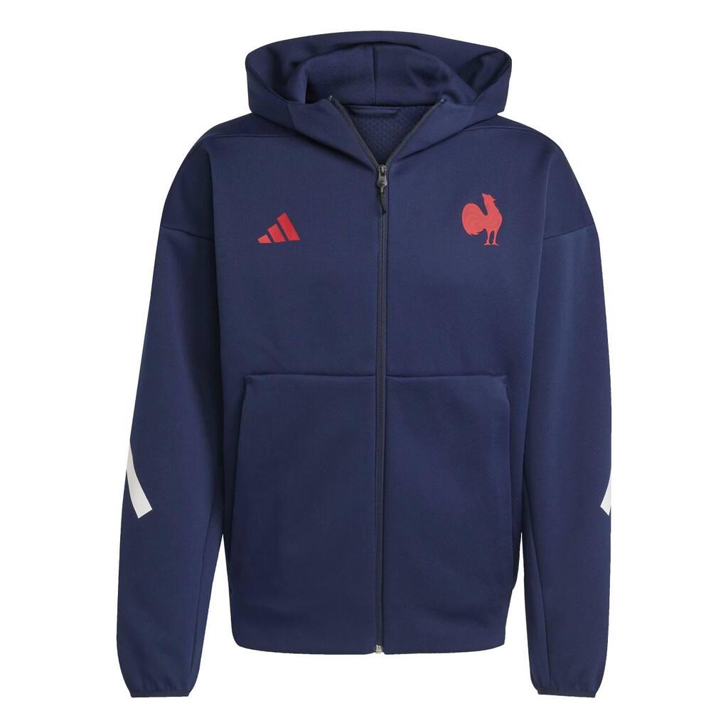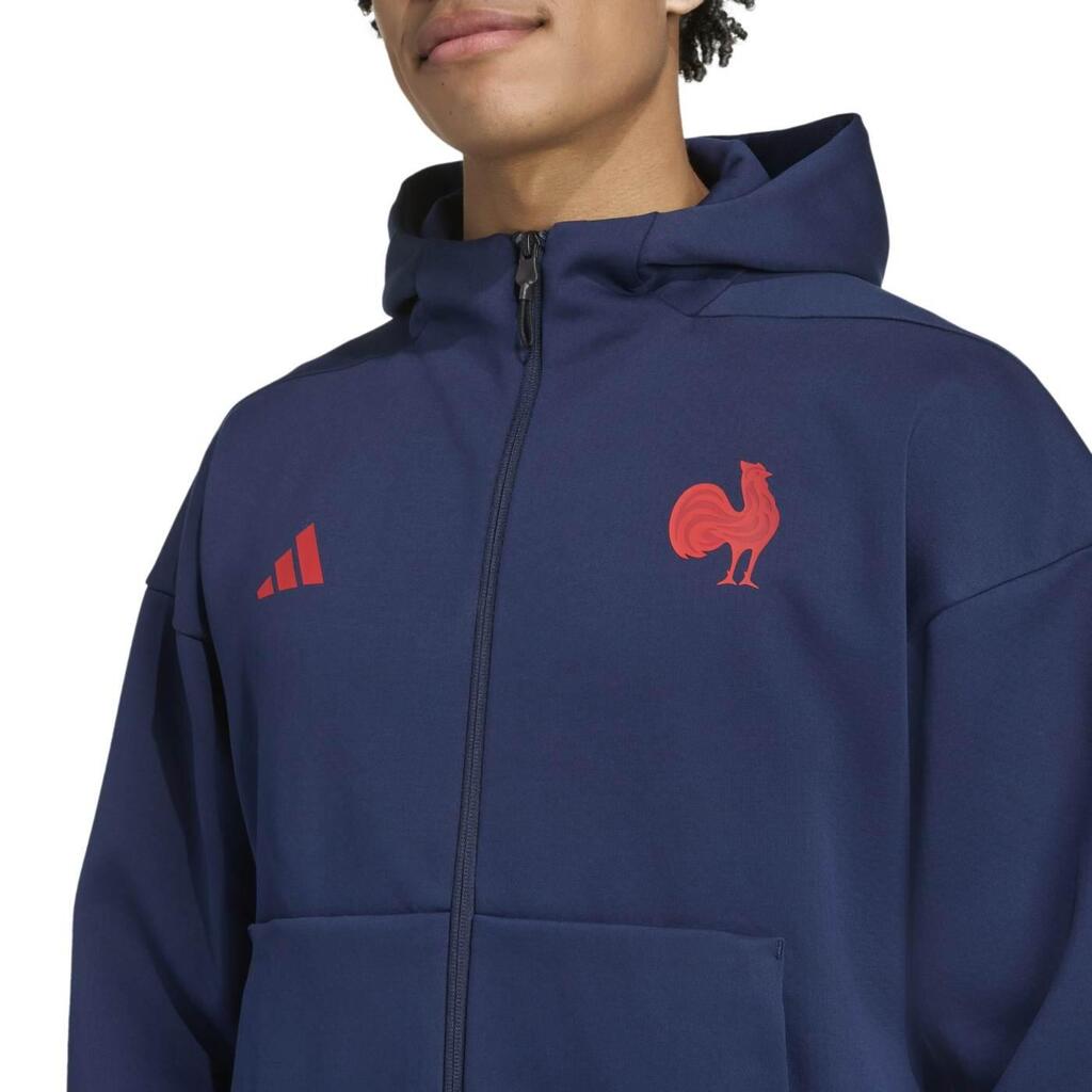 Support French rugby in this adidas hooded full-zip jacket that blends comfort and sporty style. Soft double-knit fabric, lined hood and kangaroo pockets made with recycled materials.