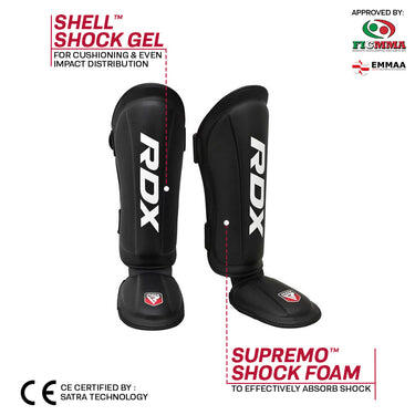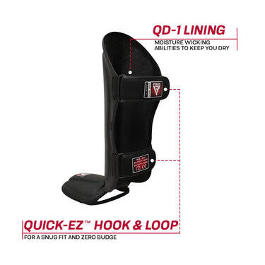 Champion-grade shin pads! Shell Shock GEL™, Supremo-Shock Foam™, QD-1™ moisture-wicking lining. Quick-EZ™ closure. CE certified by SATRA. FIGMMA, SMMAF, EMMAA approved for top-notch performance.