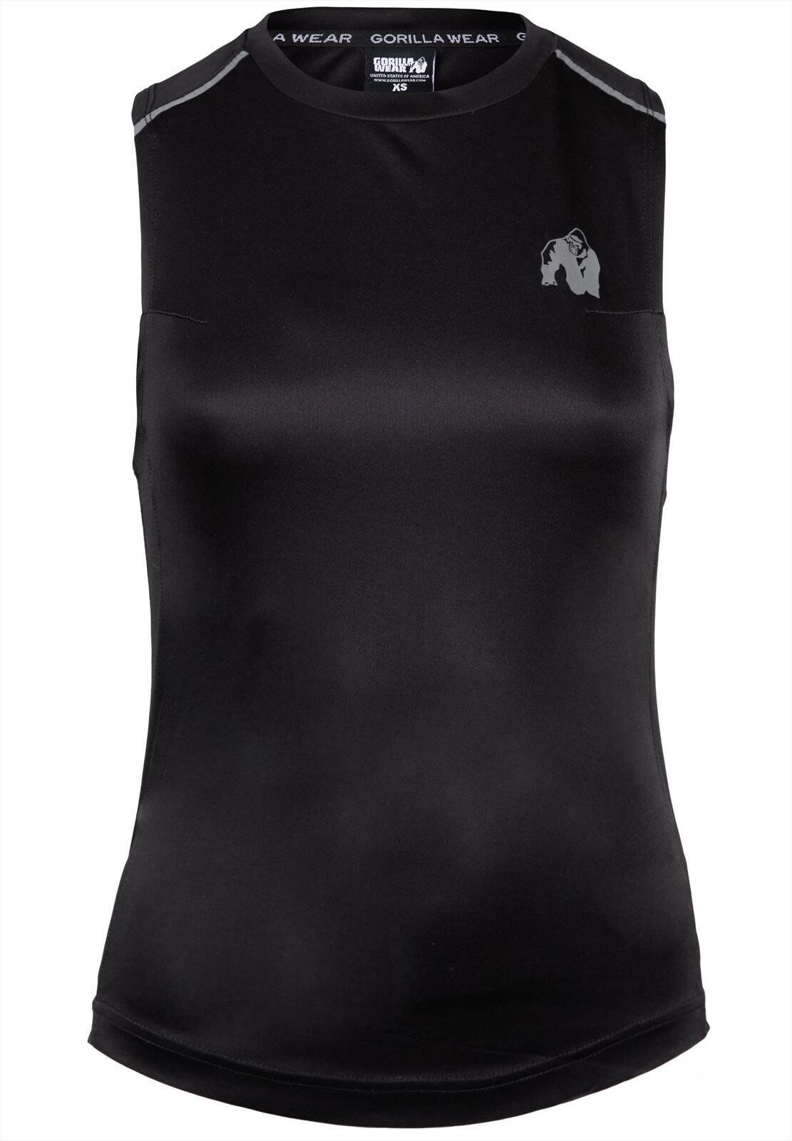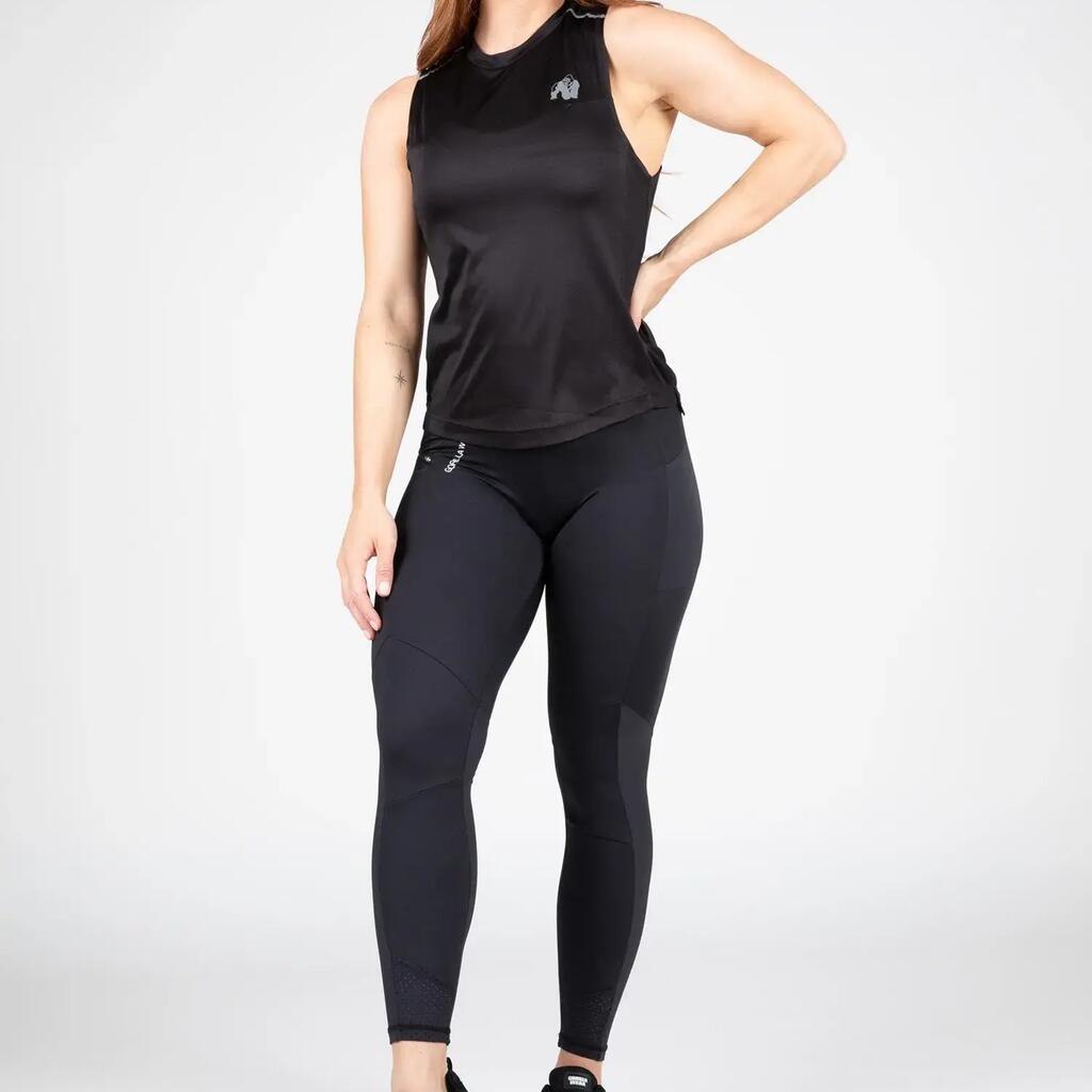 A lightweight, stylish women's tank top for your workouts, with reflective details and an extended back hem. From Gorilla Wear.