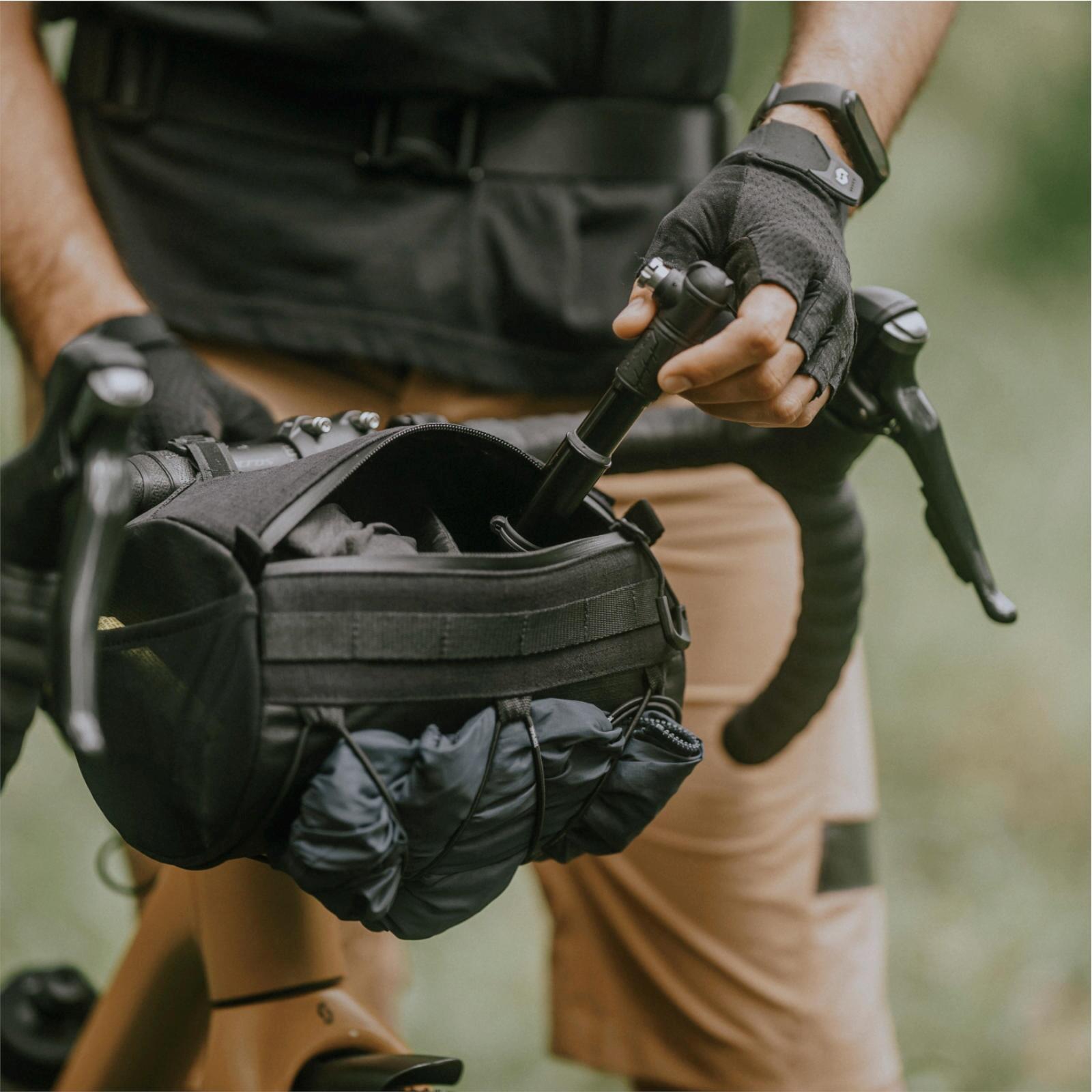 Handlebar duffle: 3.8L with full-length zipper, two mesh pockets, and fits Ø30-Ø55 mm handlebars