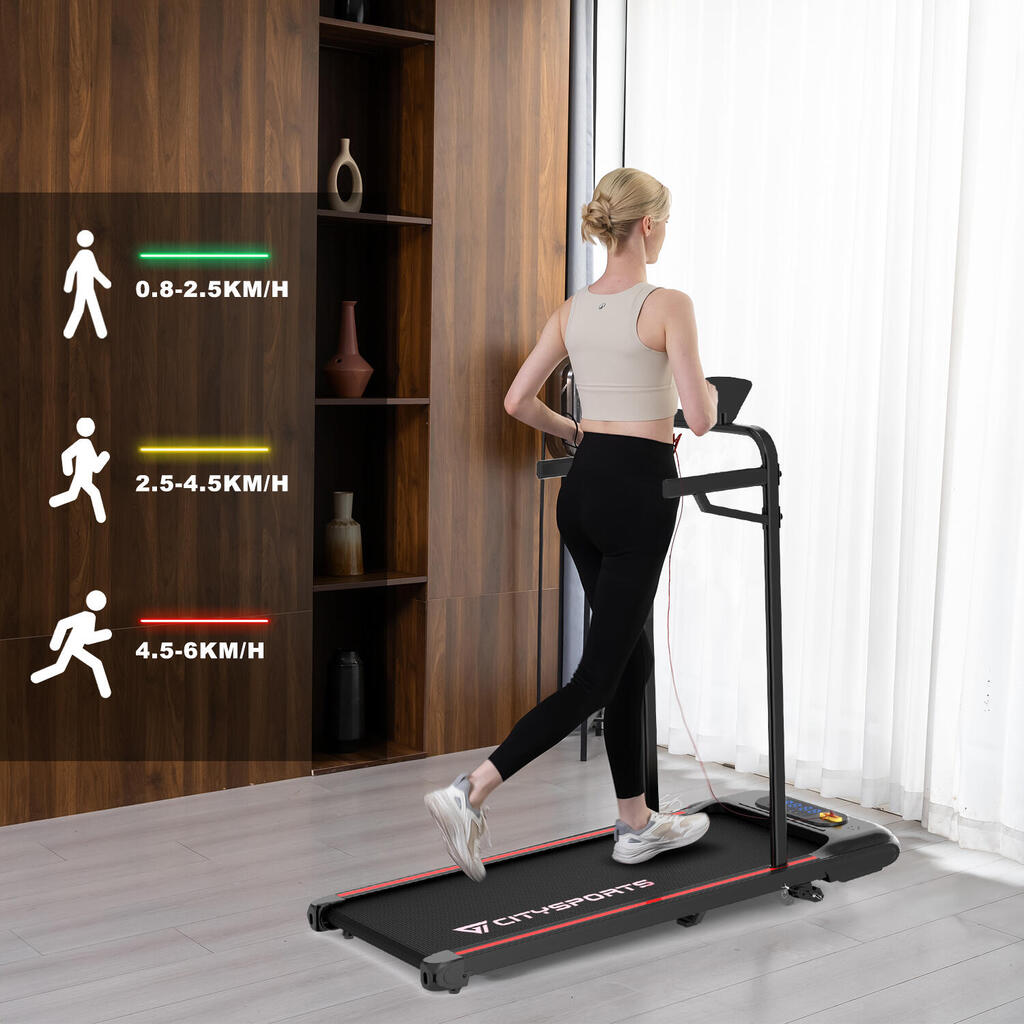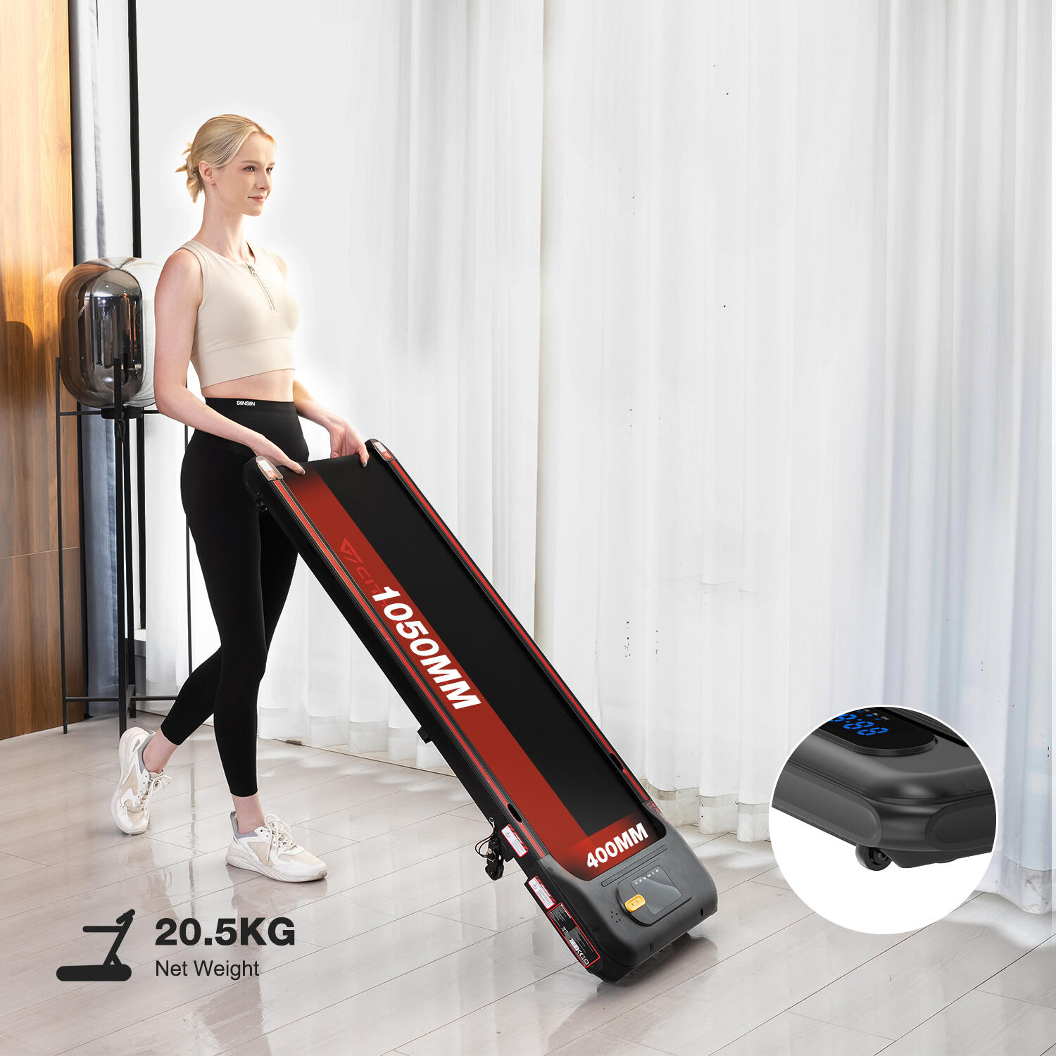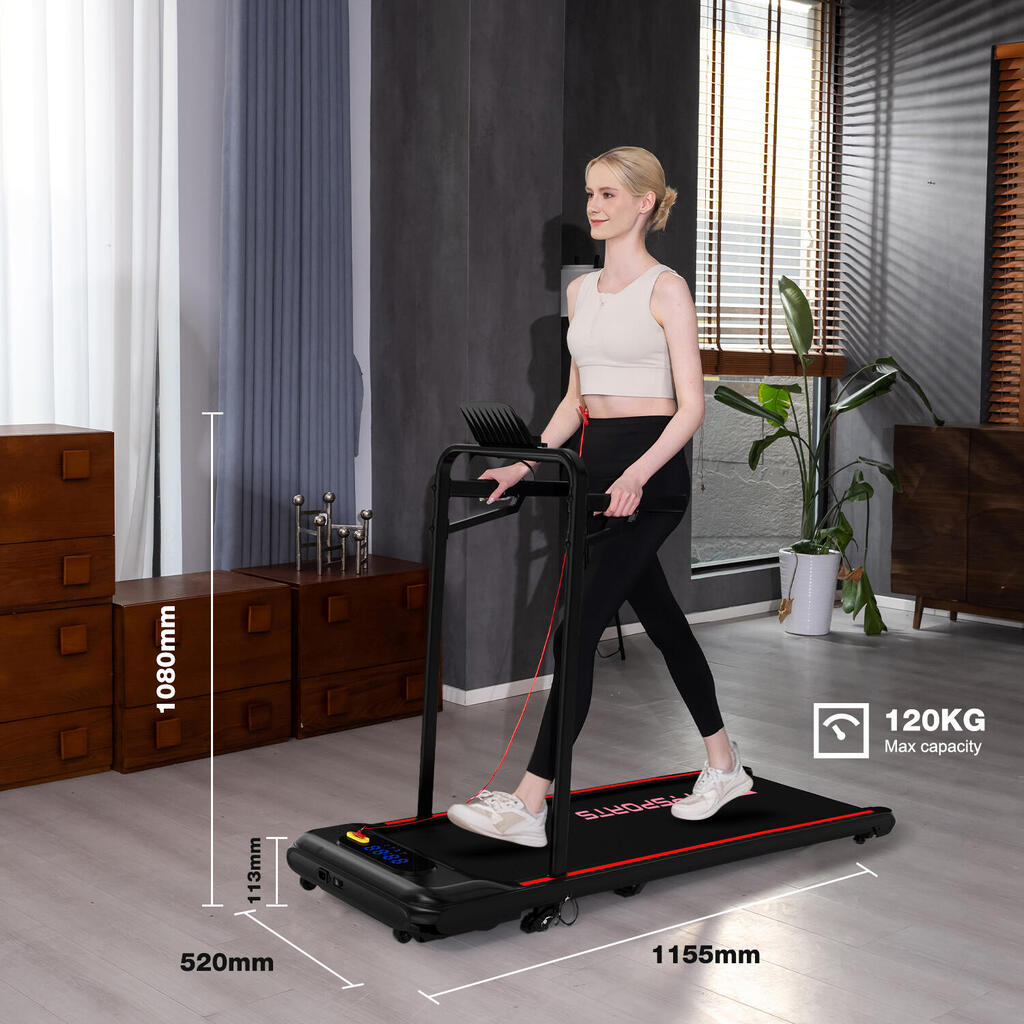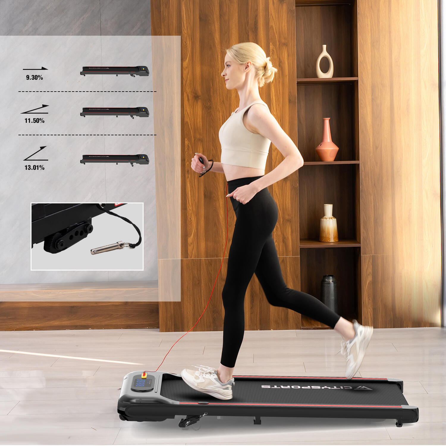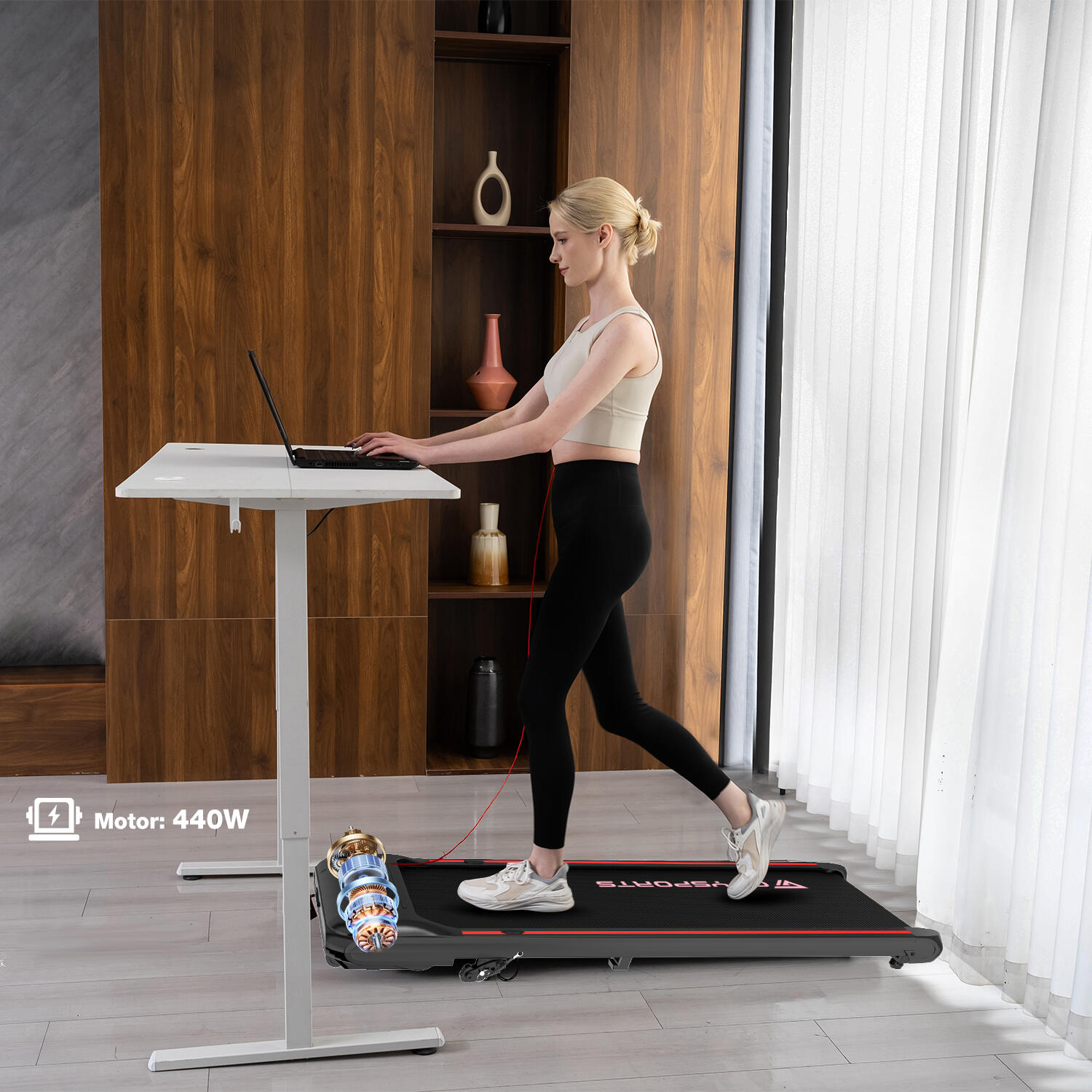2-in-1 under-desk treadmill with 3 adjustable incline levels. Features powerful 440W motor, LED display, and remote control. Max speed 6km/h, supports up to 120kg.