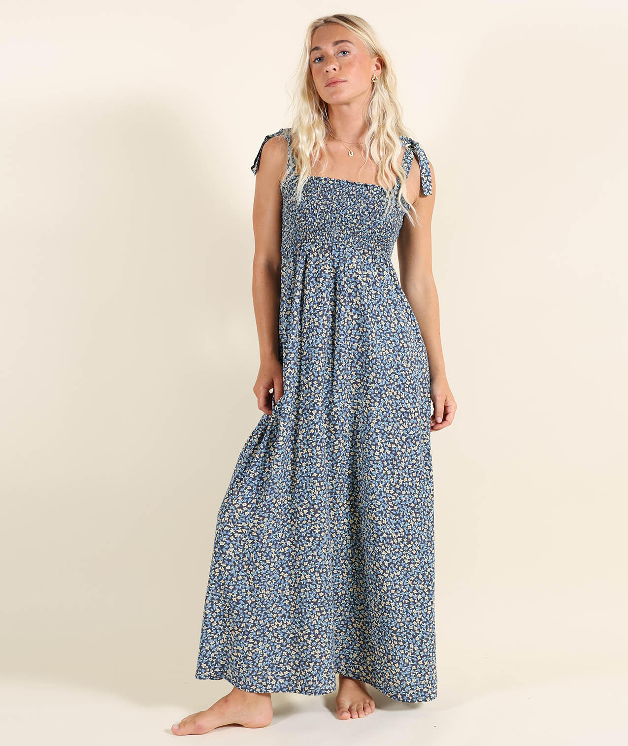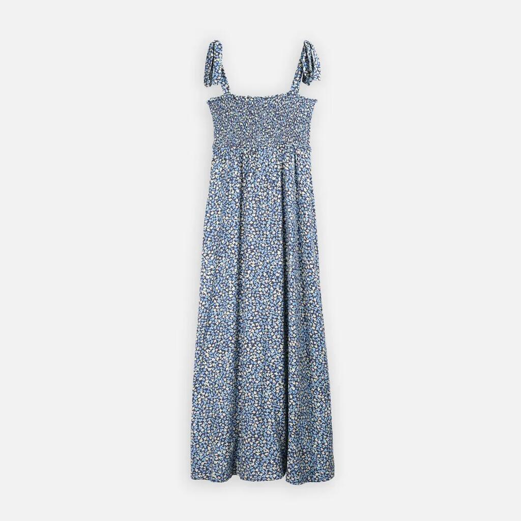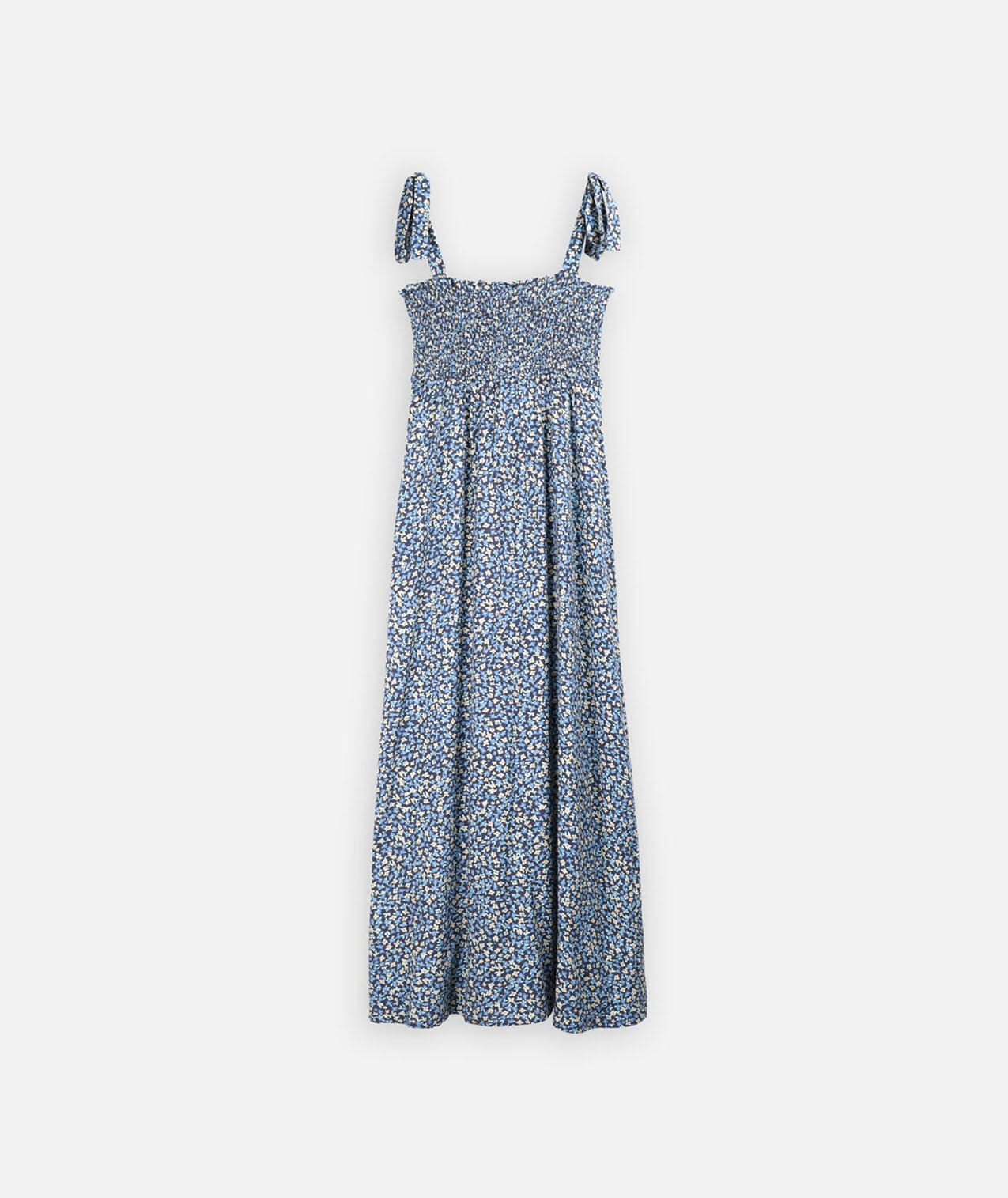 Long printed viscose dress with smocking, tie straps, Oxbow label.