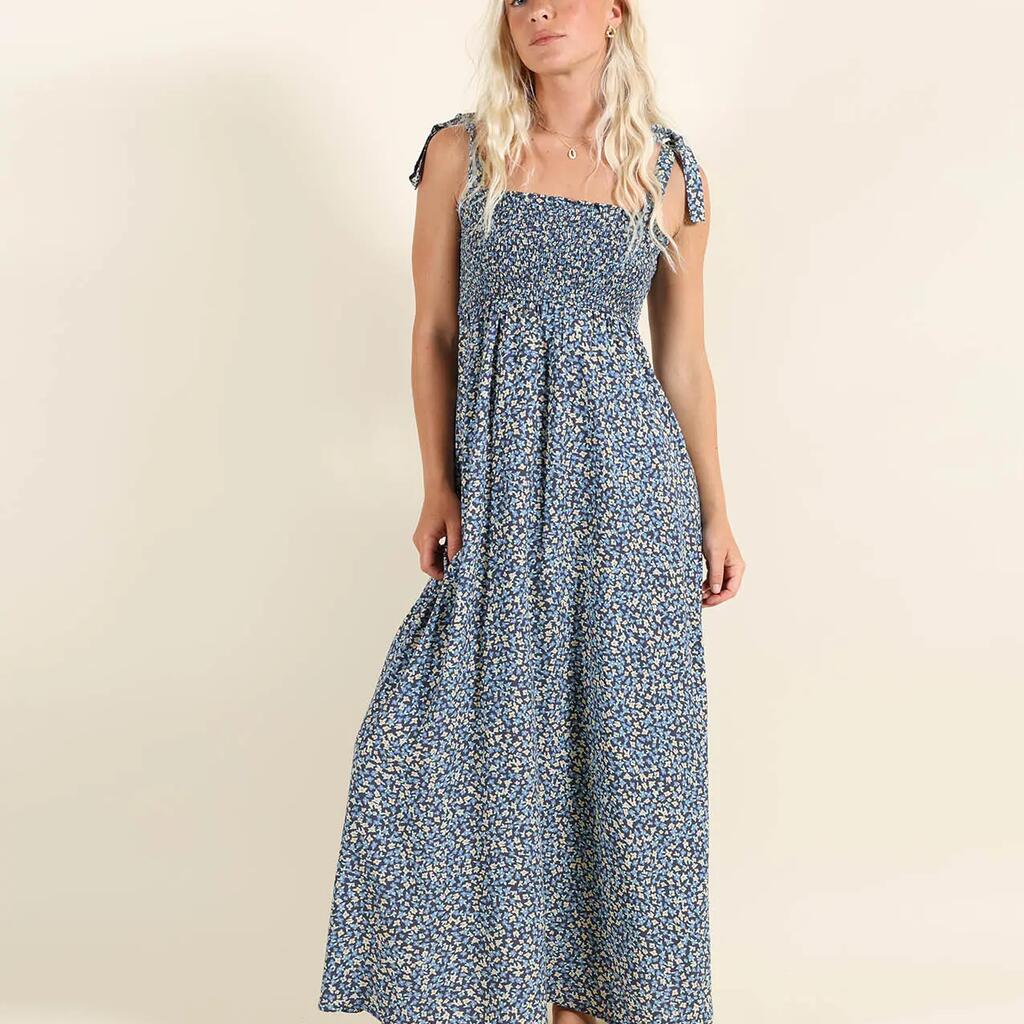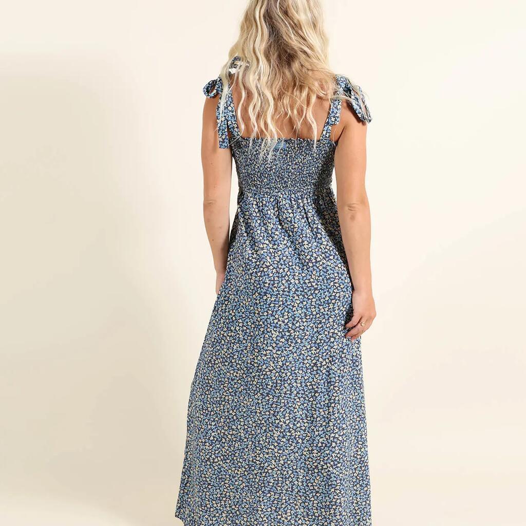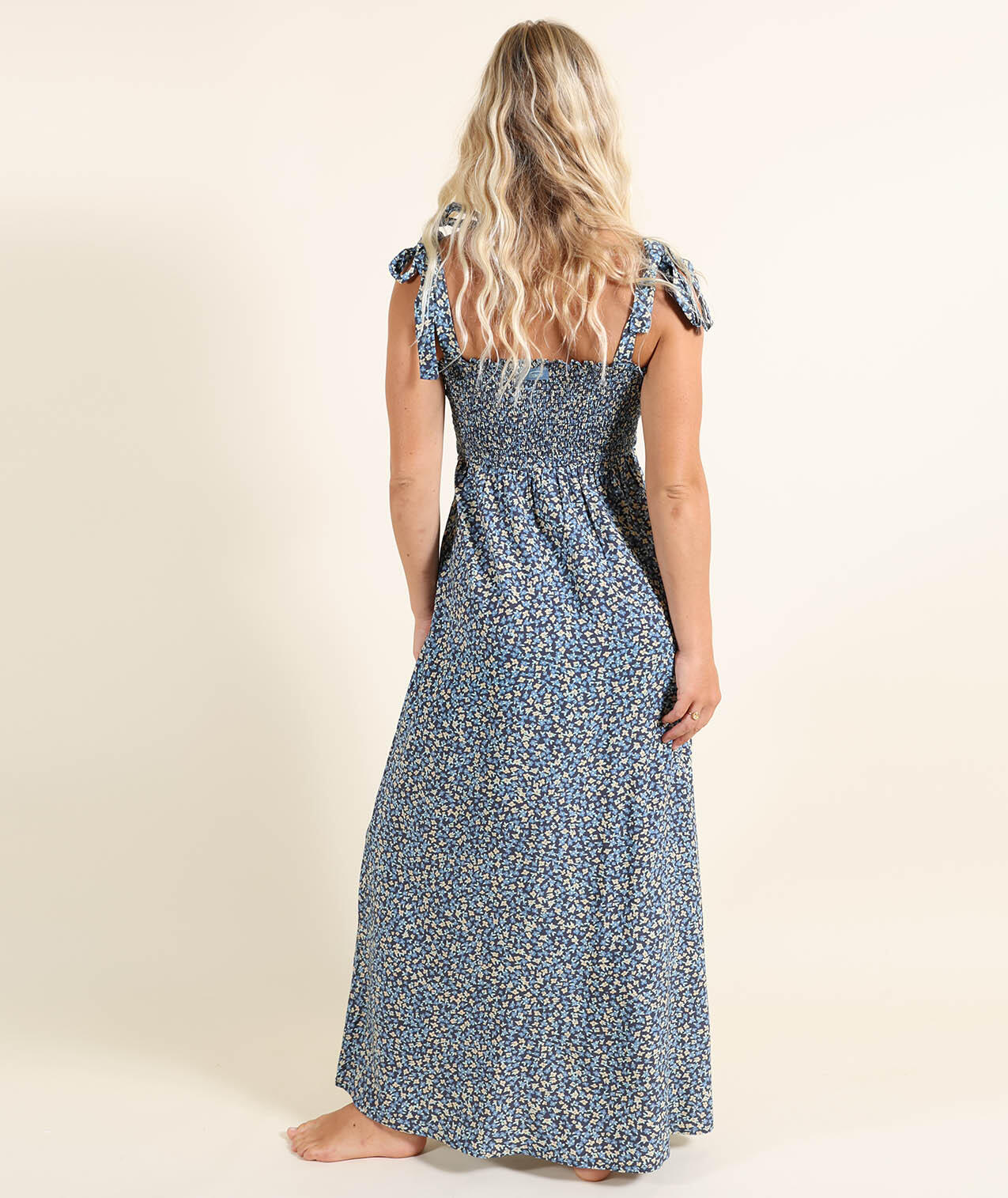 Long printed viscose dress with smocking, tie straps, Oxbow label.