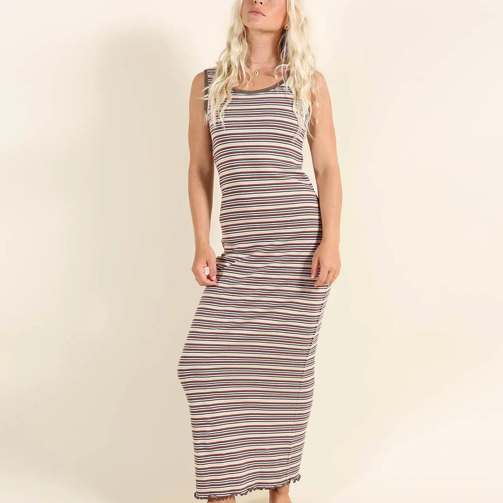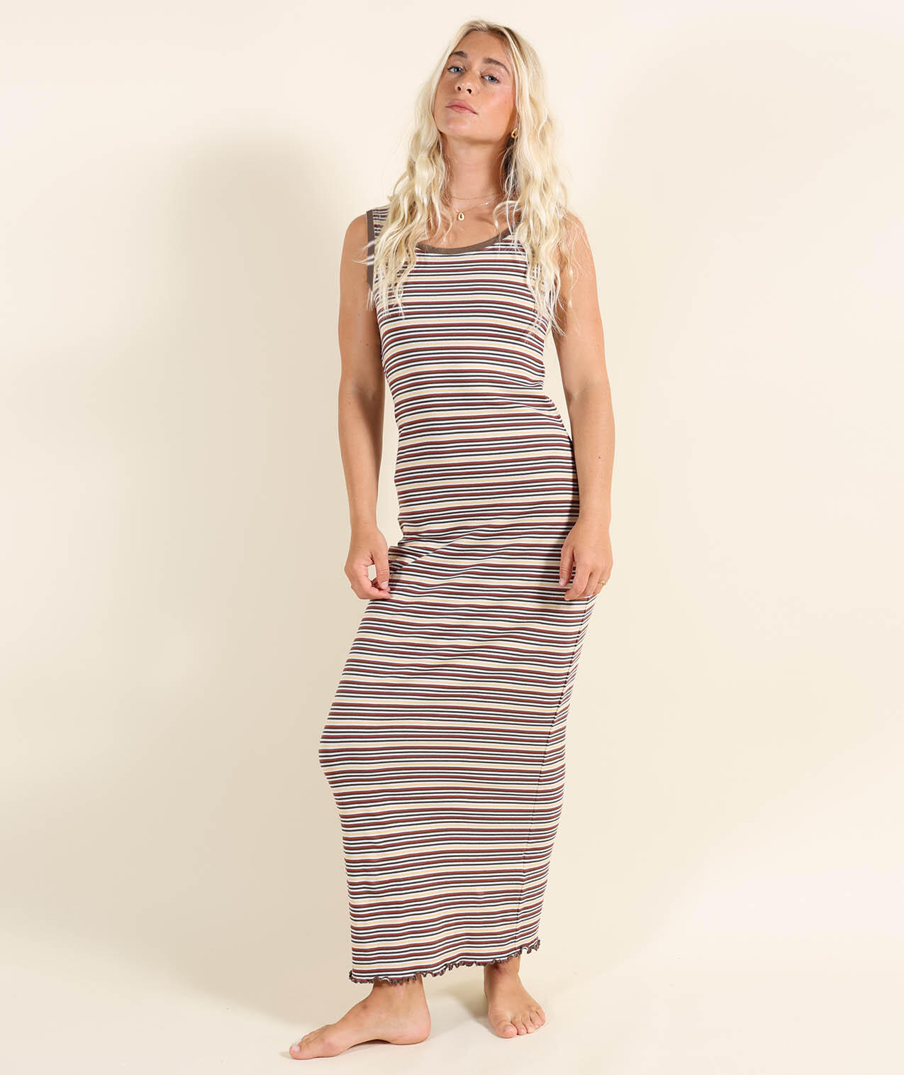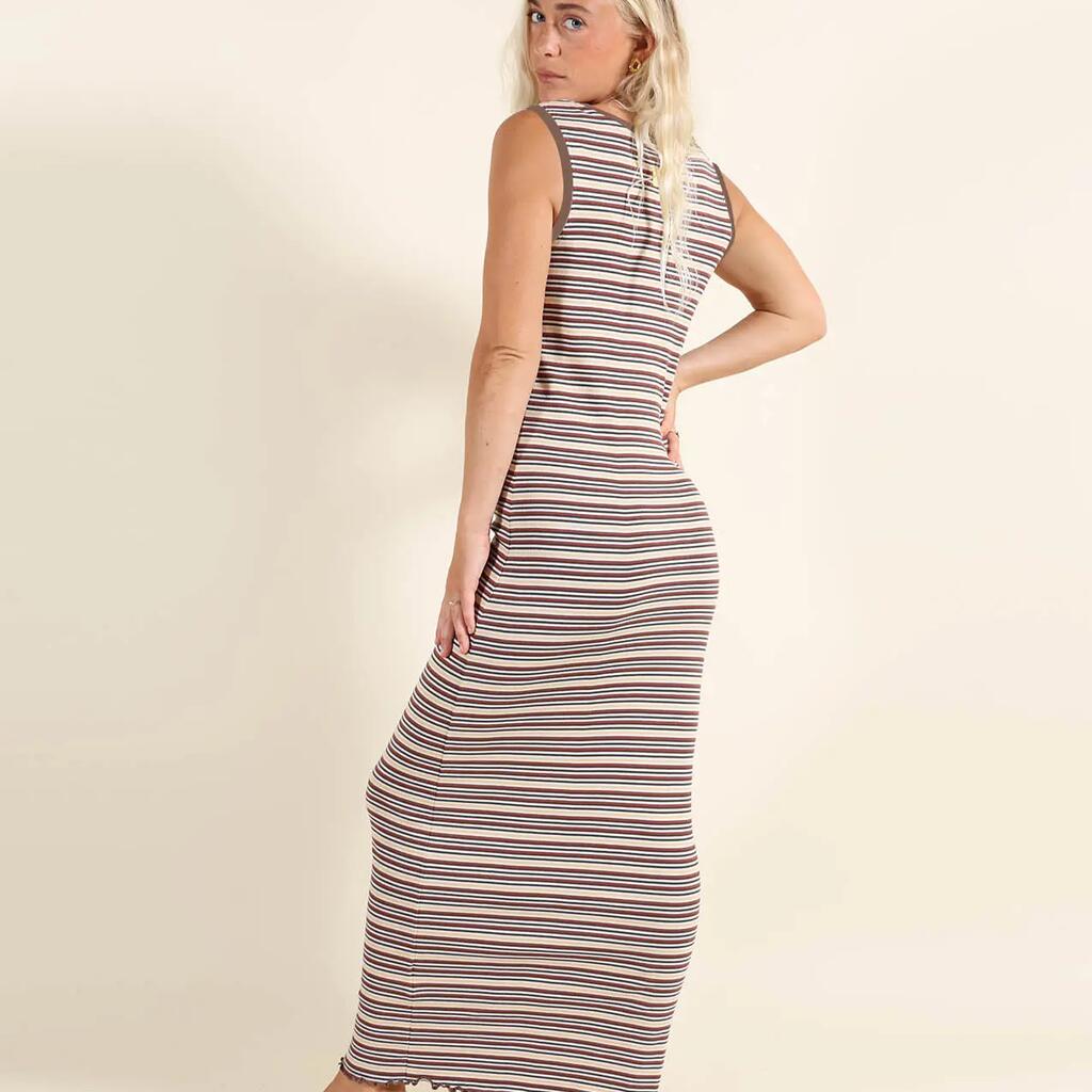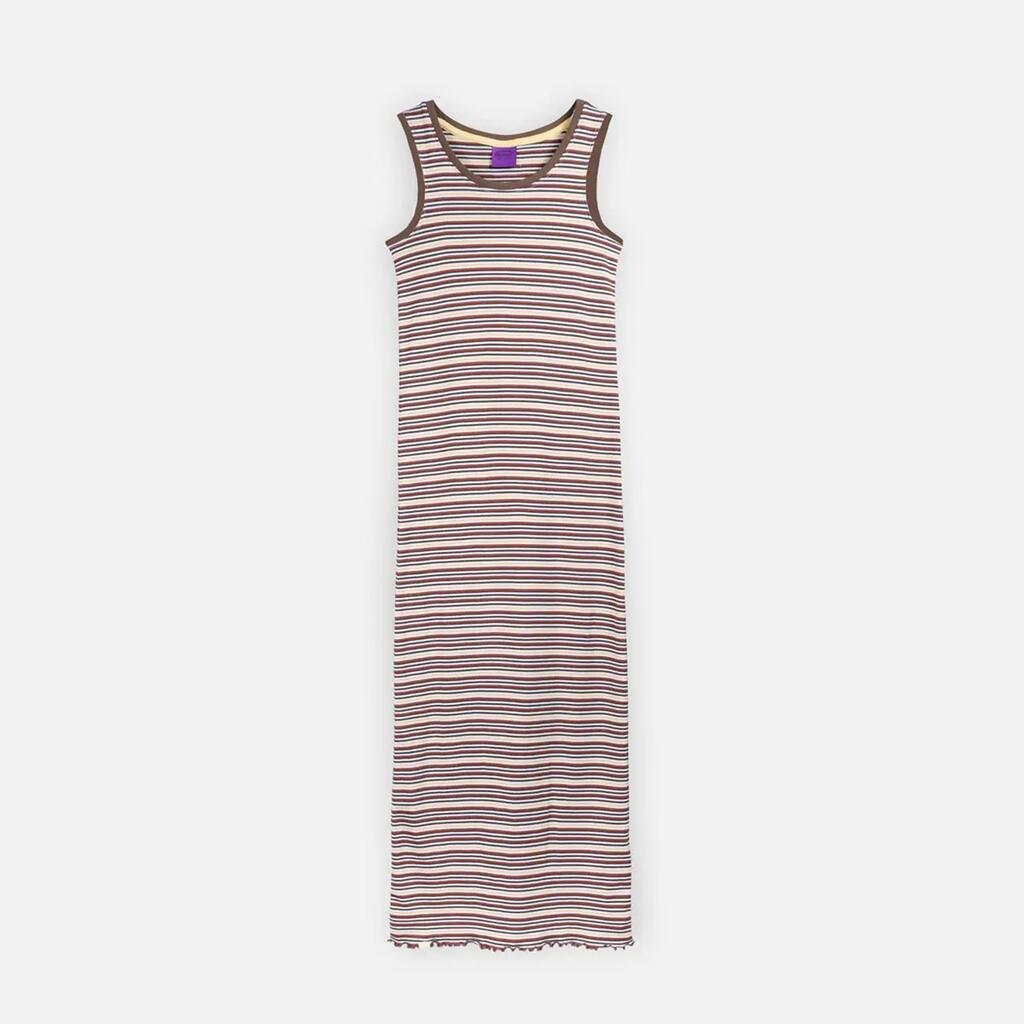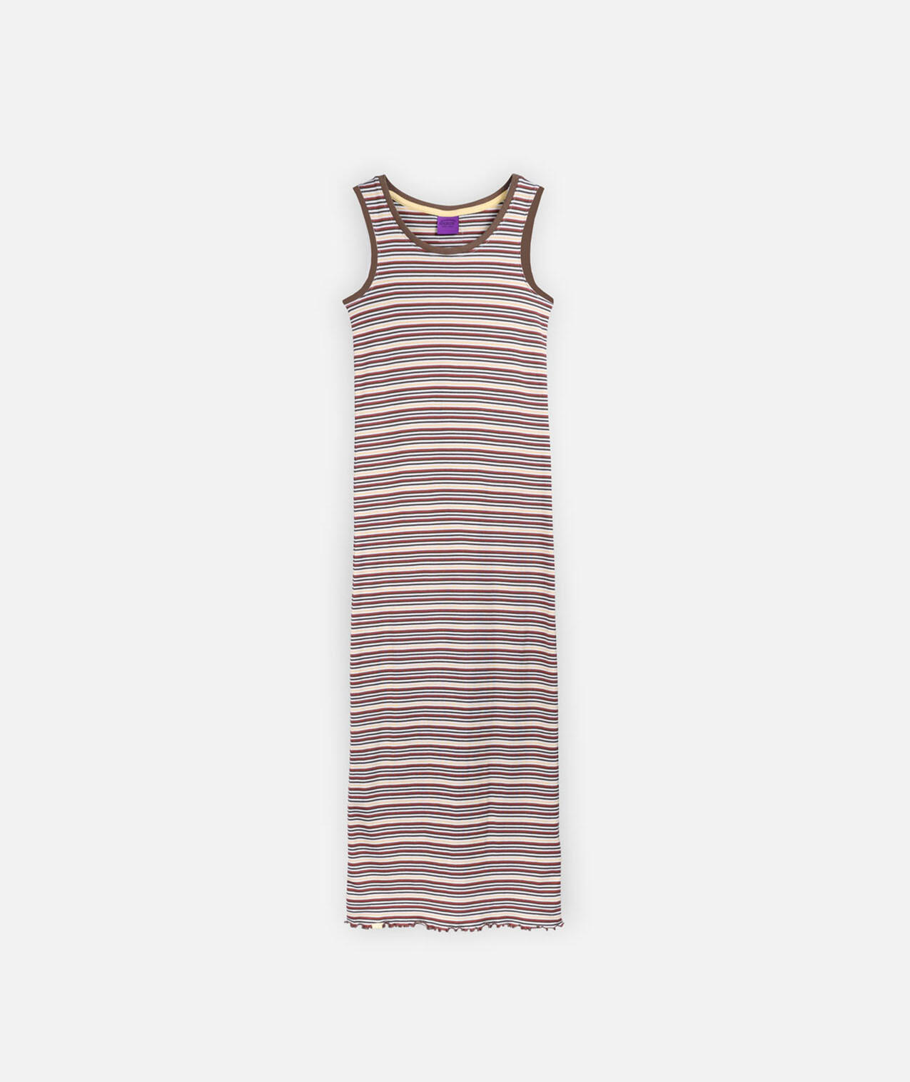 Slim fit stretchy cotton striped dress with ribbed collar, woven labels on back and lower hem.