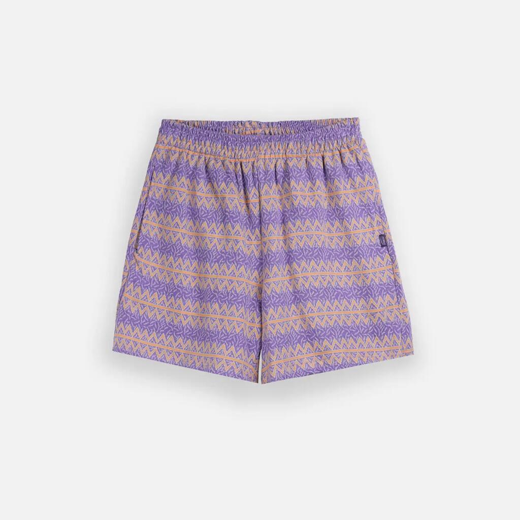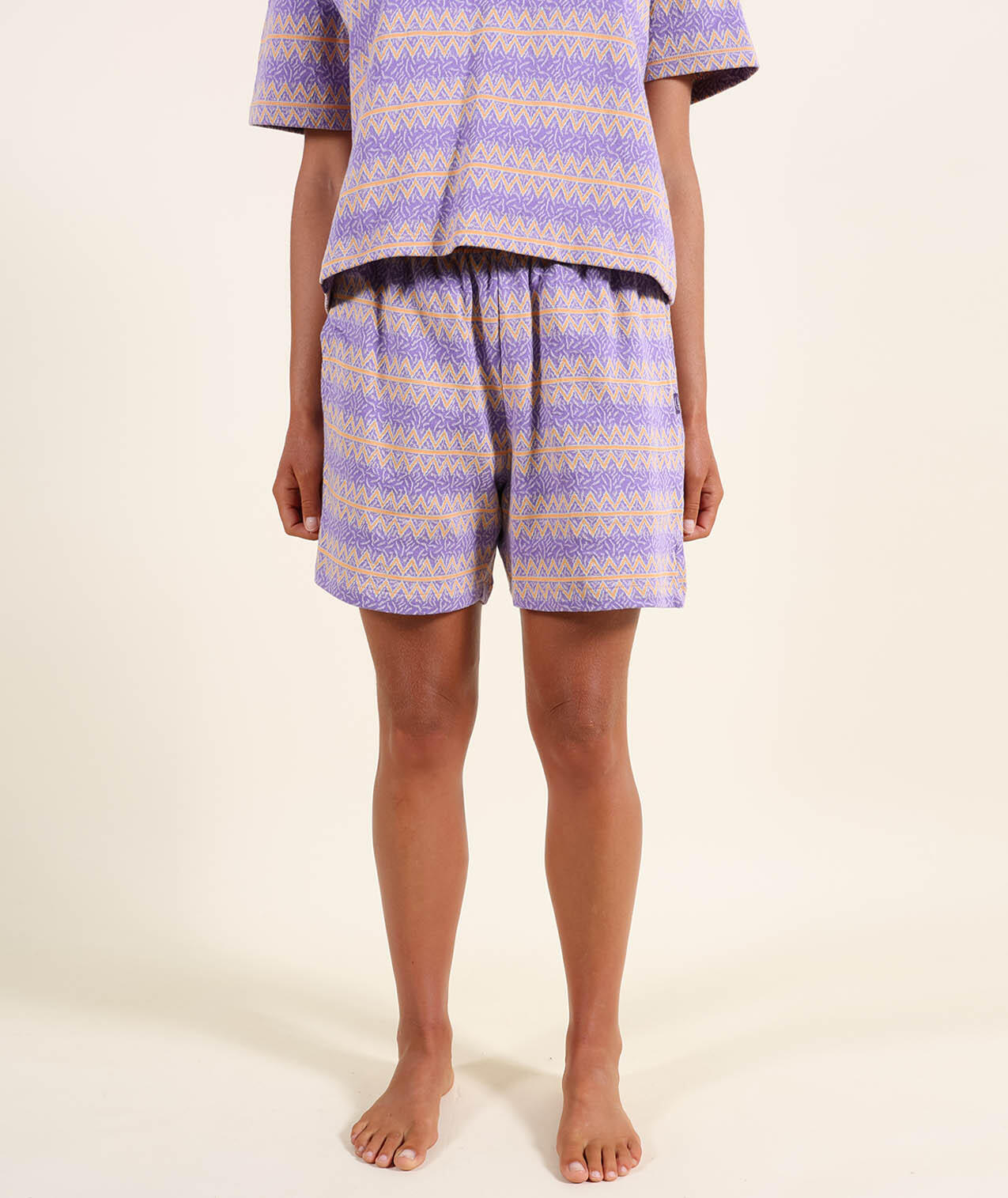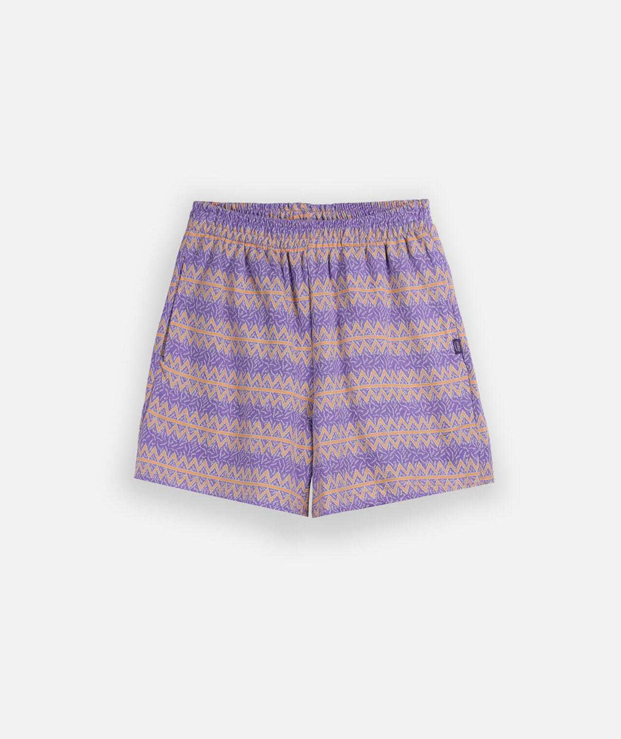 Cotton jacquard patterned shorts, vintage cut, elastic waistband, side pockets, Oxbow label on back and right leg.