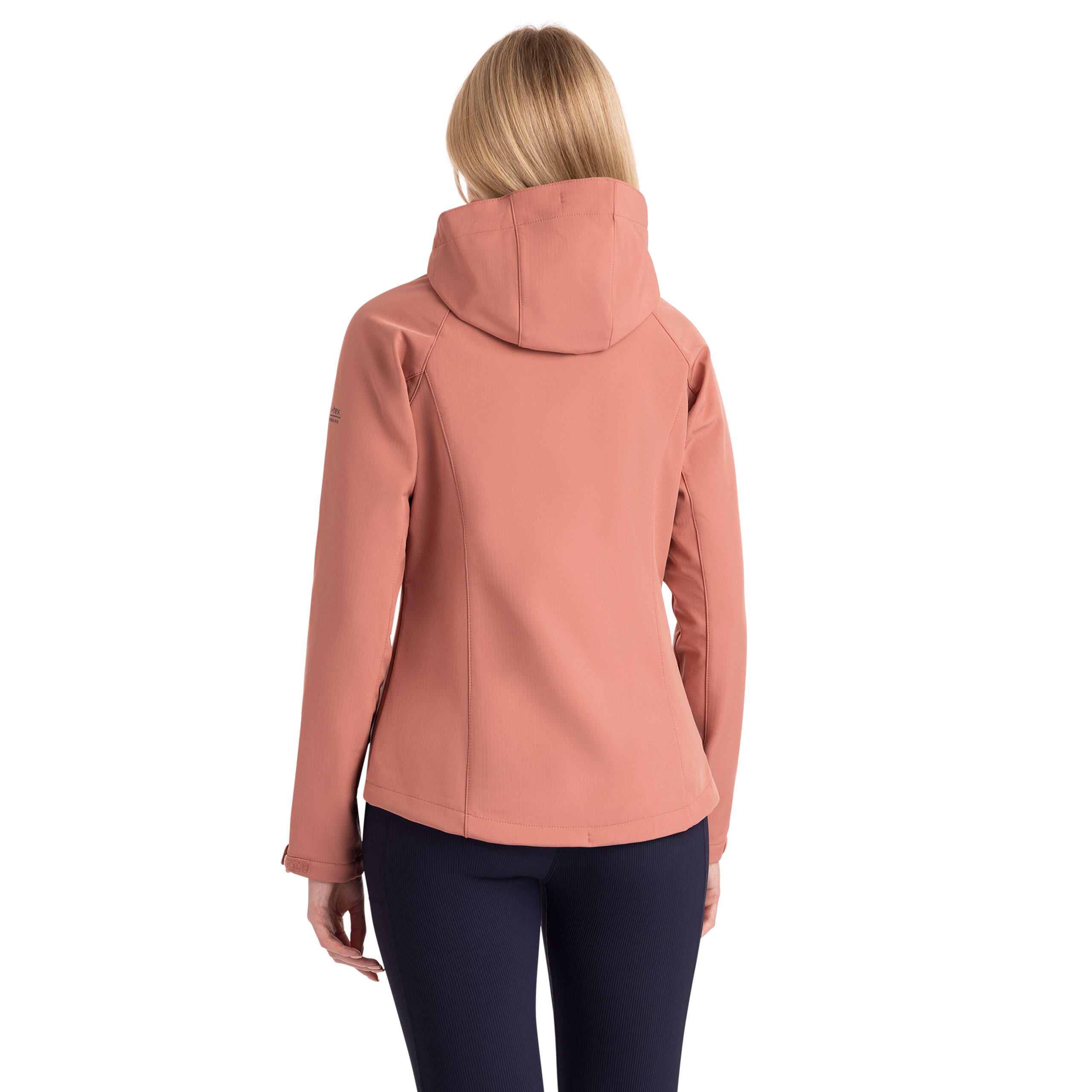 Stay dry, warm and protected in this women’s 8,000 mm waterproof, 3,000 mvp breathable, windproof softshell jacket with adjustable zip-off hood, 3 low profile zip pockets and contrast zips.