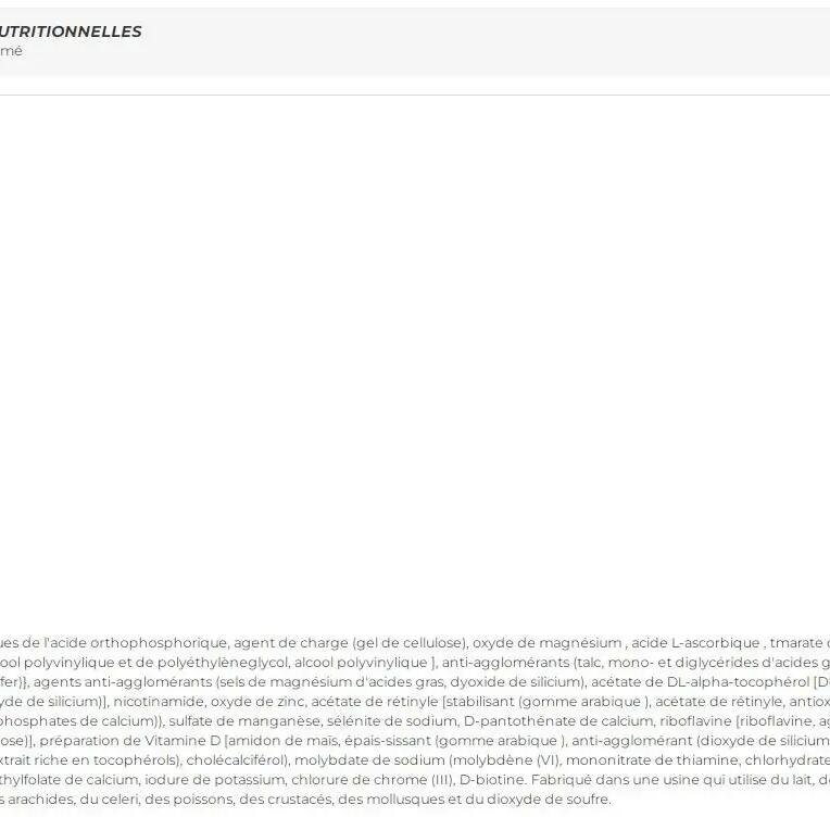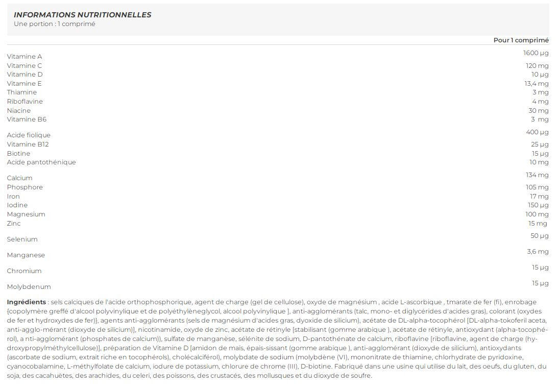 Ingredients : calcium salts of orthophosphoric acid, bulking agent (cellulose gel), magnesium oxide, L-ascorbic acid, coating {stabilisants [copolymère greffé d?alcool polyvinylique et de polyéthylèneglycol], anti-agglomérants (talc, mono- et diglycérides d?acides gras), colorant (oxydes de fer et hydroxydes de fer)}, iron(II) fumarate, DL-alpha-tocopherol acetate, anti-caking agents (magnesium salts of fatty acids, silicon dioxide), nicotinamide, zinc oxide, retinyl acetate, cyanocobalamin, manganese sulfate, D-calcium pantothenate, cholecalciferol, thiamine mononitrate, pyridoxine hydrochloride, riboflavin [Riboflavine, agent de charge (hydroxypropylméthylcellulose)], pteroylmonoglutamic acid, potassium iodide, sodium selenite, chromium(III) chloride, sodium molybdate (molybdenum(VI)), D-biotin. Allergens: Manufactured in a facility that uses milk, eggs, gluten, soy, shellfish, sulfur dioxide and peanuts.