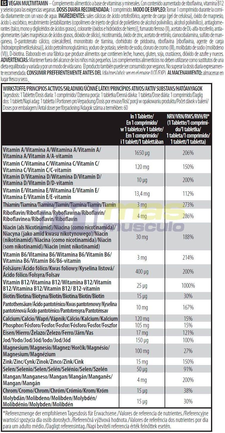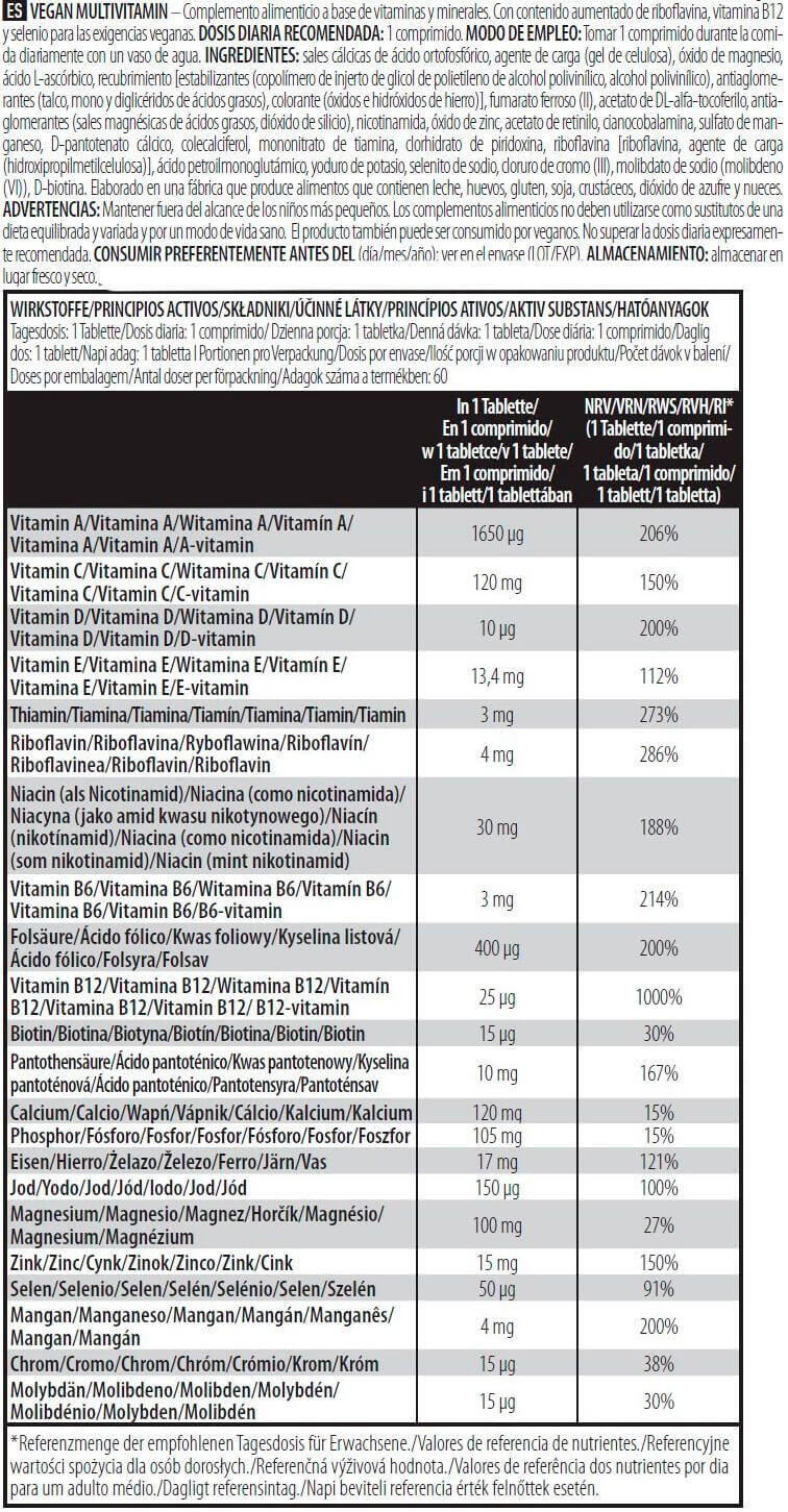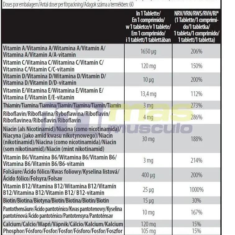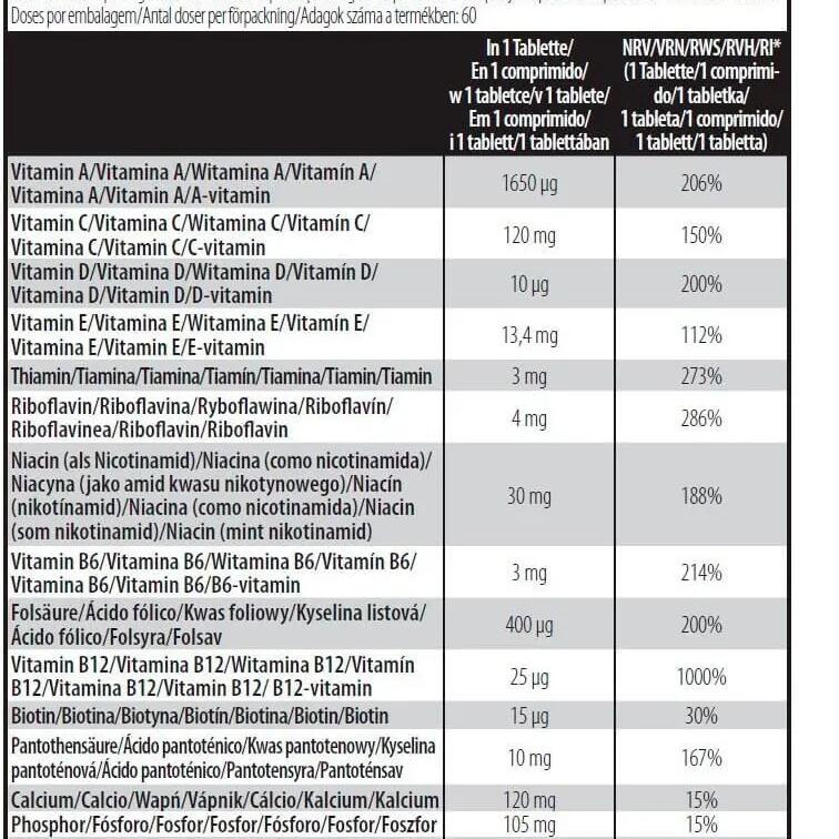 NUTRITIONAL INFORMATIONServing size: 1 tabletPer 1 tabletVitamin A 1600 µgVitamin C 120 mgVitamin D 10 µgVitamin E 13.4 mgThiamine 3 mgRiboflavin 4 mgNiacin 30 mgVitamin B6 3 mgFolic acid 400 µgVitamin B12 25 µgBiotin 15 µgPantothenic acid 10 mgCalcium 134 mgPhosphorus 105 mgIron 17 mgIodine 150 µgMagnesium 100 mgZinc 15 mgSelenium 50 µgManganese 3,6 mgChromium 15 µgMolybdenum 15 µg