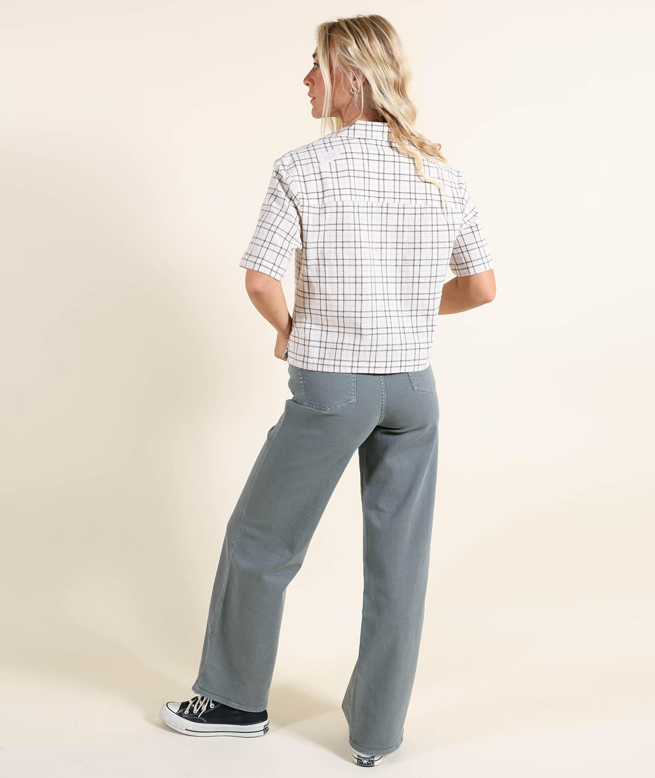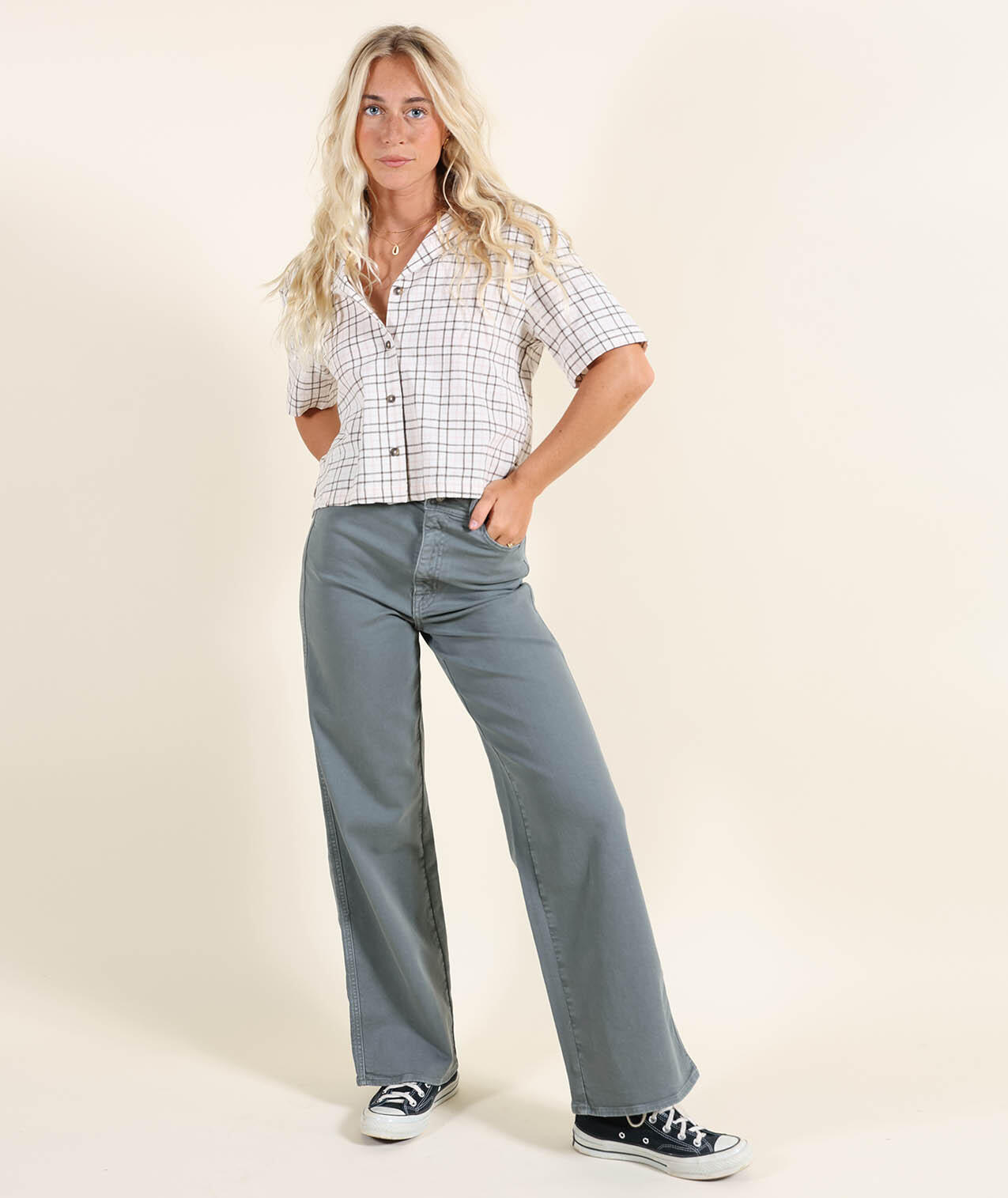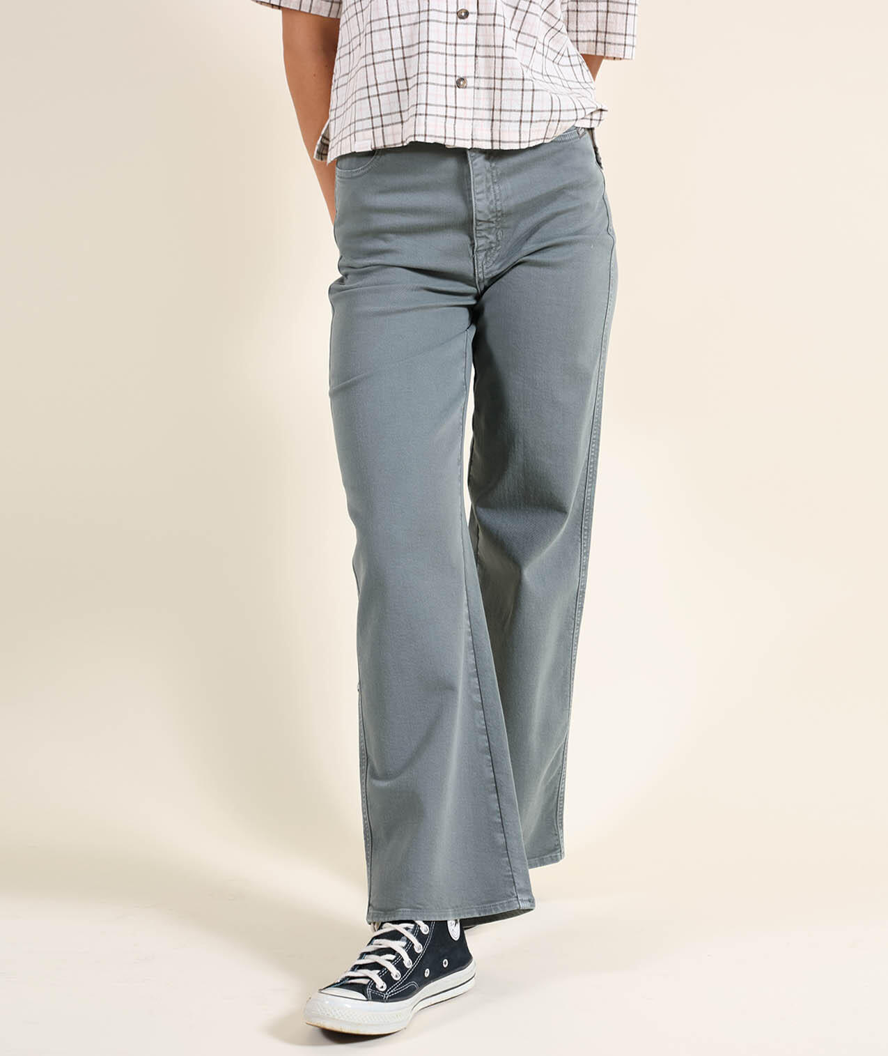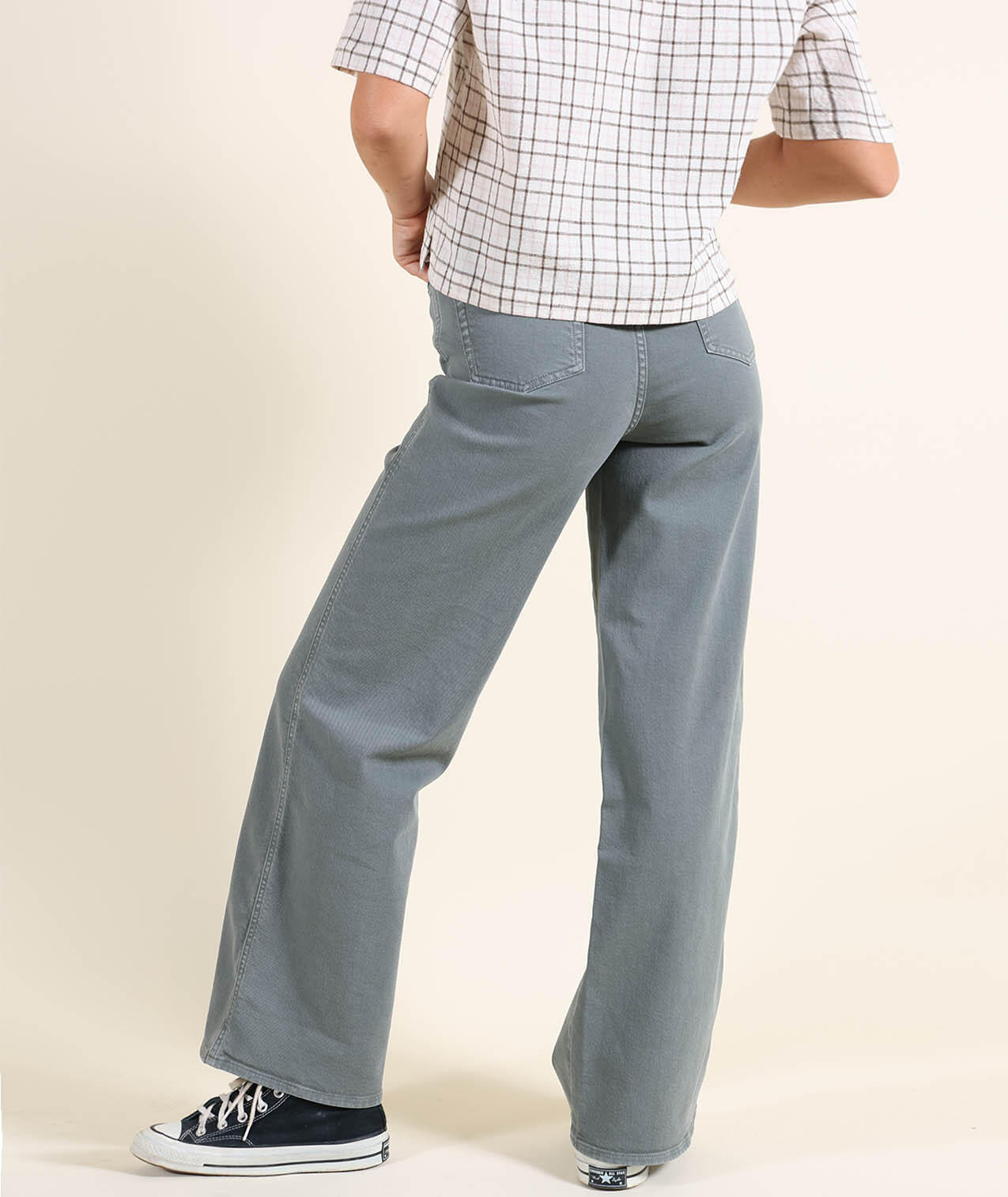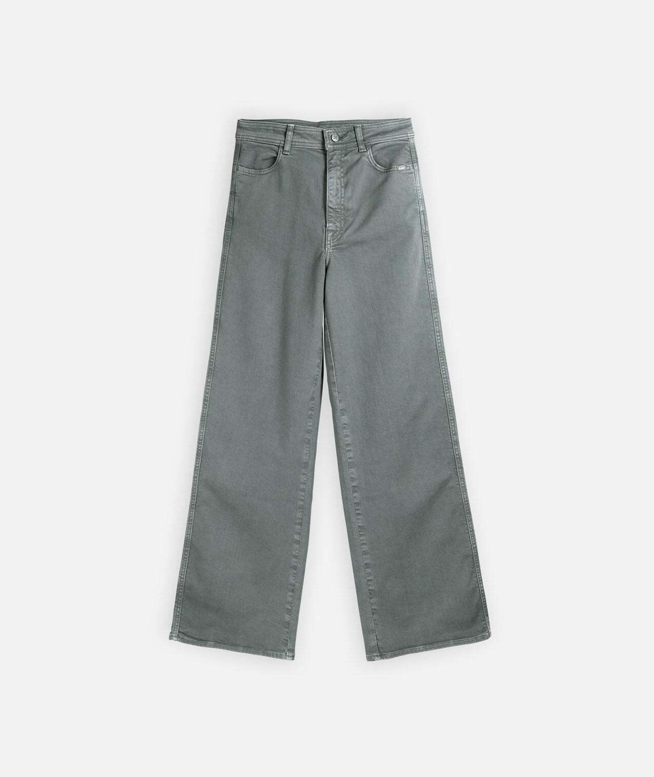 High-waisted, stretchy, comfortable pants with slightly flared leg and two welt pockets.