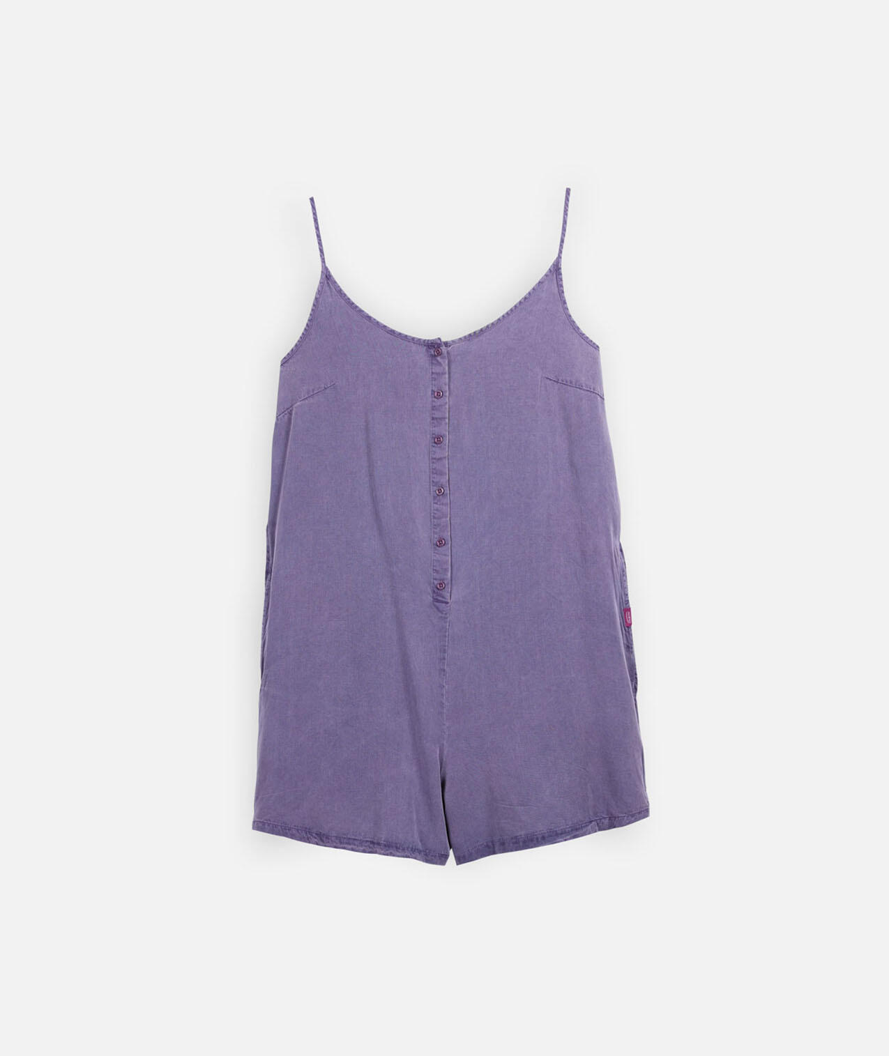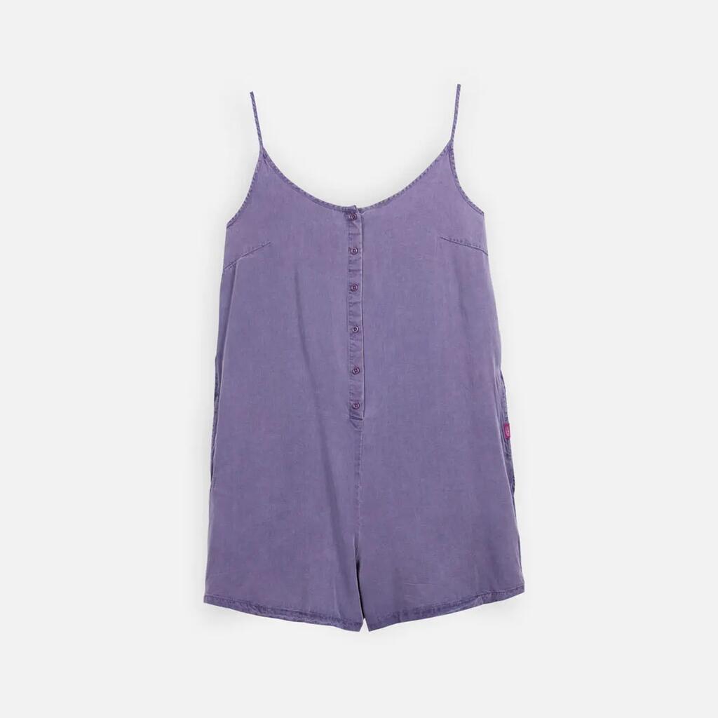 Viscose short jumpsuit with dip dye, buttoned front opening, two side pockets, 150 gsm fabric.