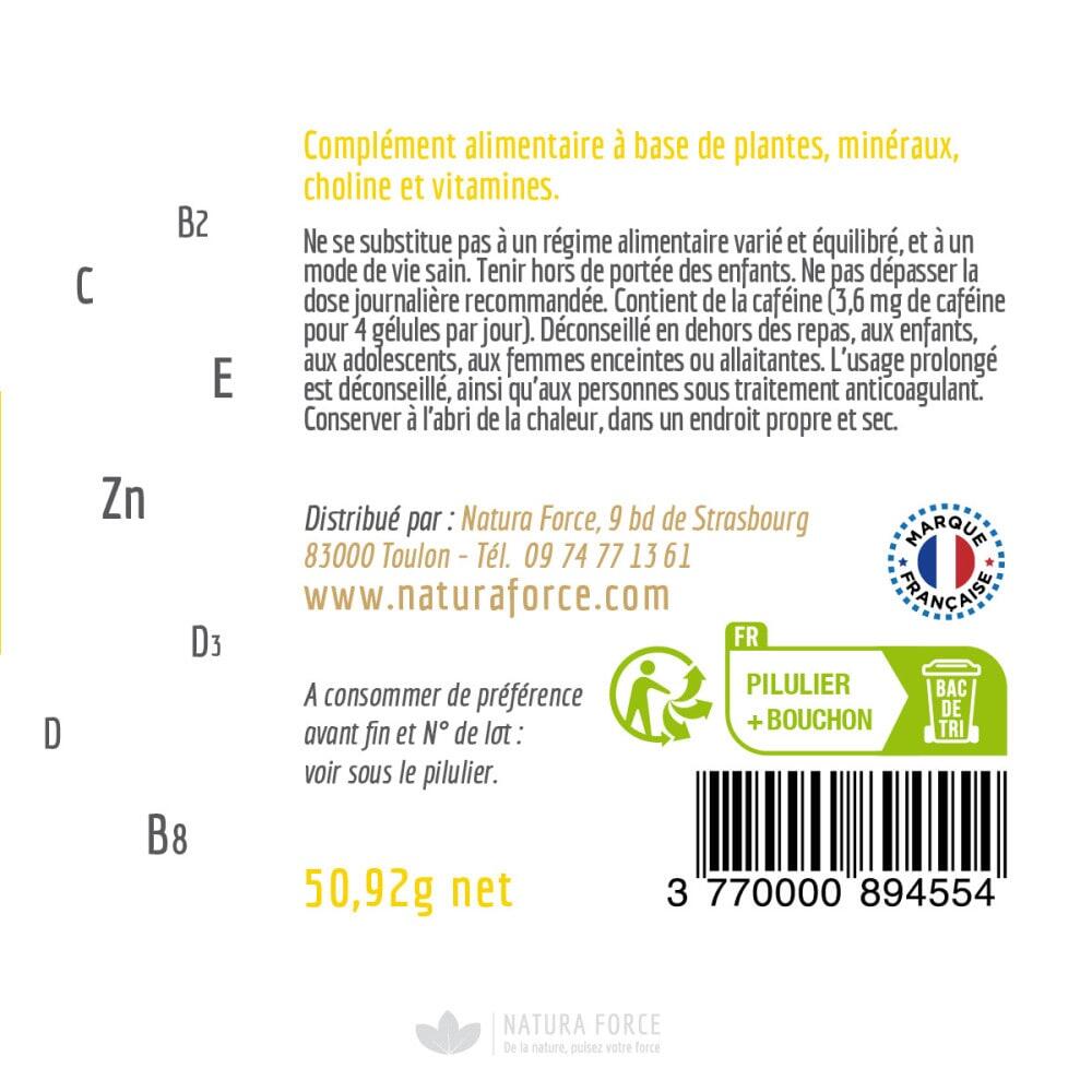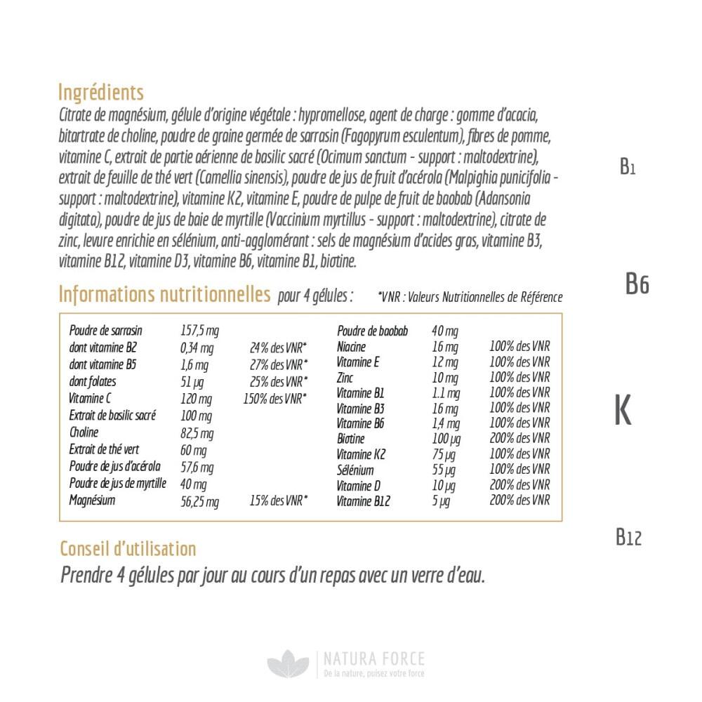 Ingredients : Magnesium citrate, capsule of plant origin: hydroxypropylmethylcellulose, bulking agent: acacia gum, choline bitartre, sprouted buckwheat seed powder (Fagopyrum esculentum), apple fiber, vitamin C, holy basil aerial part extract (Ocimum sanctum - carrier : maltodextrin), green tea leaf extract (Camelia sinensis), acerola fruit extract (Malpighia punicifolia - carrier maltodextrin), baobab fruit pulp powder (Adansonia digitata), bilberry berry extract (Vaccinium myrtillus - carrier : maltodextrin), vitamin E, zinc cirate, vitamin K2, selenium-enriched yeast, anti-caking agent: magnesium fatty acid salt, niacin, vitamin B12, vitamin D, vitamin B6, vitamin B1, biotin.