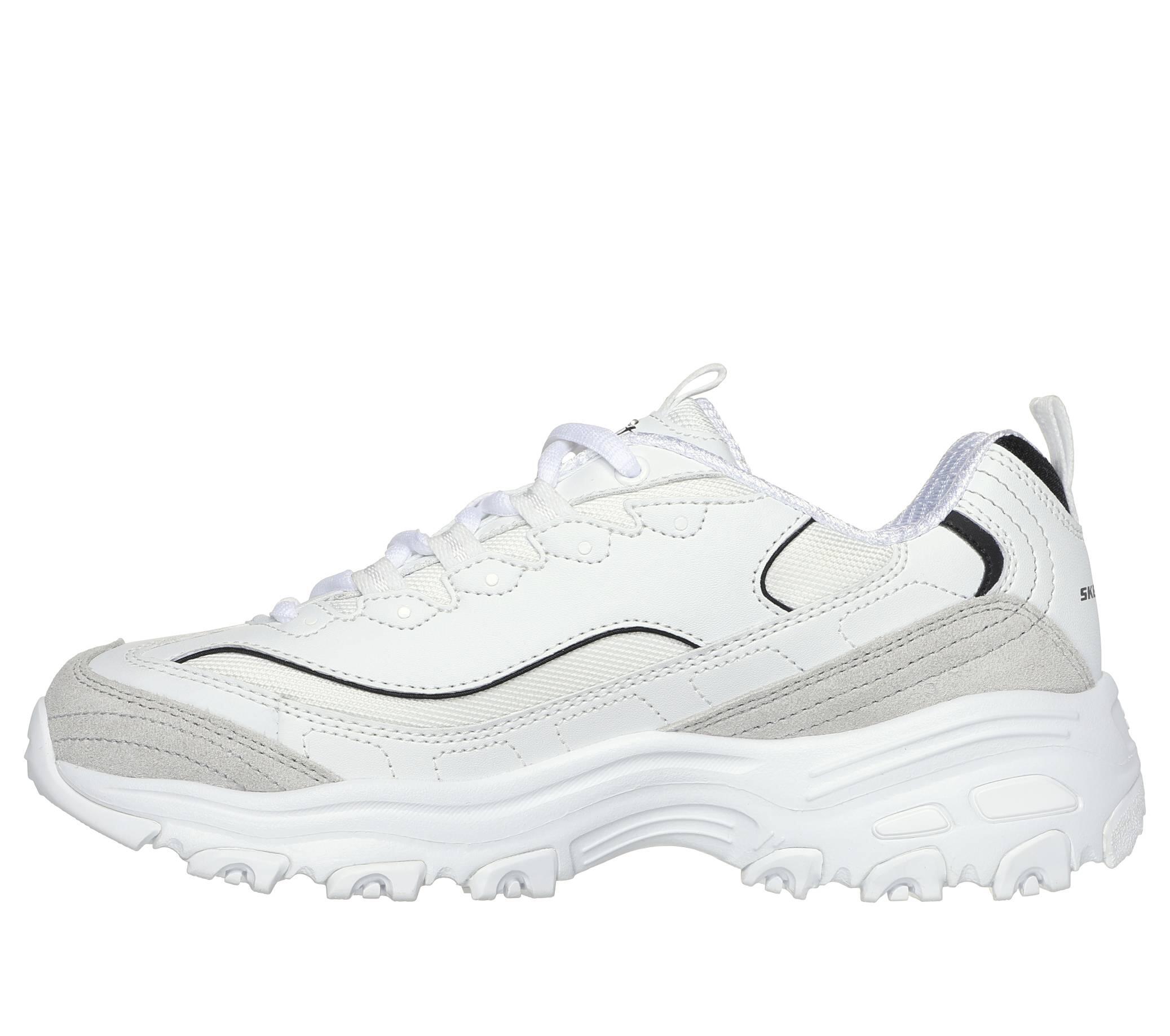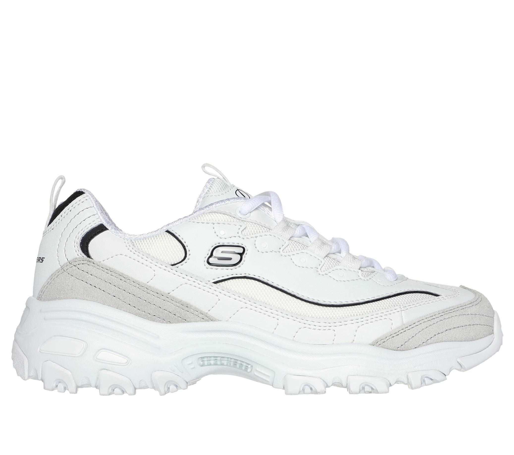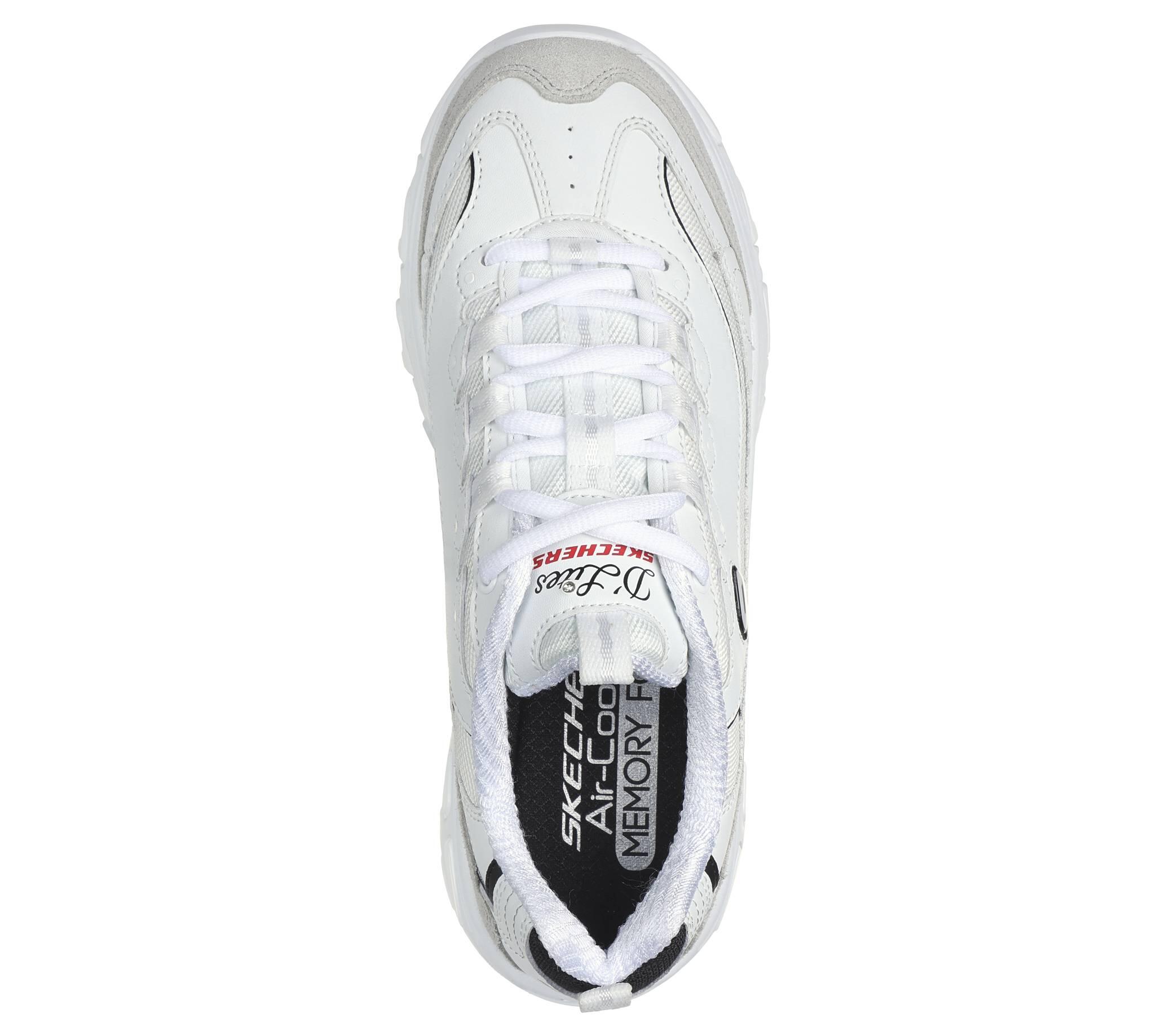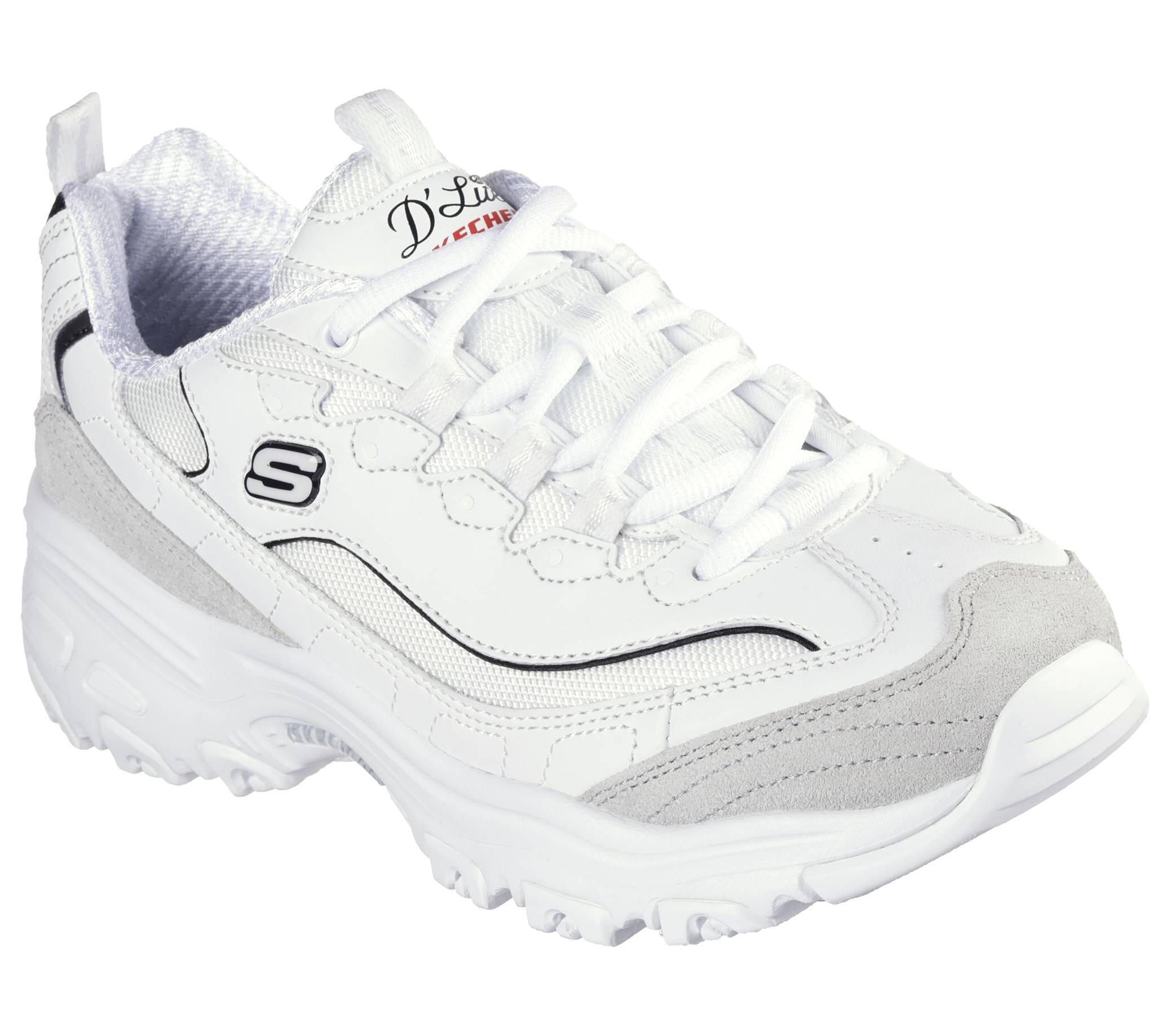 The SKECHERS D'LITES NEW HEAT: Lace-up sneakers with durable cowhide leather upper, rubber sole, and Air Cooled Memory Foam insole.