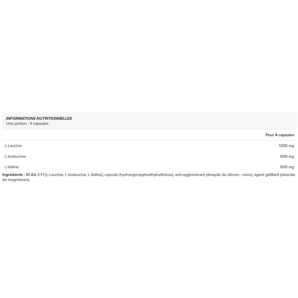 Pure BCAA 2:1:1 from USN is a premium quality amino acid supplement with a 2: 1: 1 ratio - known as the most efficiently absorbed ratio of amino acids.BCAAs are a complex of three amino acids: L-Leucine, L-Isoleucine and L-Valine, which support muscle gains. By reducing fatigue, they support endurance, increase energy and aid muscle repair and recovery. They account for 35% of the amino acids present in muscle tissue, and are among the essential amino acids that the body cannot synthesize. Supplements (or food) are therefore needed to meet the daily requirements of all bodybuilding enthusiasts.Replenishing the body, and in particular muscle tissue, with BCAAs will enable it to regenerate better and faster. This helps avoid muscle fatigue and reduces the risk of injury.BCAAs also play a part in muscle protein synthesis, and down-regulate cortisol levels for a rapid increase in lean muscle mass.This formula is ideal for vegans.Weight per capsule: 0.73 g.