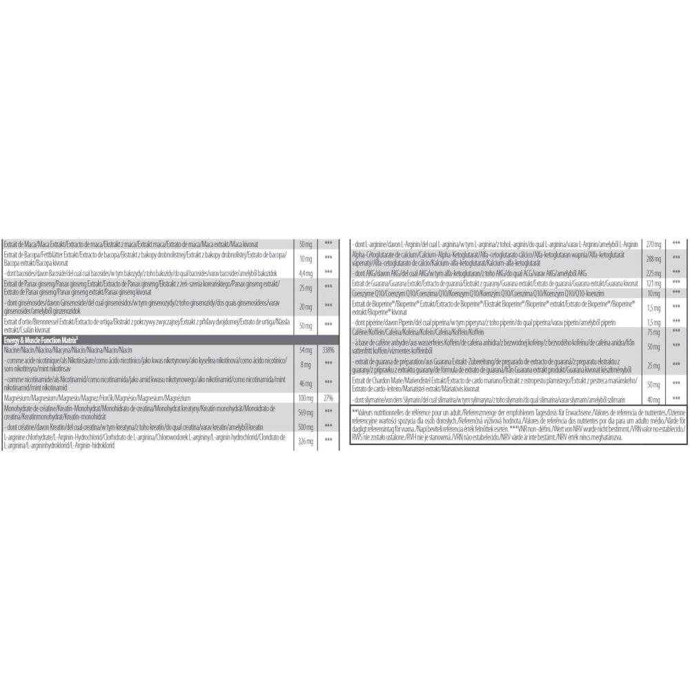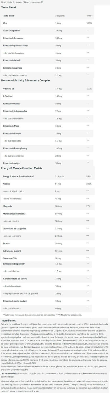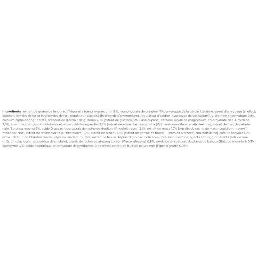 Ingredients : fenugreek seed extract (Trigonella foenum-graecum) 19%, creatine monohydrate 17%, capsule shell [gélatine, agent d?en-robage (shellac), colorant (oxydes de fer et hydroxydes de fer), regulateur d?acidité (hydroxyde d?ammonium), regulateur d?acidité (hydroxyde de potassium)], L-arginine hydrochloride 9.8%, calcium-alpha-ce-toglutarate, guarana extract preparation 7.5% [extrait de guarana (Paullinia cupana), caféine], magnesium oxide, l-Ornithine hydrochloride 3.8%, bulking agent (cellulose gel), Ashwa-gandha extract 3.2% [extrait deracine d?ashwagandha (Withania somnifera), maltodextrine], saw palmetto fruit extract (Serenoa repens) 3%, D-aspartic acid, rhodiola root extract (Rhodiola rosea) 2.1%, maca extract 1.7% [extraits de racine de Maca (Lepidium meyenii), maltodextrine], nettle root extract (Urtica dioica) 1.7%, broccoli extract 1.5% [extrait de germe de brocoli (Brassica oleracea), maltodextrine], caffeine anhydrous 1.5%, milk thistle fruit extract (Silybum marianum) 1.5%, spinach leaf extract (Spinacia oleracea) 1.5%, nicotinamide, anti-caking agents (ma-gnesium salts of fatty acids, silicon dioxide), Korean ginseng root extract (Panax ginseng) 0.8%, zinc oxide, bakopa plant extract (Bacopa monnieri) 0.3%, coenzyme Q10, nicotinic acid, pyridoxine hydrochloride, Bioperine® black pepper fruit extract (Piper nigrum) 0.05%.