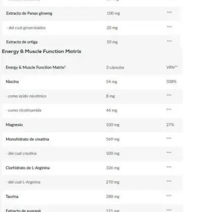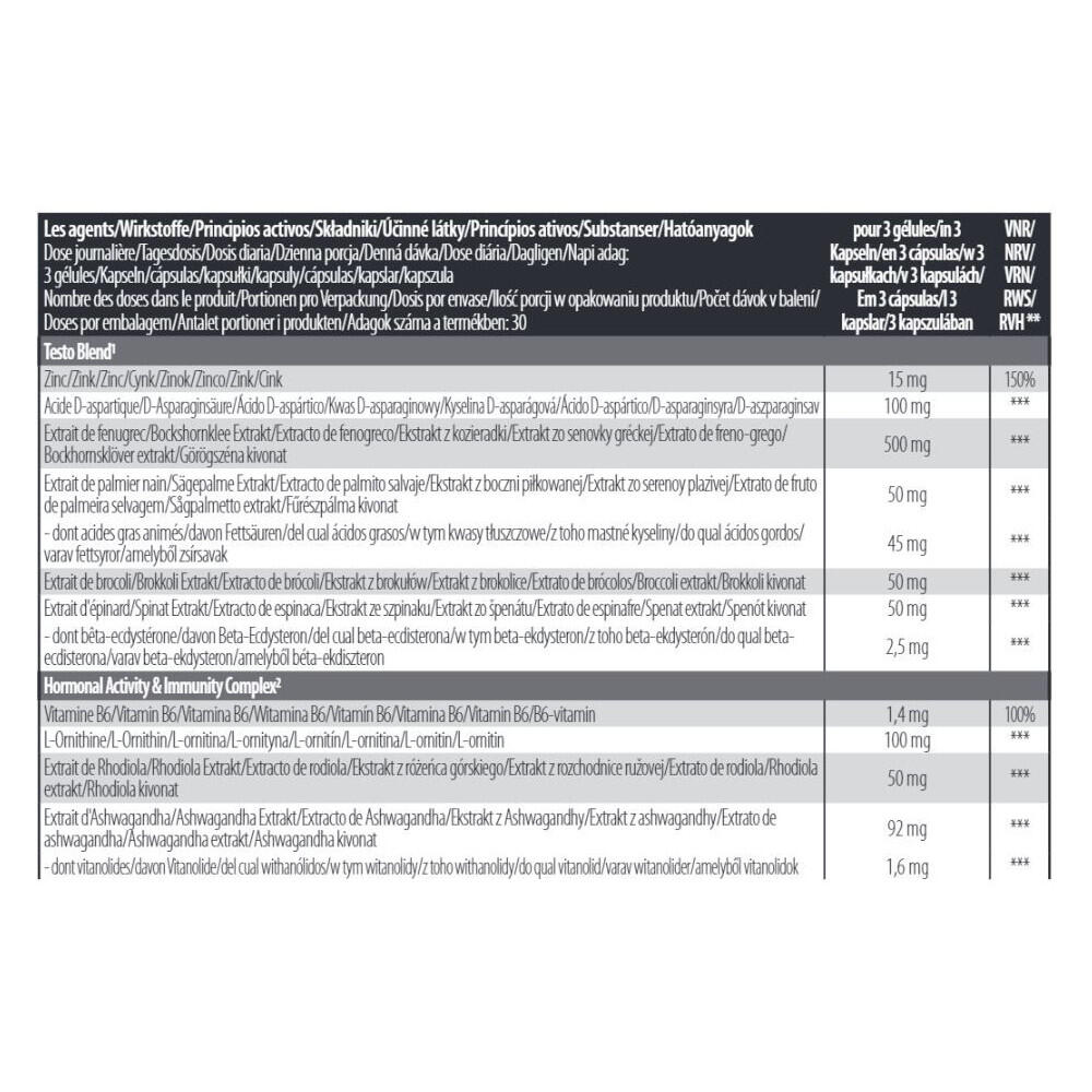 NUTRITIONAL INFORMATION Serving size: 3 capsules Per 3 AR% capsules Testo Blend* Zinc 15 mg 150 % D-aspartic acid 100 mg - Fenugreek extract Fenugreek extract 500 mg Saw palmetto extract of which animal fatty acids 50 mg 45 mg - - Broccoli extract 50 mg - Spinach extract Spinach extract including beta-ecdysterone 50 mg - Spinach extract 2.5 mg - - Hormonal Activity & Immunity Complex Vitamin B6 1.4 mg 100 L-Ornithine 100 mg - Rhodiola extract Rhodiola extract 50 mg - Ashwagandha extract Ashwagandha extract including vitanolides 92 mg 1.6 mg - - Maca extract 50 mg - Bacopa extract Bacopa extract including bacosides 10 mg 4.4 mg - - Panax Ginseng extract including ginsenosides 25 mg 20 mg - - Nettle extract 50 mg - Energy & Muscle Function Matrix*** Niacin as nicotinic acid as nicotinamide 54 mg 8 mg 46 mg 338 % - - Magnesium 100 mg 27% Magnesium Monohydrate of which creatine 569 mg 500 mg - - L-arginine hydrochloride of which L-arginine 326 mg 270 mg - - Calcium alpha-ketoglutarate i