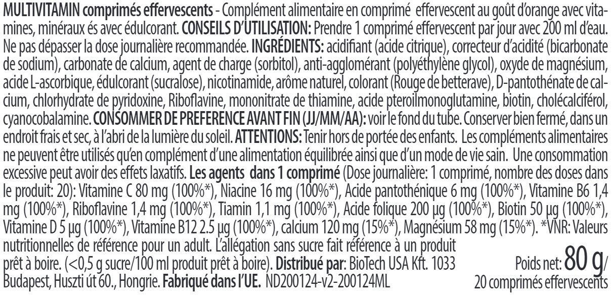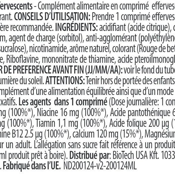 NUTRITIONAL INFORMATIONServing size: 1 tabletPer 1 tablet NRV*Vitamin C 80 mg 100%Niacin 16 mg 100%Pantothenic acid 6 mg 100%Vitamin B6 1.4 mg 100%Riboflavin 1.4 mg 100%Thiamine 1.1 mg 100%Folic acid 200 µg 100%Biotin 50 µg 100%Vitamin D 5 µg 100%Vitamin B12 2.5 µg 100%Calcium 120 mg 15%Magnesium 58 mg 15% (in mg)*NRV: Nutrient Reference Value for an adult.