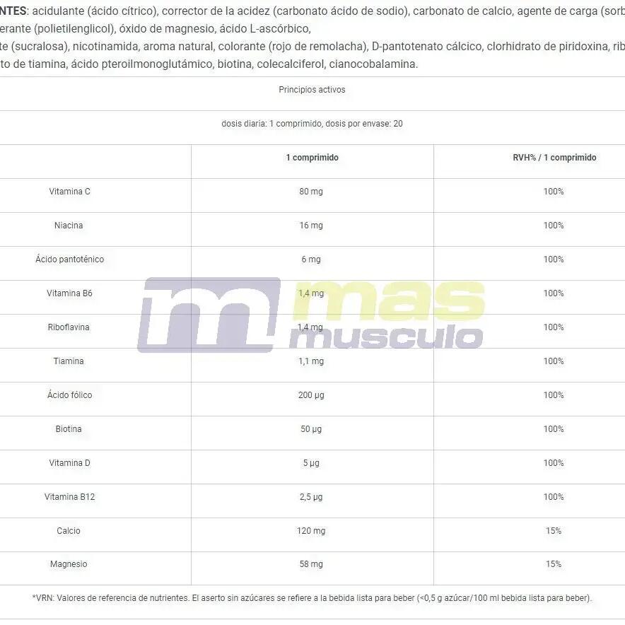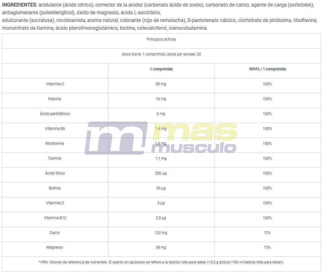Ingredients: acid (citric acid), acidity regulator (sodium hydrogen carbonate), calcium carbonate, bulking agent (sorbitols), anti-caking agent (polyethylene glycol), magnesium oxide, L-ascorbic acid, sweetener (sucralose), nicotinamide, natural flavour, color (beet red), calcium D-pantothenate, pyridoxine hydrochloride, riboflavin, etc., pyridoxine hydrochloride, riboflavin, thiamine mononitrate, pteroylmonoglutamic acid, biotin, cholecalciferol, cyanocobalamin. pyridoxine hydrochloride, riboflavin, thiamine mononitrate, pteroylmonoglutamic acid, biotin, cholecalciferol, cyanocobalamin.