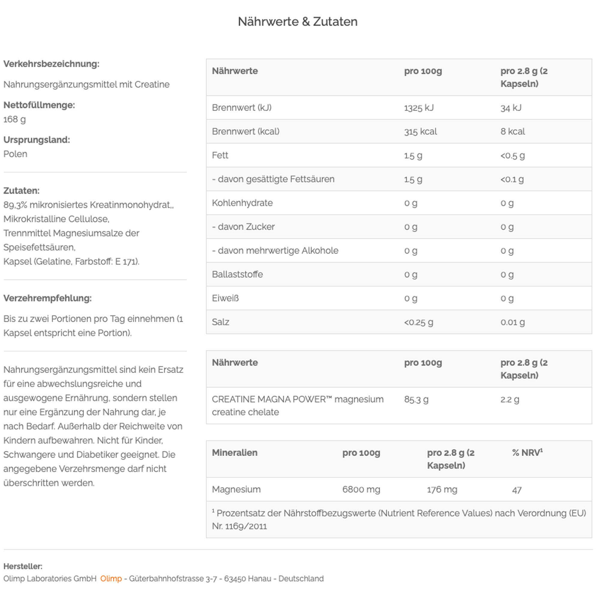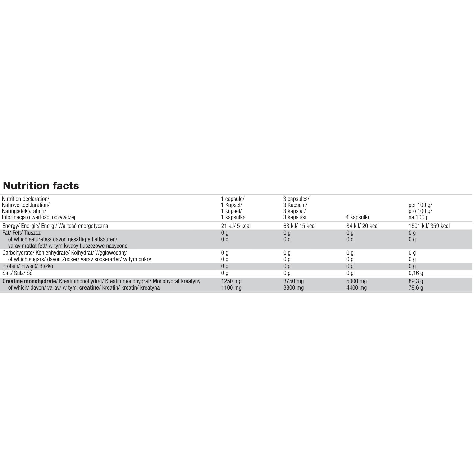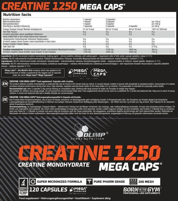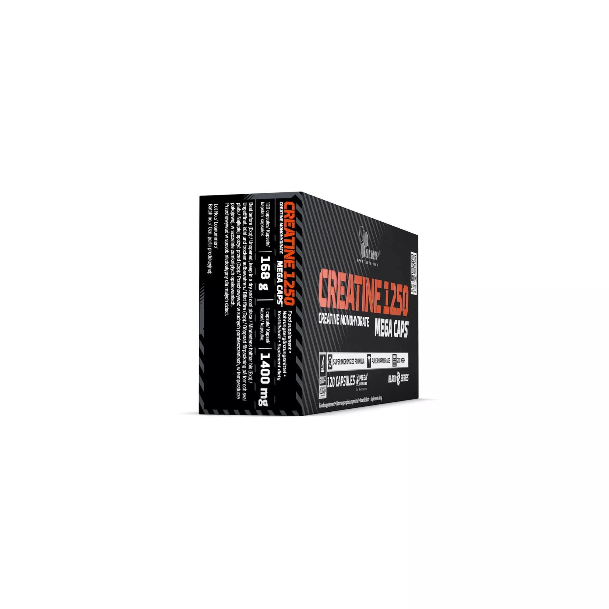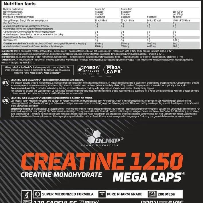 Olimp Creatine 1250 Mega Caps is a micronized creatine monohydrate delivered in Mega Caps for an optimised daily portion. Recommended for adults engaged in intense physical activity, the suggested serving of 3 capsules provides up to 3.3 g of pure creatine. Creatine supports performance during short, high-intensity exercise by contributing to the maintenance of ATP levels in skeletal muscle. The capsule format ensures a convenient, accurately dosed intake. Available in multiple pack sizes (blister 30 capsules, box 120 capsules, tub 400 capsules). Do not exceed the recommended daily dose. Keep out of reach of children.