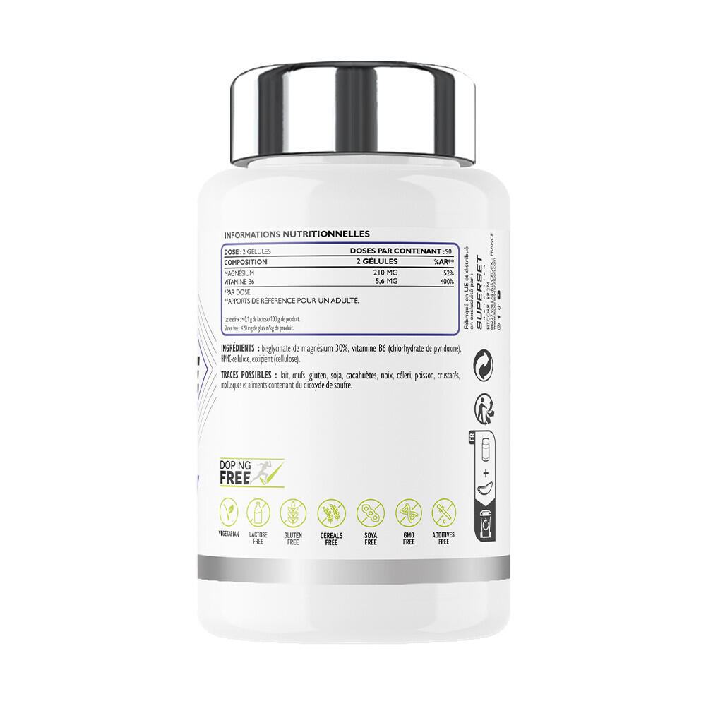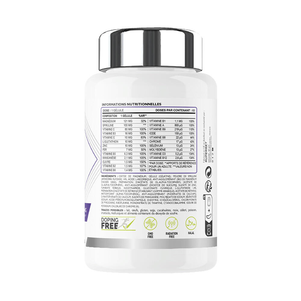 VITA MAX: Ingredients : magnesium oxide, capsule (gelatin), spirulina powder (Arthrospira platensis) 14%, L-ascorbic acid, anti-caking agent (magnesium salts of fatty acids), DL-alpha-tocopheryl acetate preparation [acétate de DL-alpha-tocophéryl, anti-agglomérant (dioxyde de silicium)], zinc sulfate, ferrous fumarate, nicotinamide, cupric gluconate, L-glutathione 1.4%, retinyl acetate preparation [stabilisant (gomme arabique), acétate de rétinyle, antioxydant (alpha-tocophérol), anti-agglomérant (phosphates de calcium)], D-calcium pantothenate, manganese sulfate, sodium molybdate, sodium selenite, pteroylmonoglutamic acid, D-biotin, cholecalciferol, pyridoxine hydrochloride, riboflavin, thiamine mononitrate, cyanocobalamin, potassium iodide, chromium(III) chloride. MAGNESIUM BISGLYCINATE: Ingredients: magnesium bisglycinate 30%, vitamin B6 (pyridoxine hydrochloride), HPMC-cellulose, excipient (cellulose). OMEGA 3 MAX: Ingredients: Fish oil 70% [56% OMÉGA-3 (28% EPA, 21% DHA)], capsule [gélatine bovine, humectant (glycérol), eau purifiée] vitamin E (dl-alpha-tocopherol).