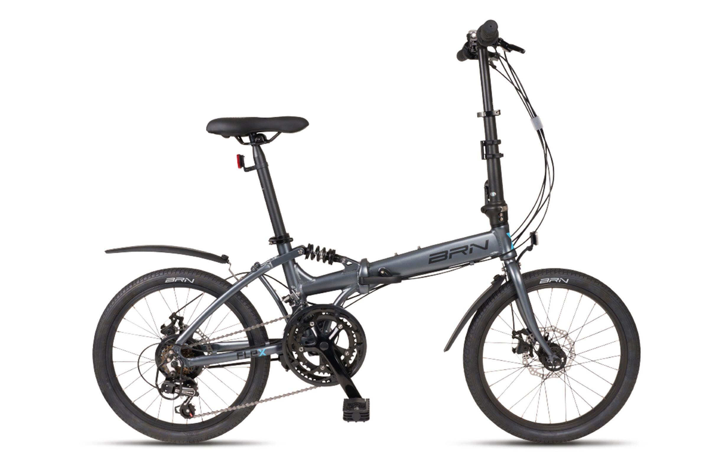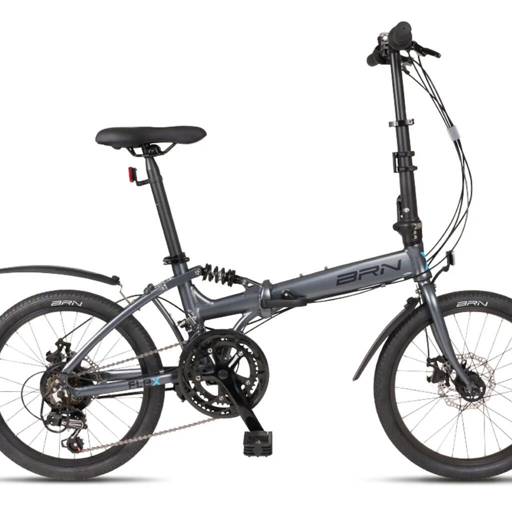 BRN Folding Bike: practical folding bike for urban commuting, easy to carry anywhere, with disc brakes, rear suspension, and included fenders.