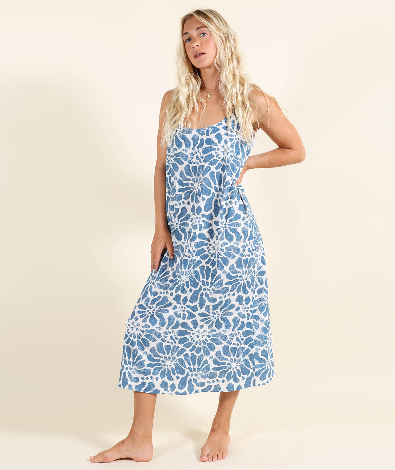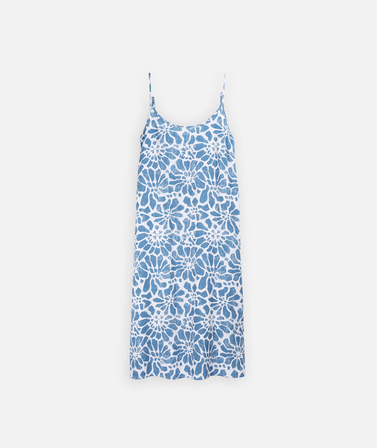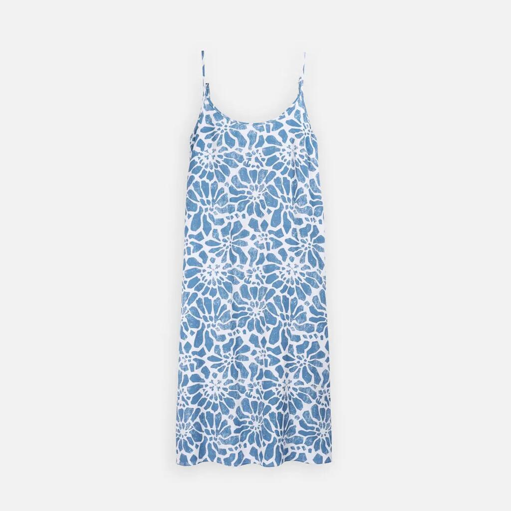 Linen/rayon printed dress with adjustable straps, Oxbow labels on back and chest.