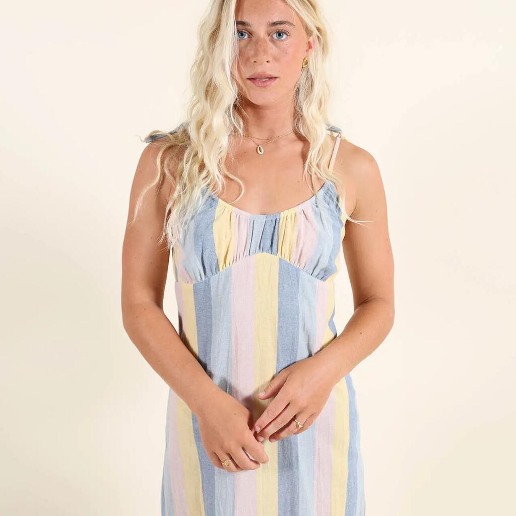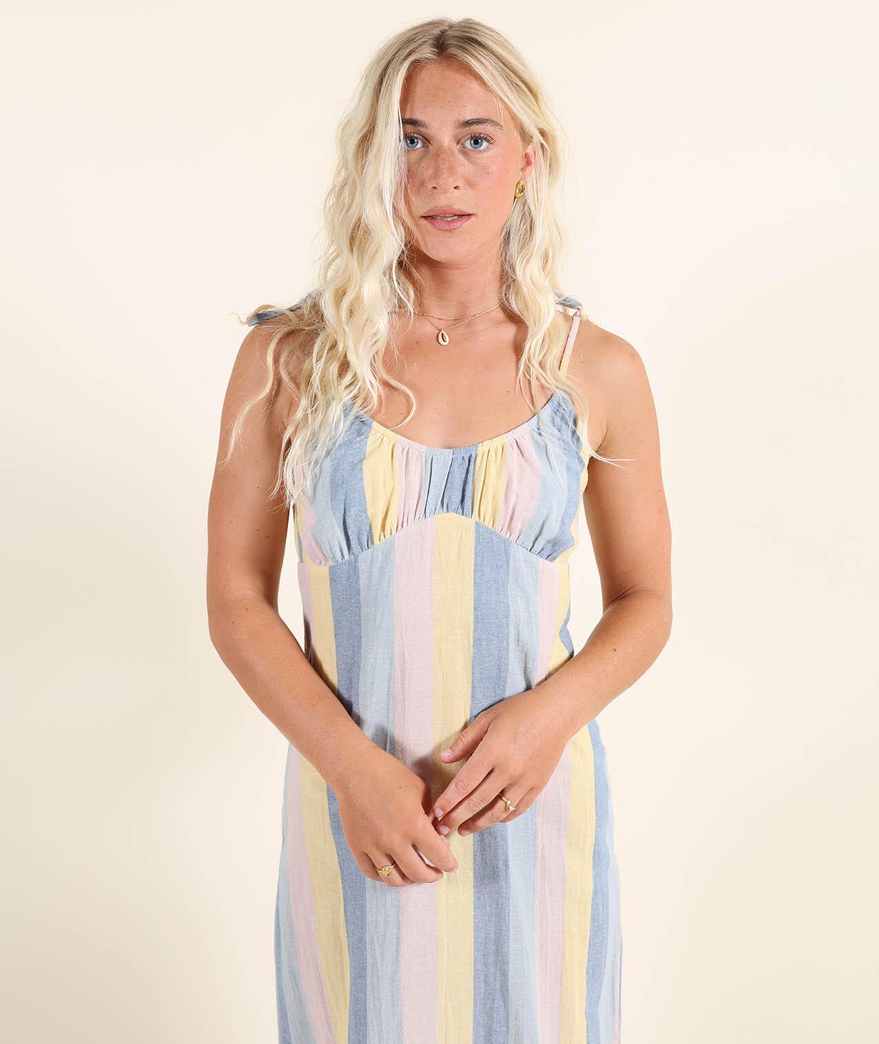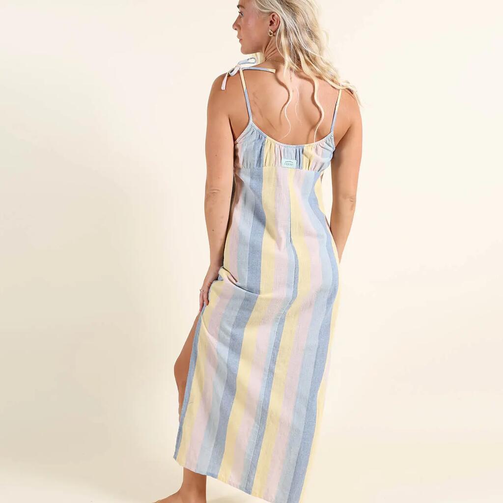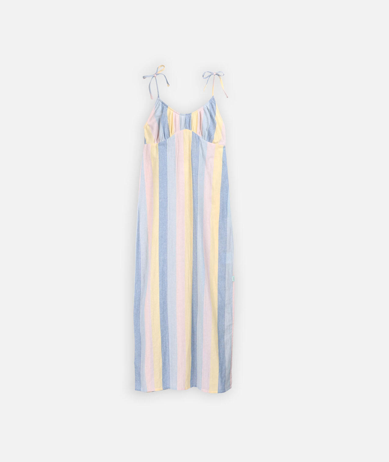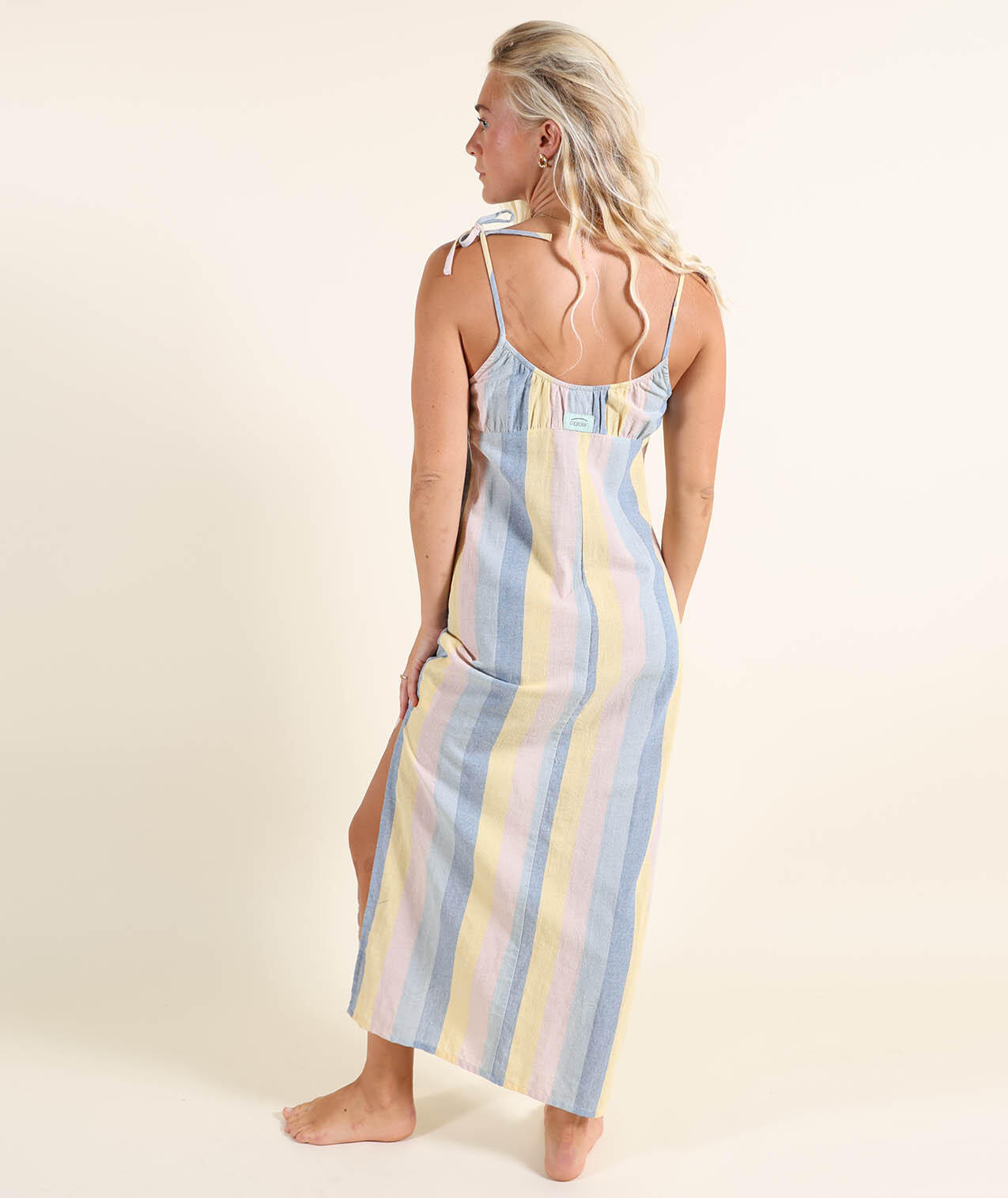 Long striped cotton chambray dress with side slit, adjustable straps.