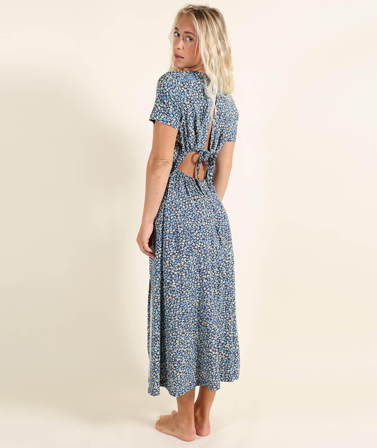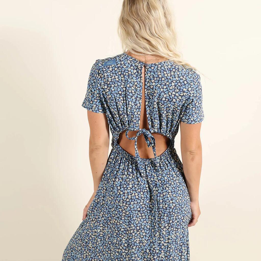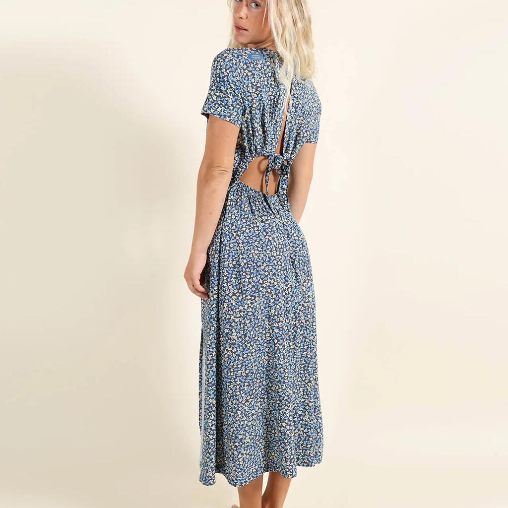 Mid-length printed viscose crepe dress, short sleeves, sewn panels, open back top and bottom, tie belt, Oxbow label on shoulder.