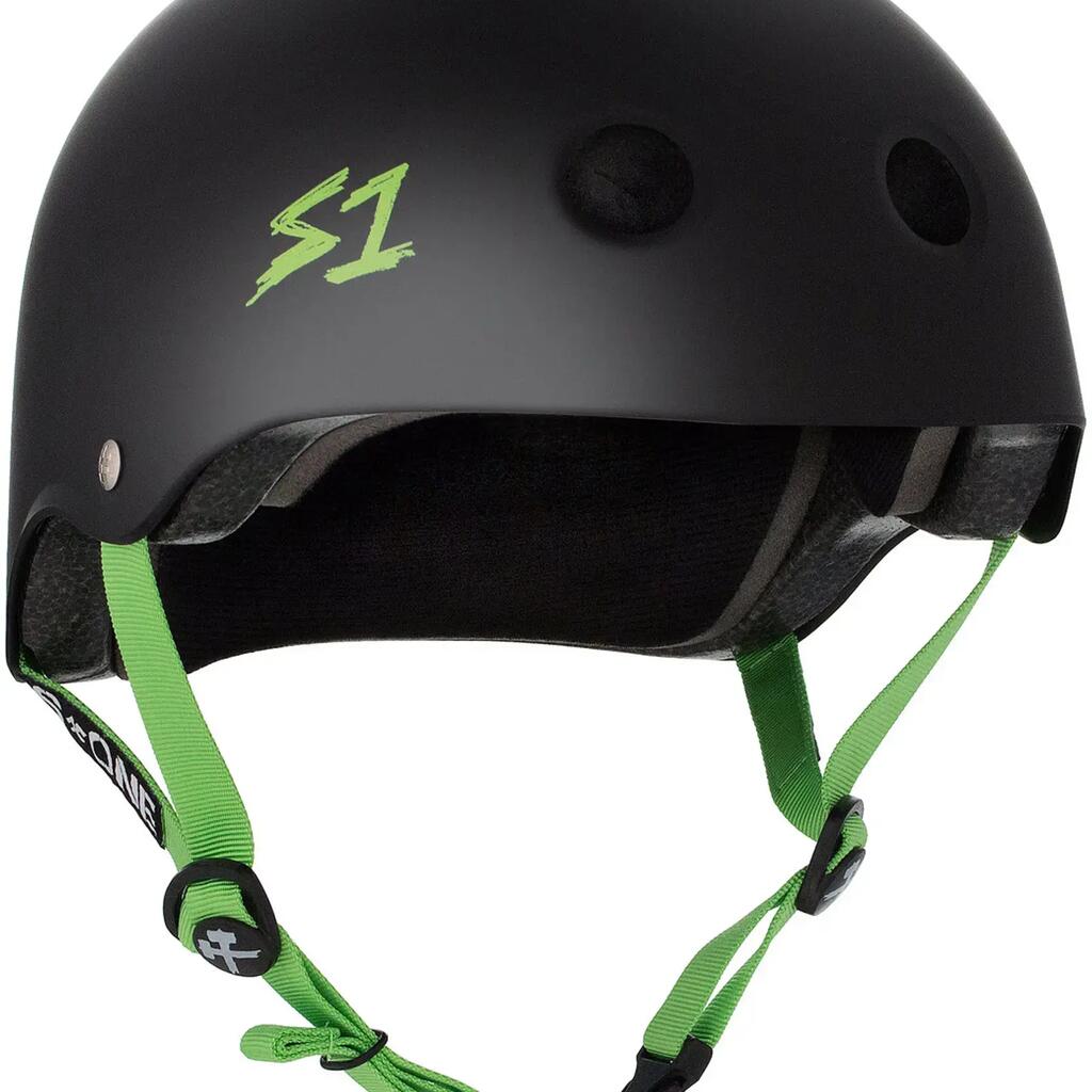The matte black S-ONE Lifer helmet with green straps provides optimal protection with its sturdy shell and stylish design. Size S, ideal for safety and style.