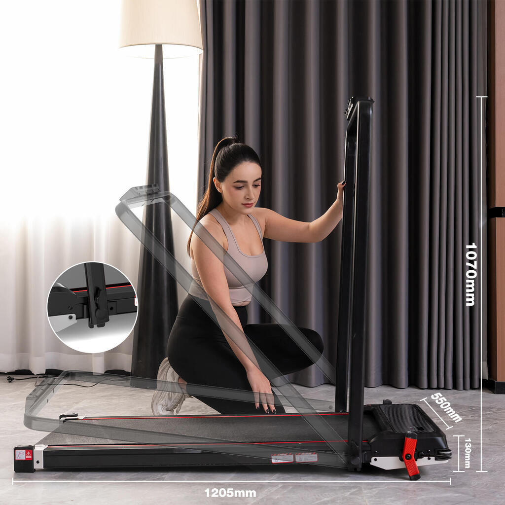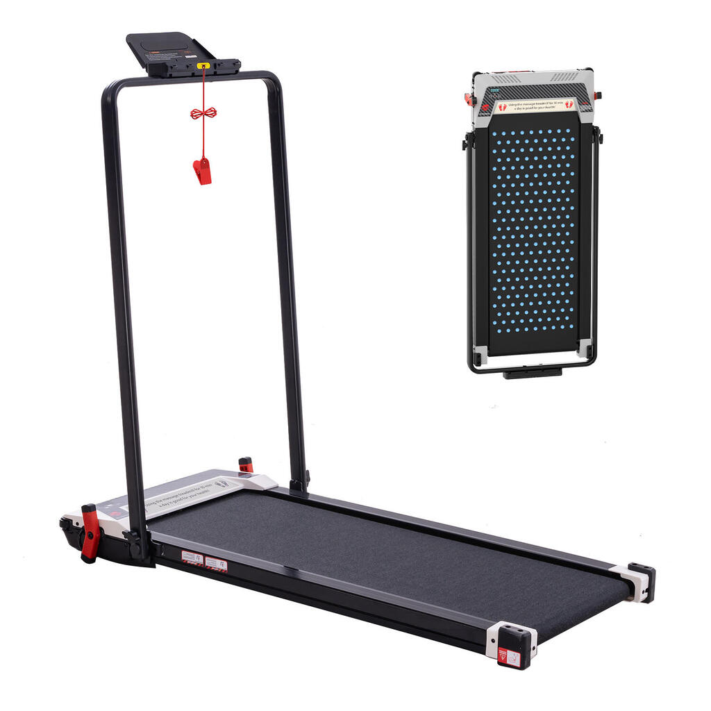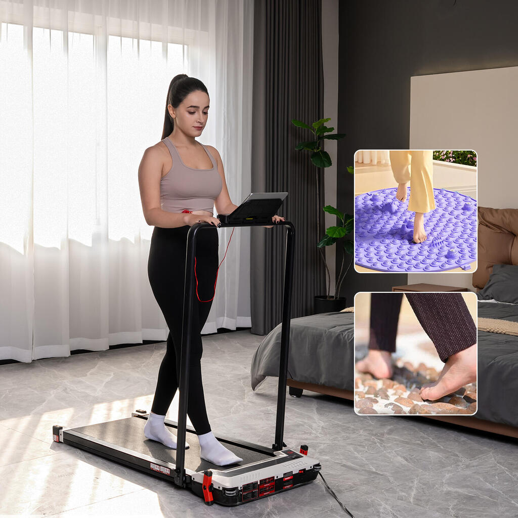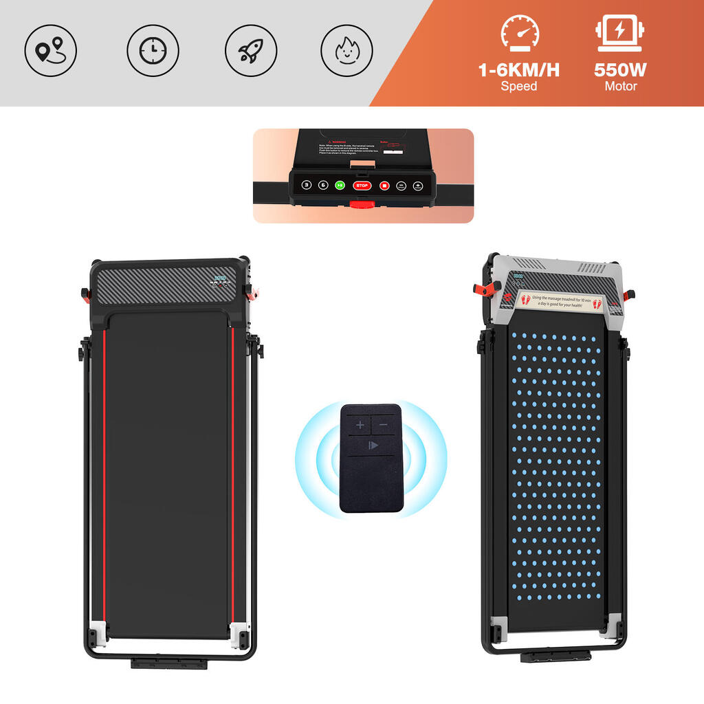 2-in-1 walking pad with 6% incline and reverse side foot massage. Speed 1-6km/h, 550W motor, dual display, and remote control. Max load 120kg.