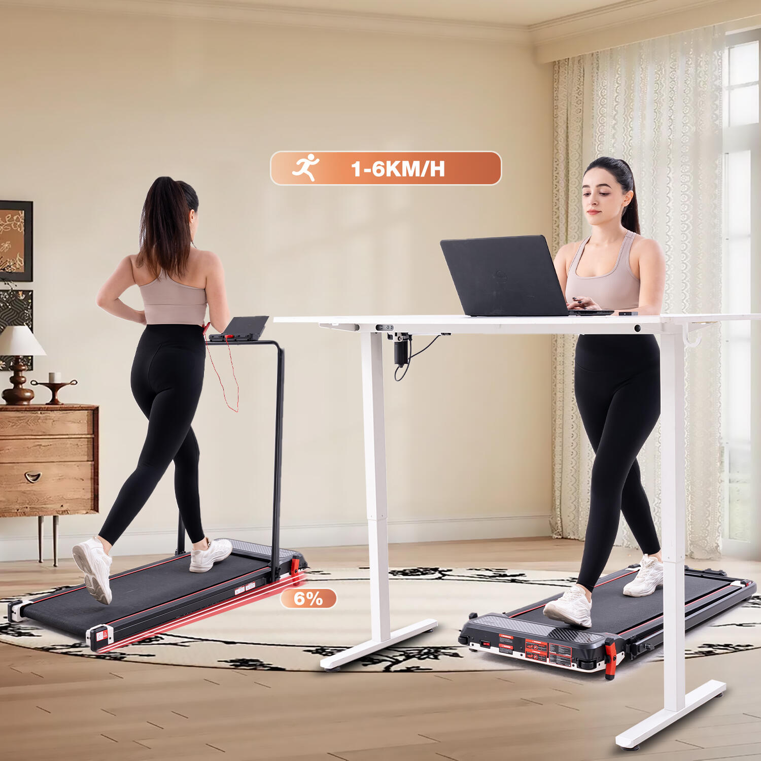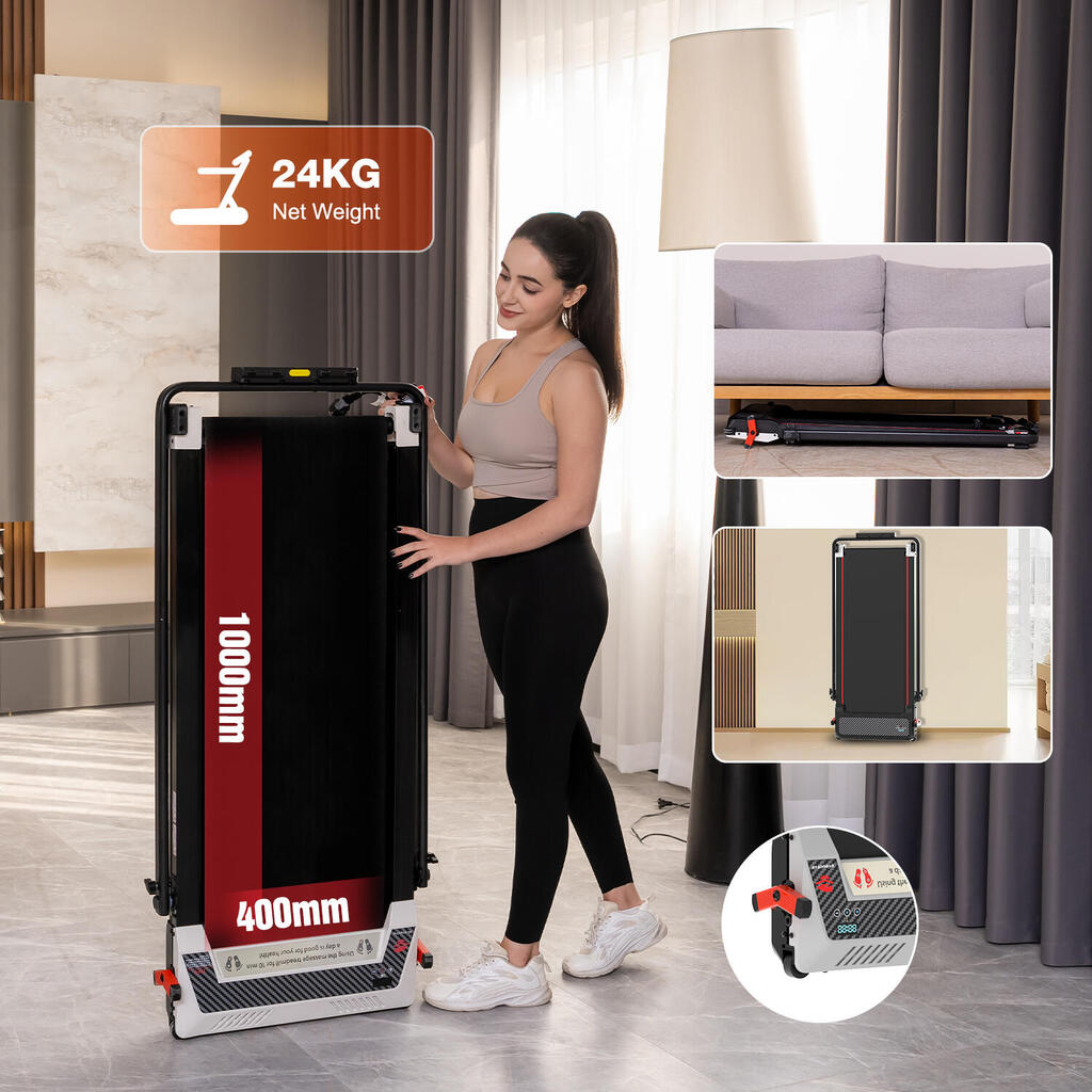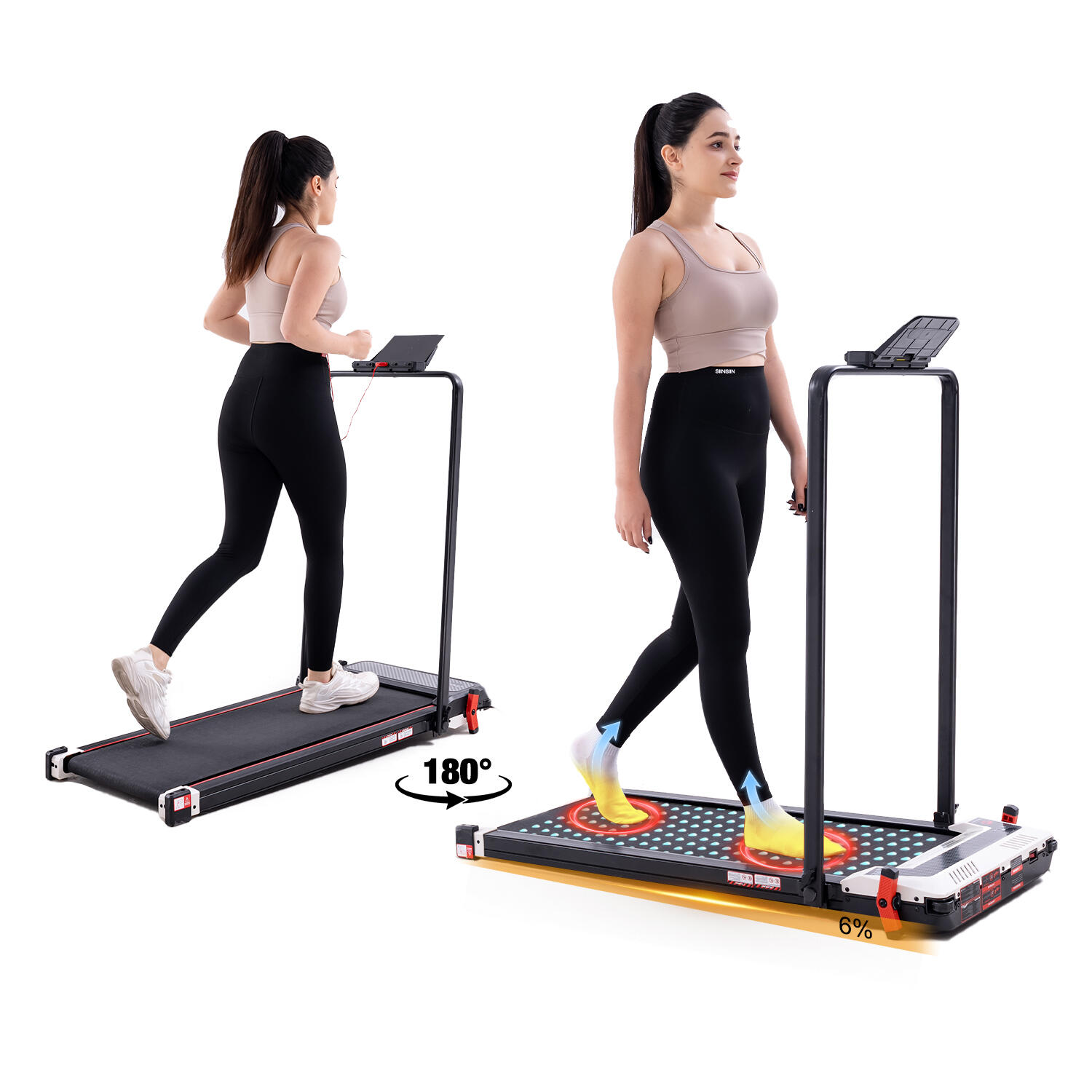2-in-1 walking pad with 6% incline and reverse side foot massage. Speed 1-6km/h, 550W motor, dual display, and remote control. Max load 120kg.